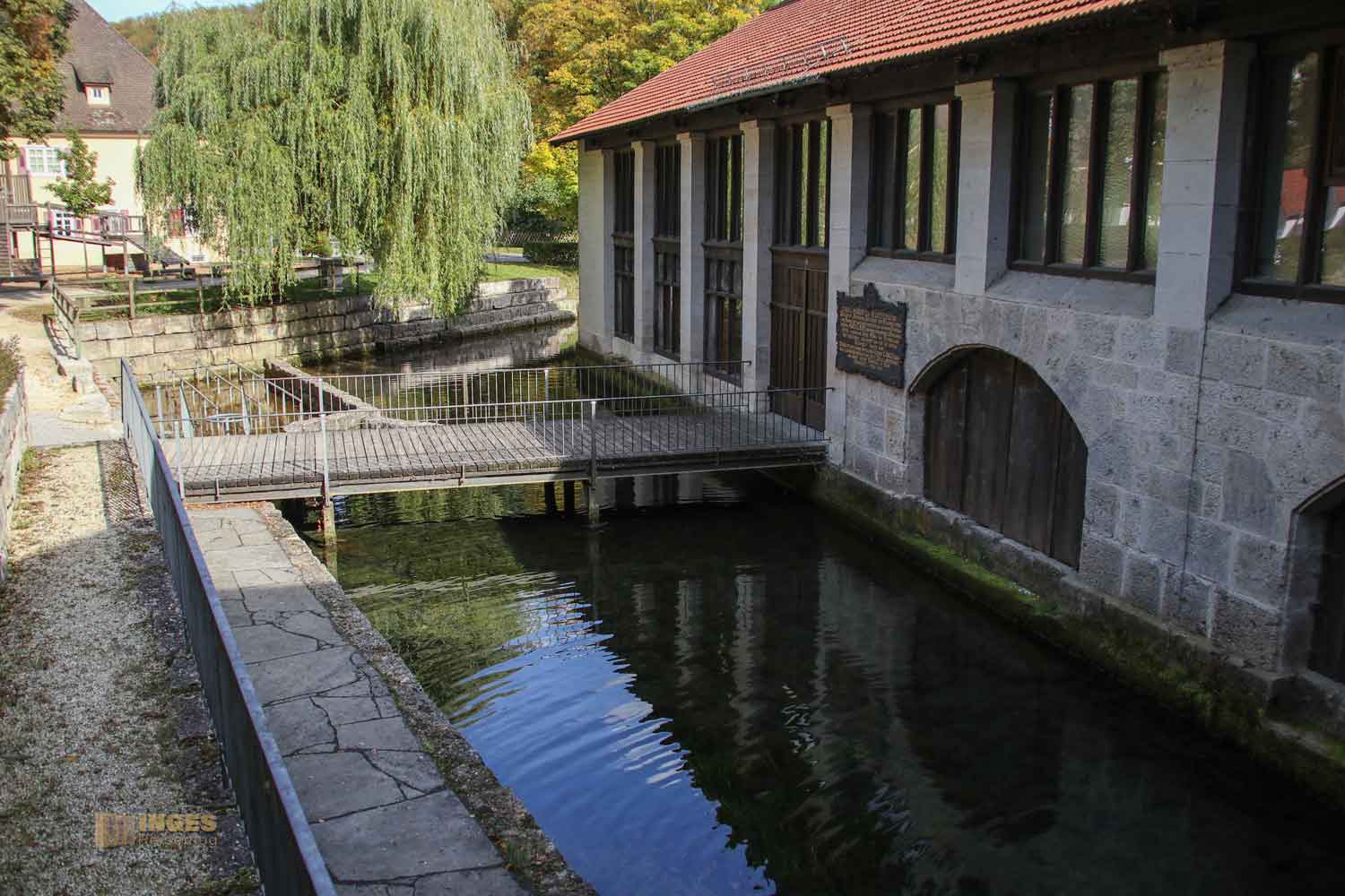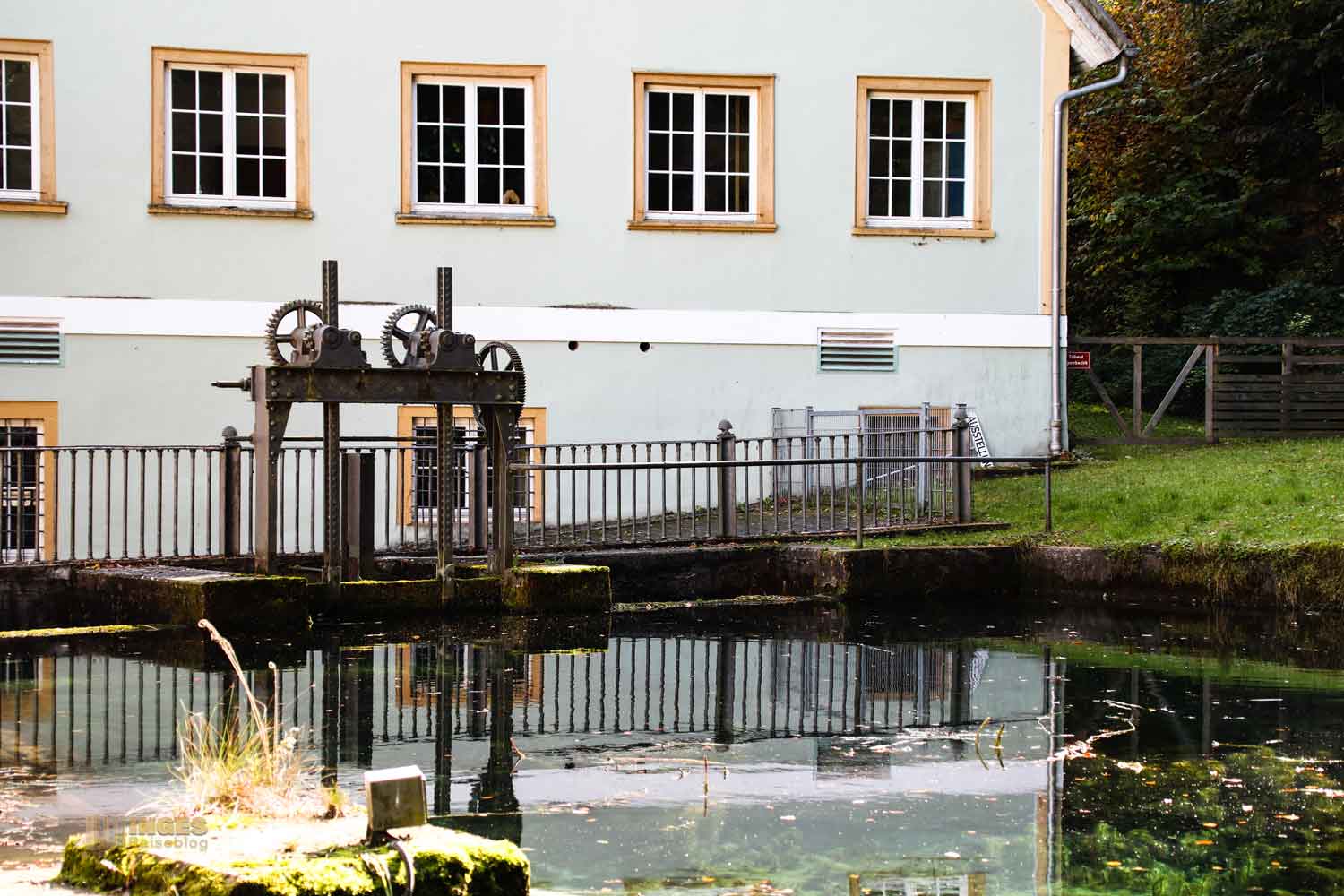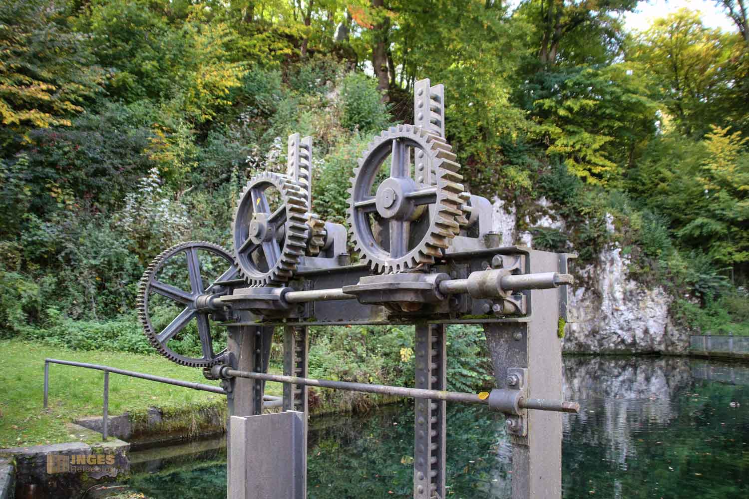 Aber wiederum an anderen Stellen drückt das Wasser eben dann doch an die Oberfläche, so wie hier am Brenztopf. Wie sich der Wasserlauf von zig Millionen Jahren verändert hat, das ist anschaulich am Brenzursprung auf einer Tafel dokumentiert. Der ca. 4 Meter tiefe Quellsee wird hier auf eine Länge von gut 42 Meter und einer Breite mit knapp 20 Metern aufgestaut. Schließlich sollte das Wasser dem Hüttenwerk hilfreiche Dienste leisten. Aber nicht nur dem, wie ihr später noch erfahrt. Ganzjährig beträgt die Wassertemperatur 7°.