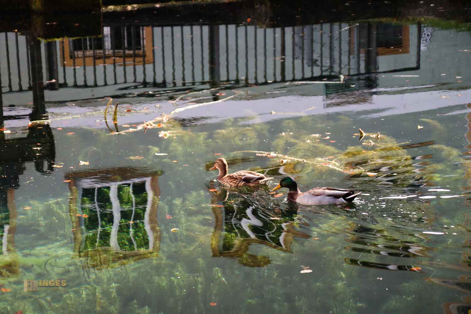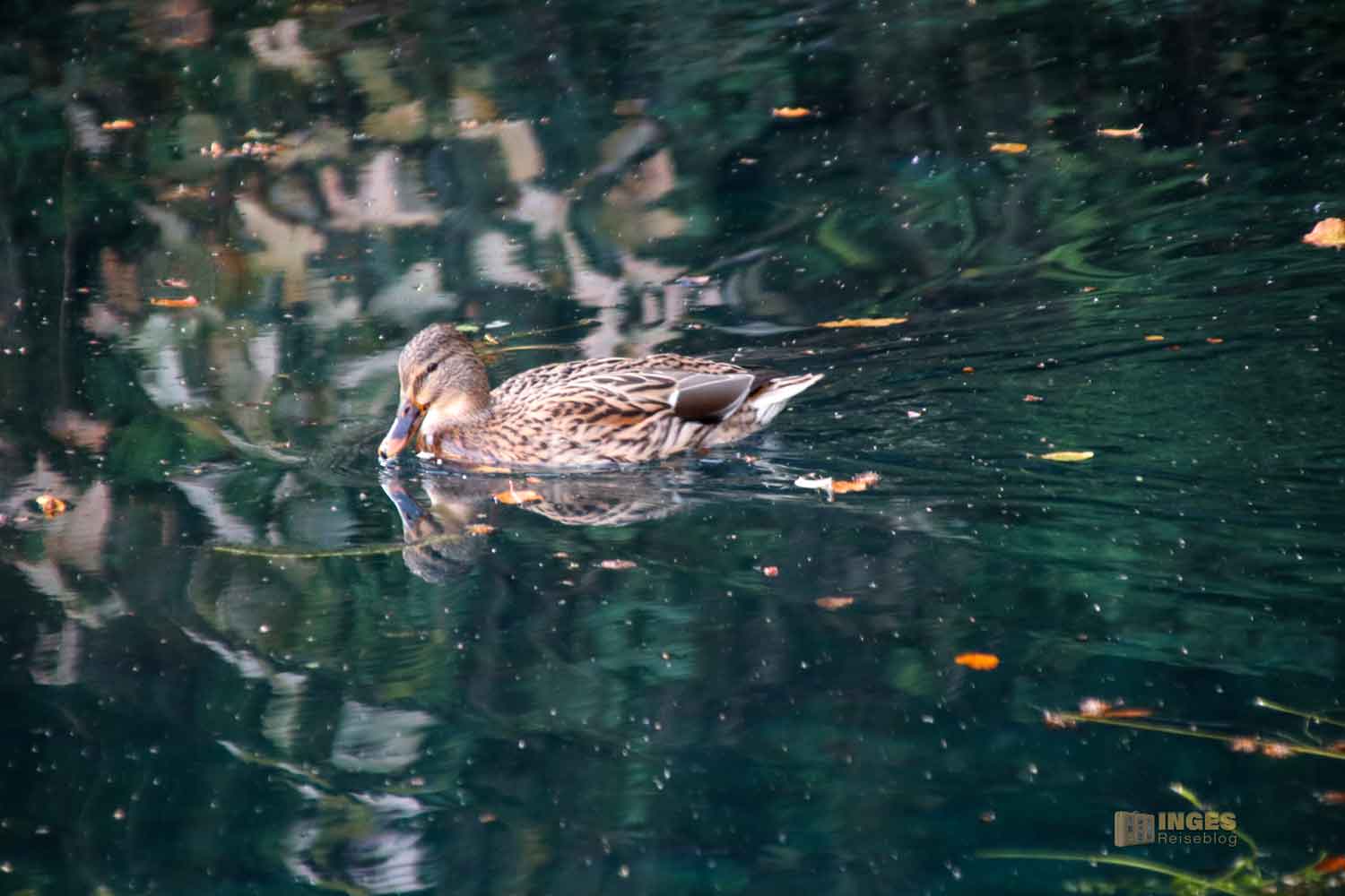 Und warum ist das Wasser blau? Da ist die Sonne mit schuld dran, und ich kann das nur sehr 'laienhaft' so erklären: Wasser kann ab einer bestimmten Tiefe, blaue Anteile des Sonnenlichts streuen, die gelben und rote Anteile aber verschlucken. Ist das Wasser dazu noch so klar wie hier am Brenztopf und hat einen hohen Kalkgehalt, wird dieser Effekt noch verstärkt und das Wasser leuchtet blau.