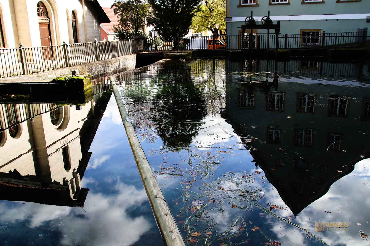 Tja, und vor diesem prachtvollen Gebäude hatte ich dann ein fototechnisches Problem. Ihr kennt mich ja vermutlich mitterweile - egal wo ich fotografiere, ich möchte kein schmückendes Beiwerk in Form von Menschen haben. Ich habe meistens die Geduld und kann warten bis ich freie Sicht habe. Aber genau vor dieser schönen Kulisse parkte ein Fahrzeug mit einem riesengroßen Firmenaufdruck. Grmpf! Mir war bewusst, dass selbst Photoshop in diesem Fall versagen würde. Deshalb bekommt ihr eben jetzt nur die obere Hälfte des Rathauses von Königsbronn 😀 Die untere Hälfte müsst ihr euch vor Ort selbst anschauen.