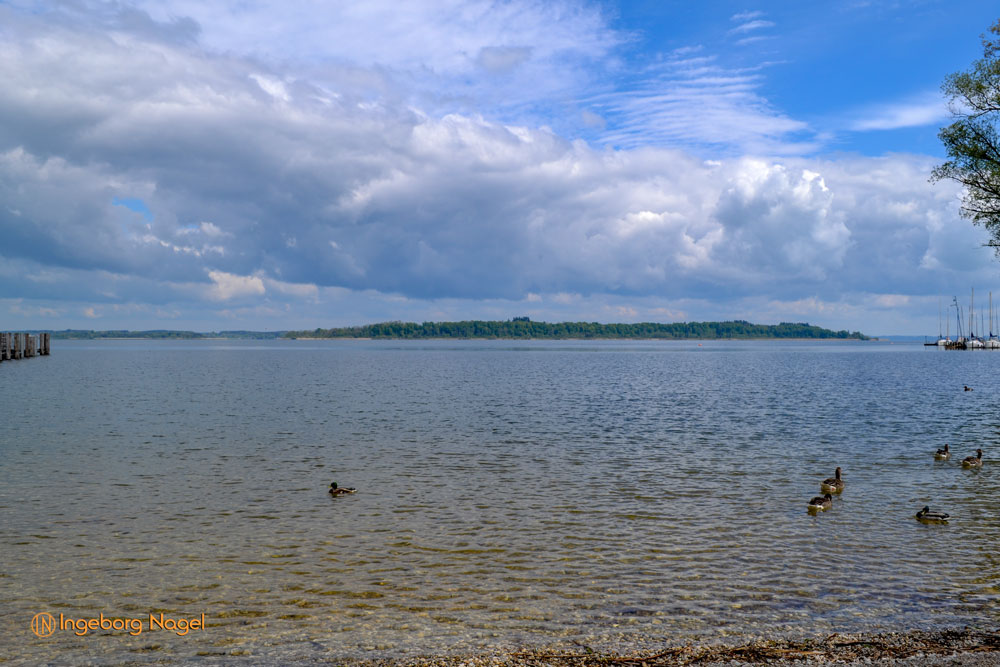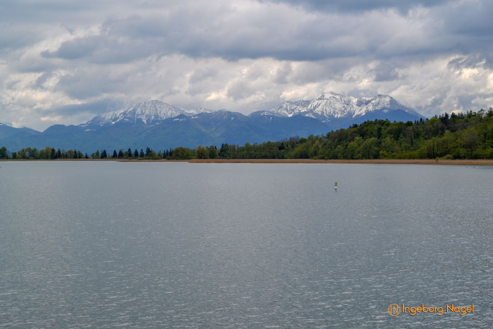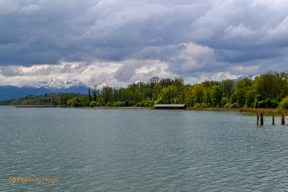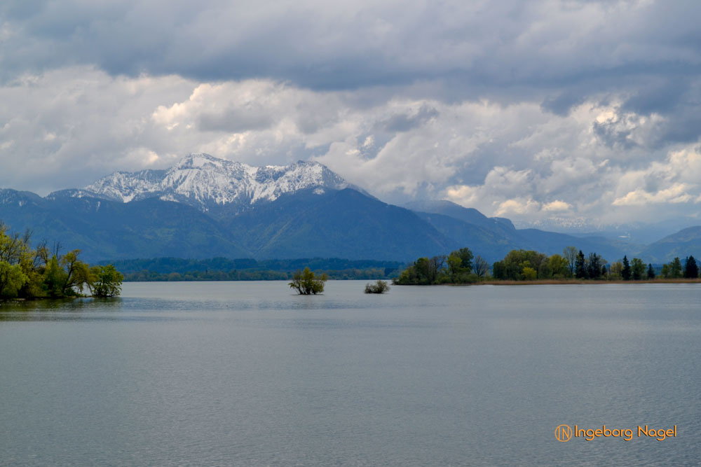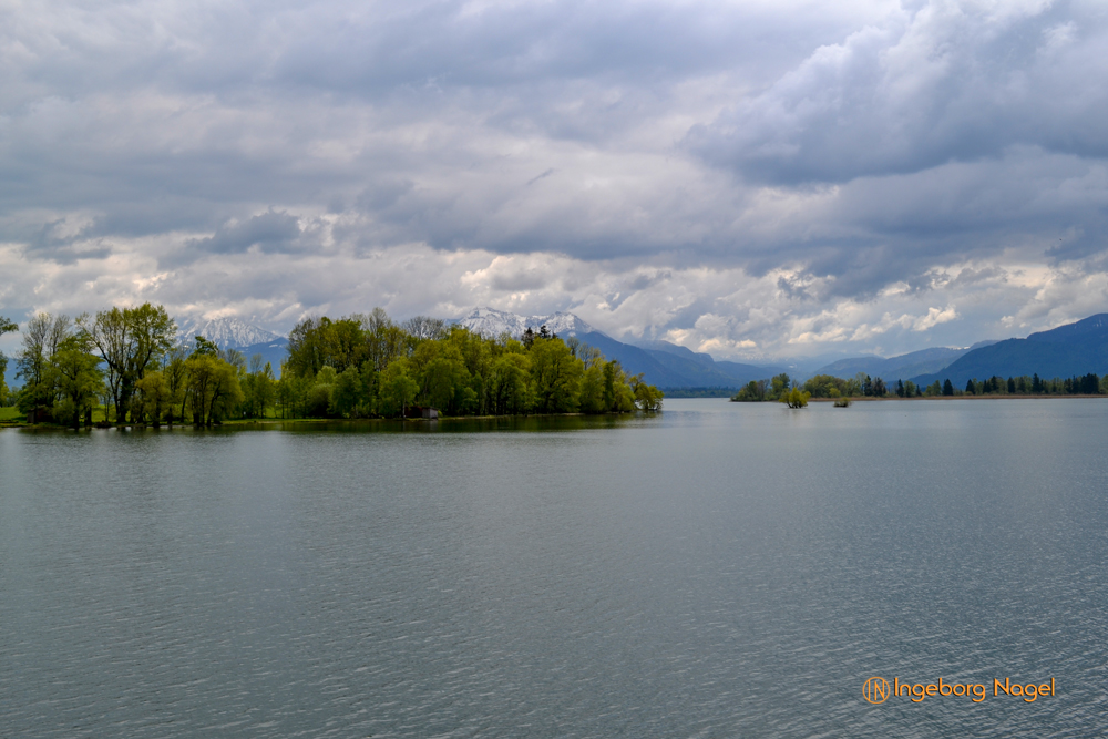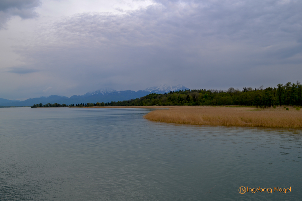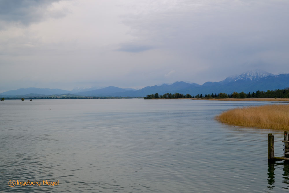 Entstanden ist der Chiemsee gegen Ende der Eiszeit vor ca. 10.000 Jahren. Der größte Teil des Ufers ist Natur pur - Wiesen und Moore bis ans Wasser. Immer wieder schön wenn man auf der A8 direkt am See vorbei fährt. Bei schönem Wetter tummeln sich unzählige Segelboote auf dem See, es wimmelt förmlich von weißen Segeln. Bei unserem Besuch war es eher wolkenverhangen nach zwei intensiven Regentagen. Aber wir hatten Glück und benötigten keinen Regenschirm. Ach ja, der wäre ja eh im Auto gewesen 🙂