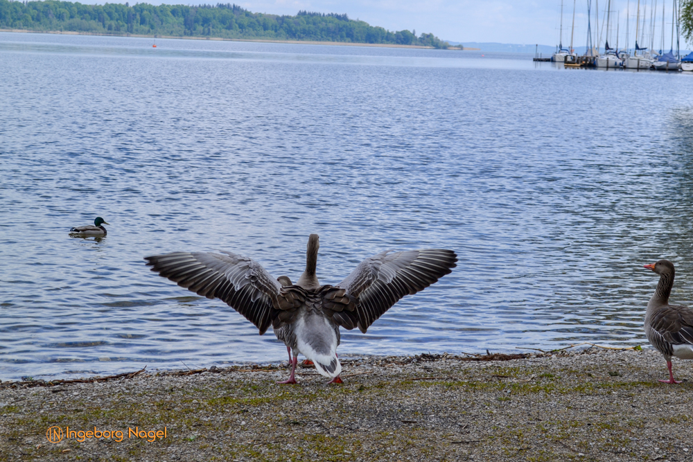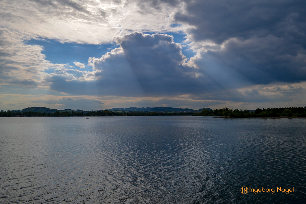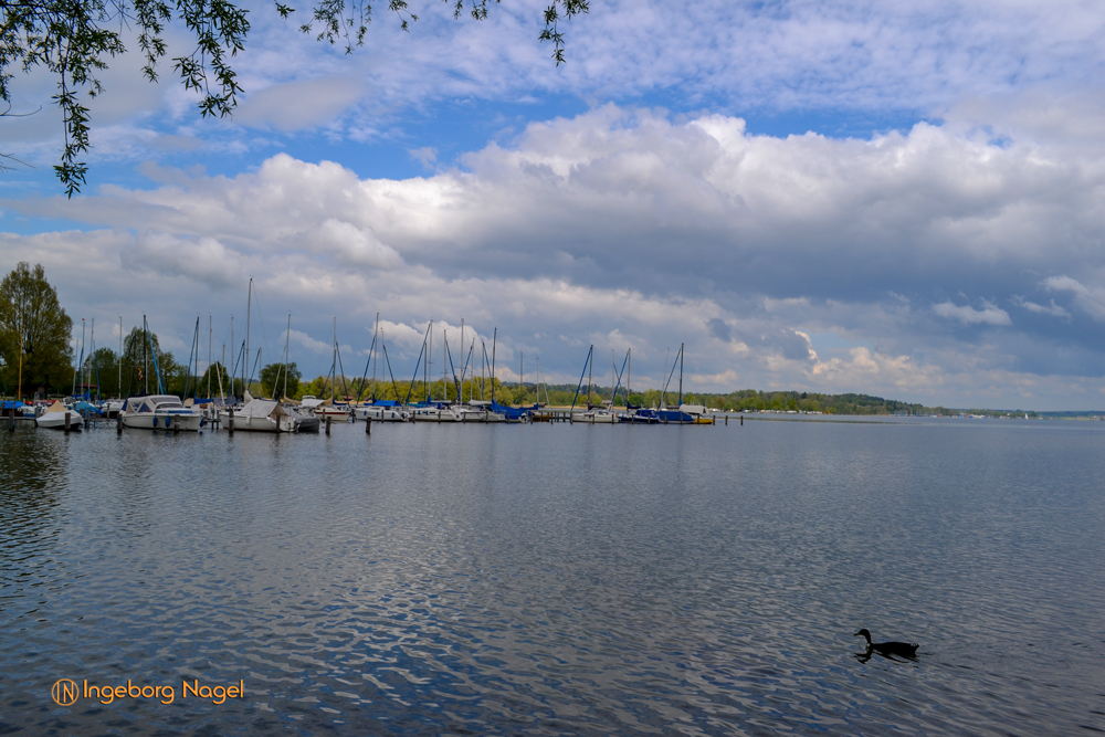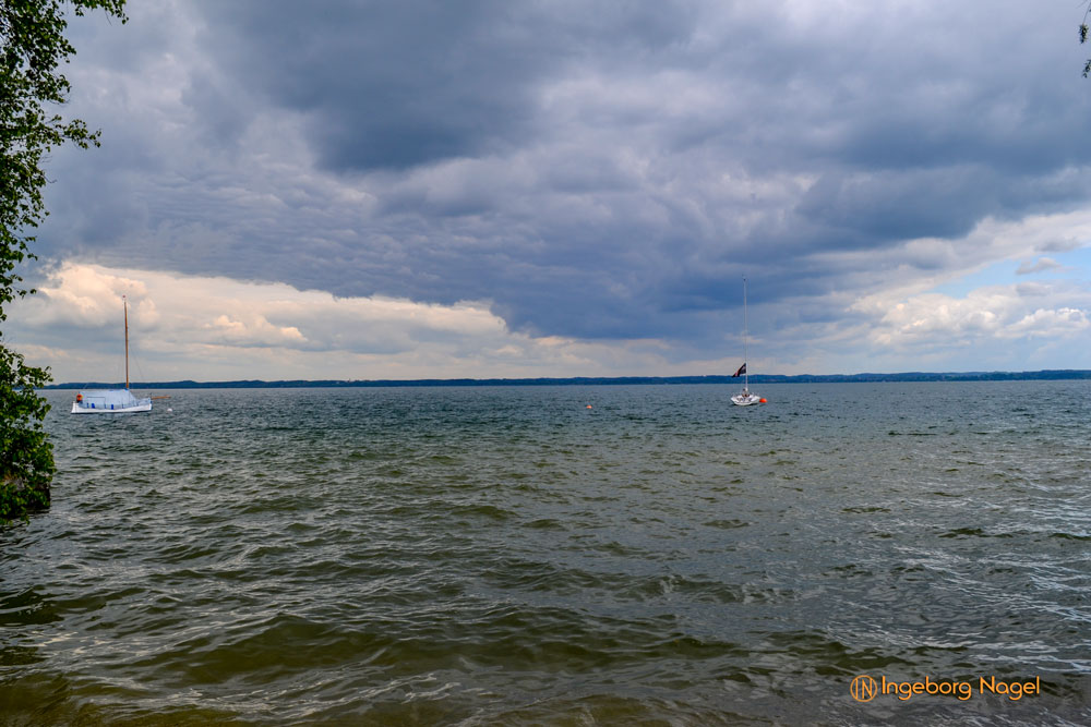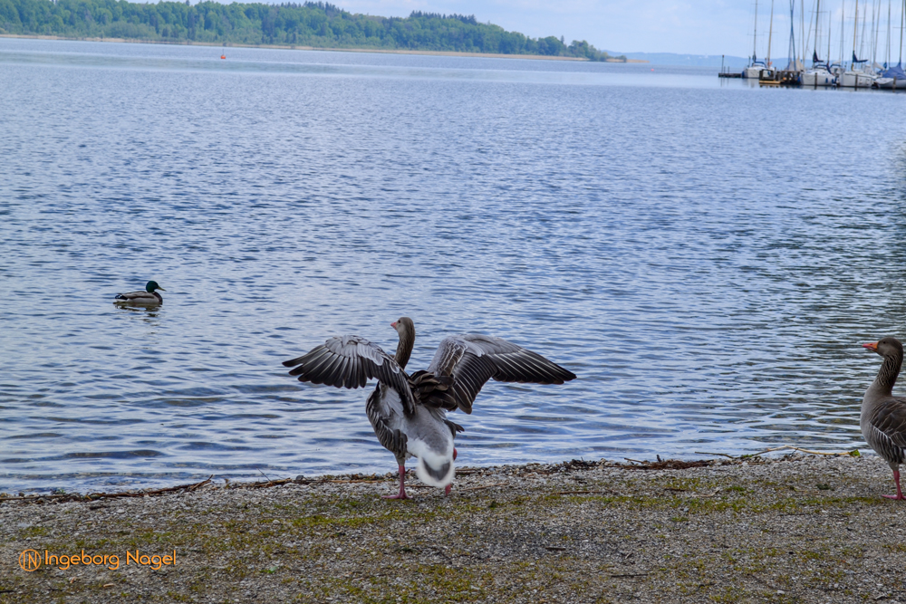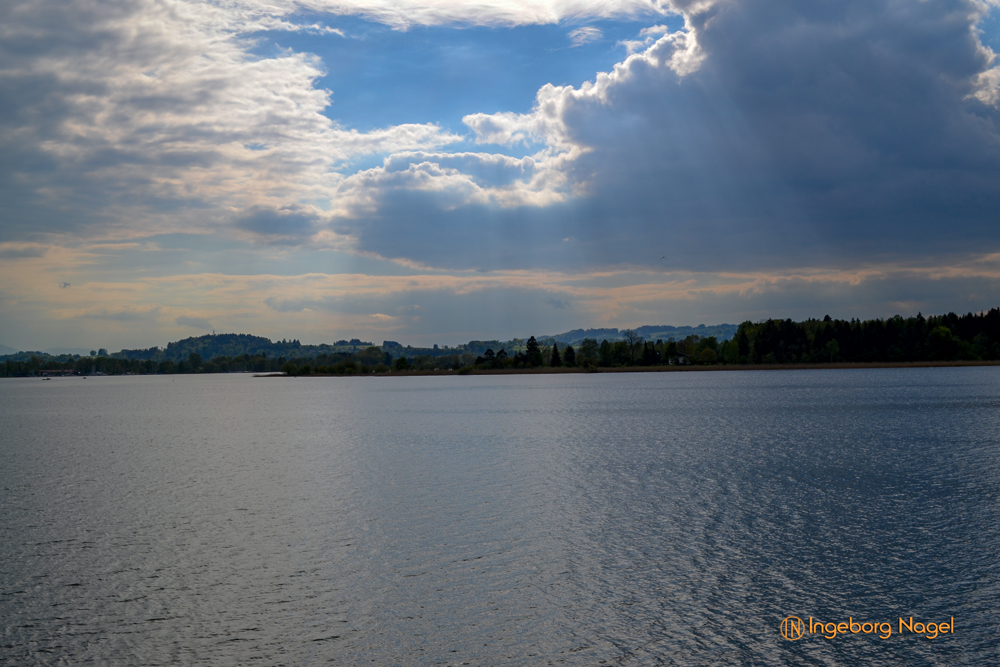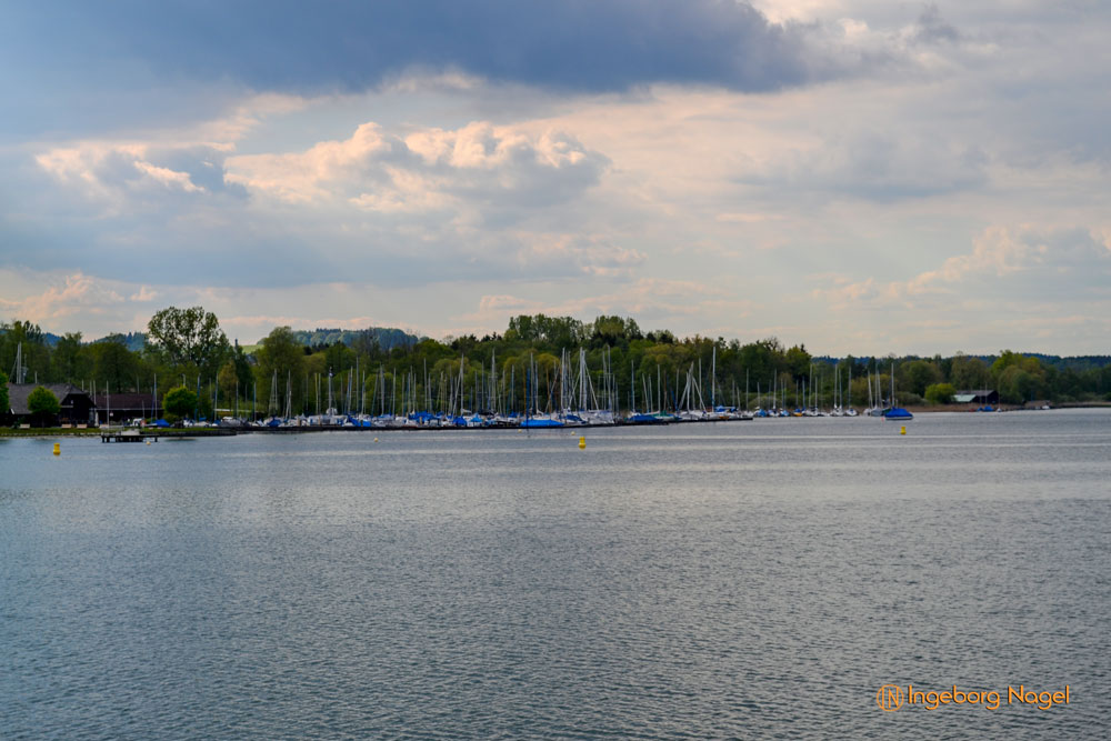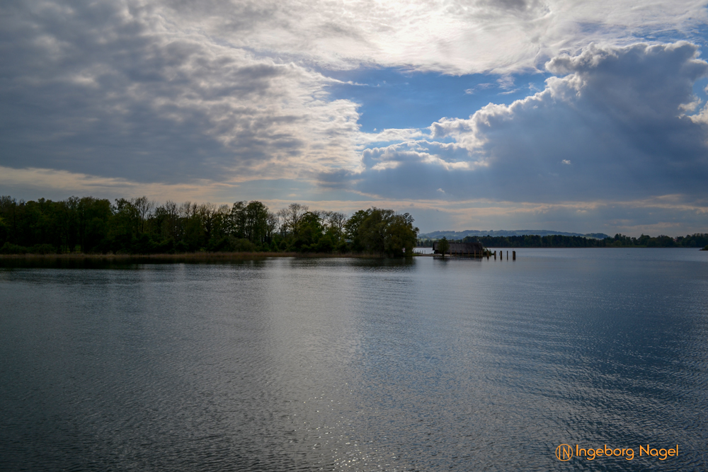Entstanden ist der Chiemsee gegen Ende der Eiszeit vor ca. 10.000 Jahren. Der größte Teil des Ufers ist Natur pur - Wiesen und Moore bis ans Wasser. Immer wieder schön wenn man auf der A8 direkt am See vorbei fährt. Bei schönem Wetter tummeln sich unzählige Segelboote auf dem See, es wimmelt förmlich von weißen Segeln. Bei unserem Besuch war es eher wolkenverhangen nach zwei intensiven Regentagen. Aber wir hatten Glück und benötigten keinen Regenschirm. Ach ja, der wäre ja eh im Auto gewesen 🙂