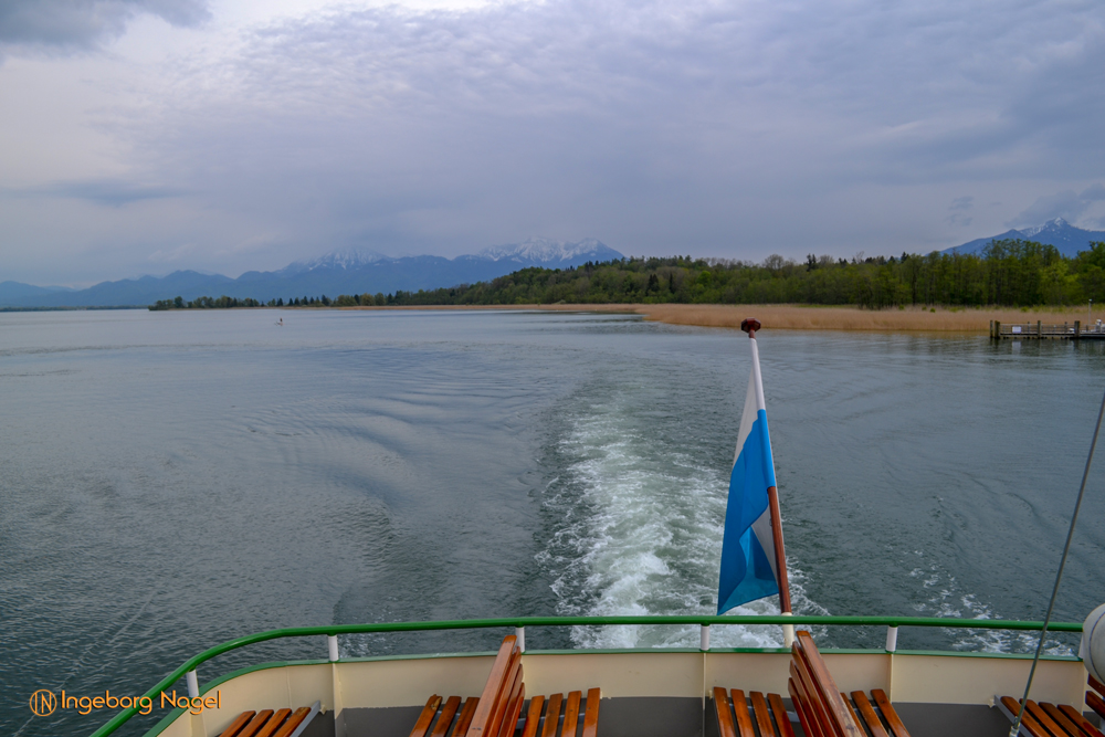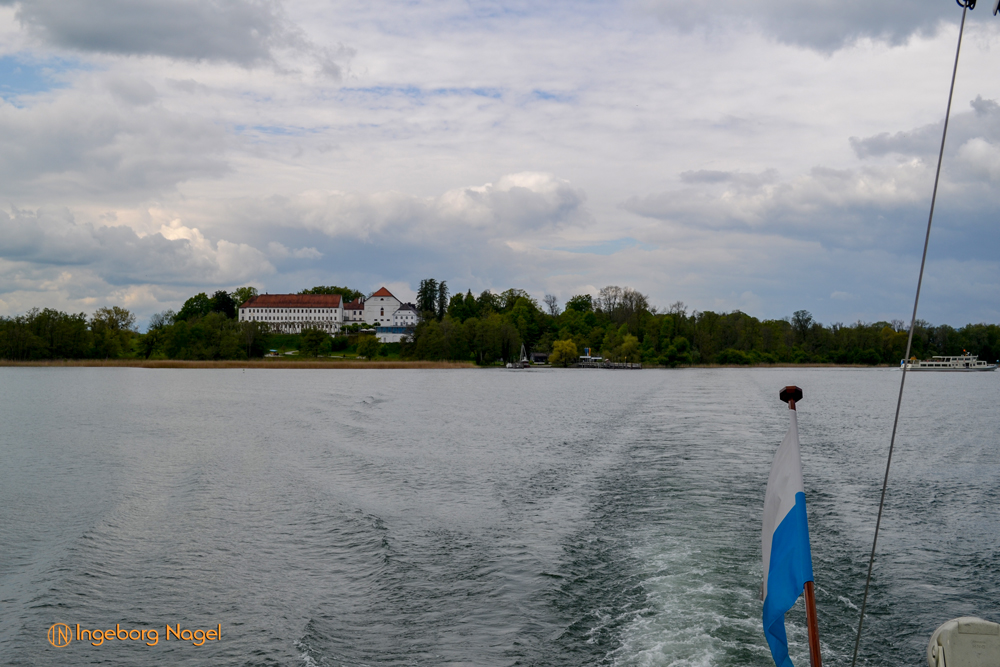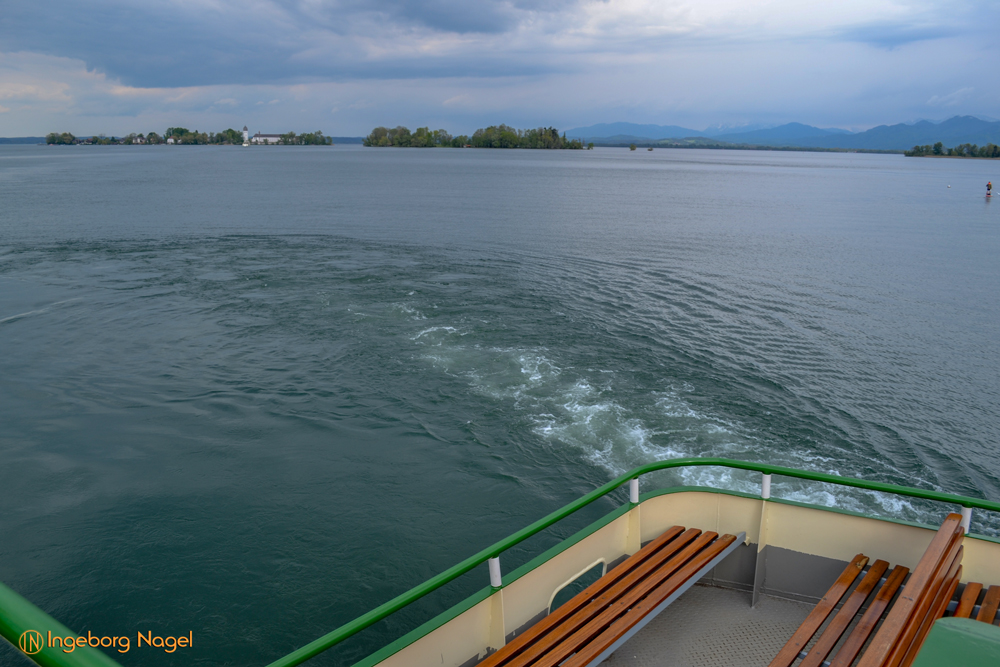 Nach der Abfahrt von der Fraueninsel ein Blick zurück. Die kleine Insel rechts neben der Fraueninsel ist die Krautinsel.