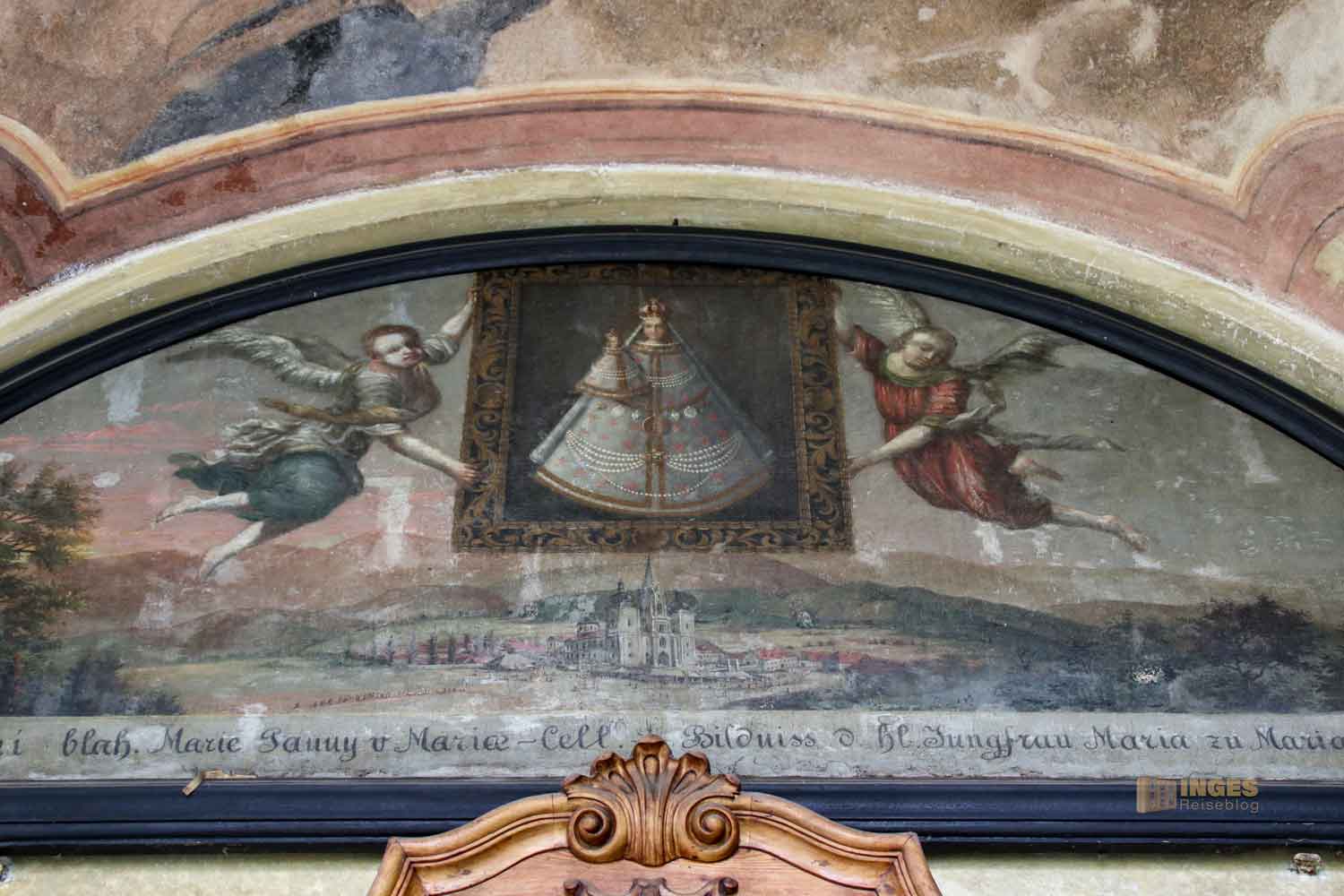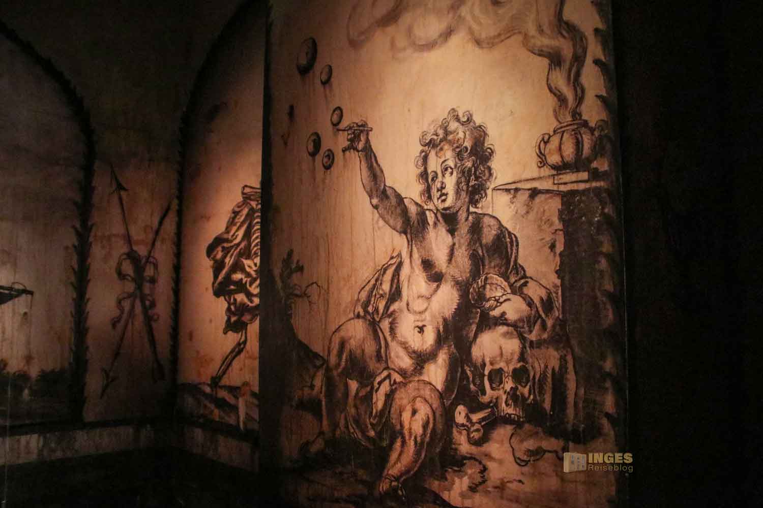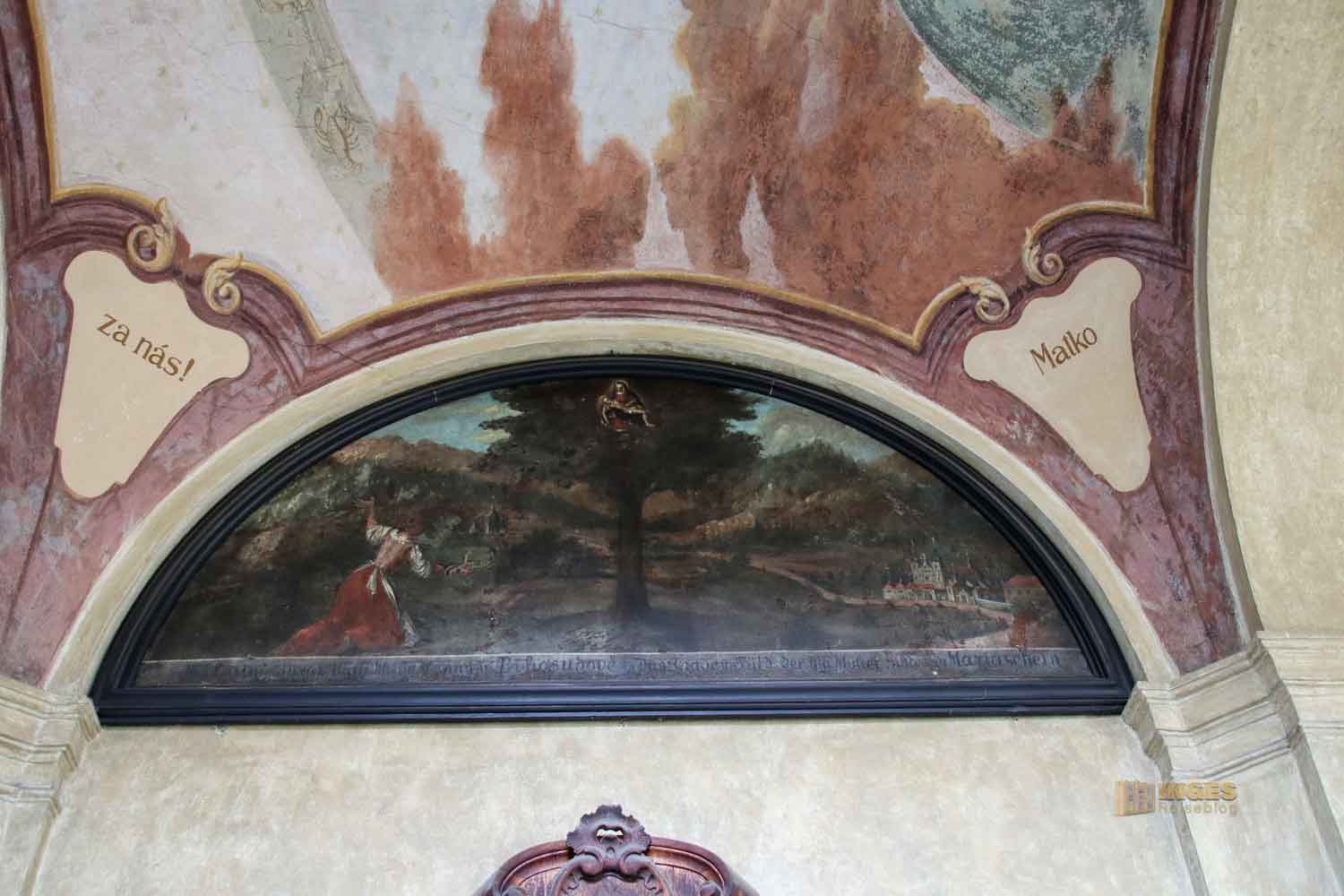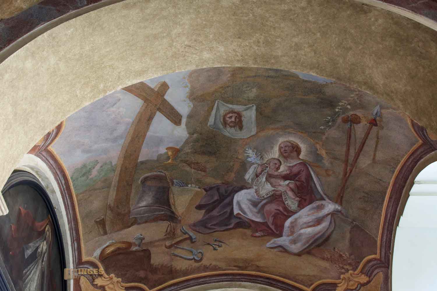 die in diesem Fall ausnahmsweise im ersten Stock als Ausstellungsteil zu sehen ist. Denn als man die Krypta, die die Gräfin von Kolowrat für die Wohltäter des Wallfahrtortes als letzten Ruheplatz in Auftrag gegeben hatte, fand, war sie seit 230 ungeöffnet. Dort zeigten sich barocke Wandgemälde, die von etwa 1664 stammen mussten. Alle Wände und das Gewölbe sind komplett mit diesen Schwarz-Grau Gemälden bedeckt. Zum Schutz dieses Schatzes, wurde die Krypta in den Ausstellungsräumen nachgestellt.