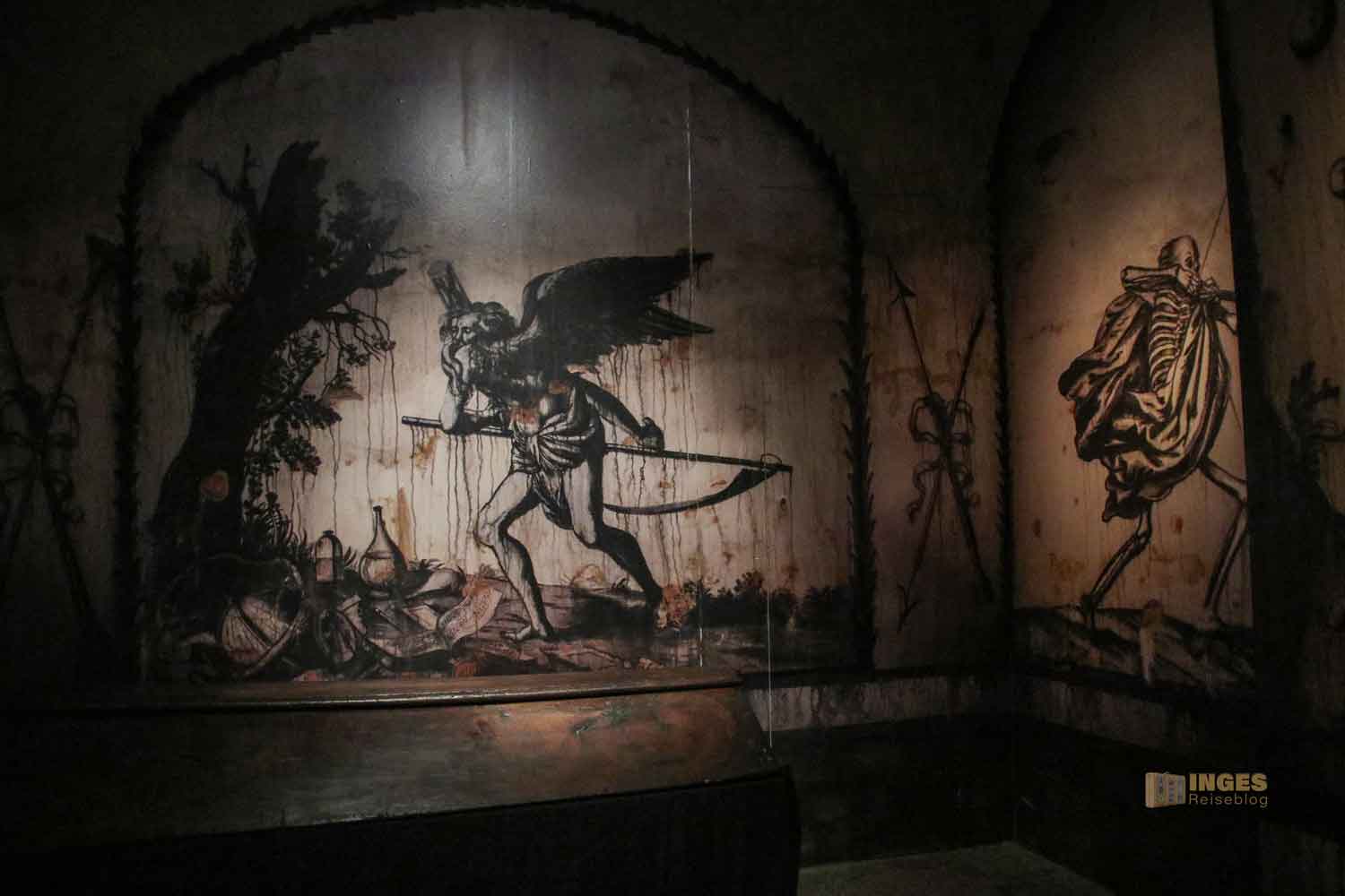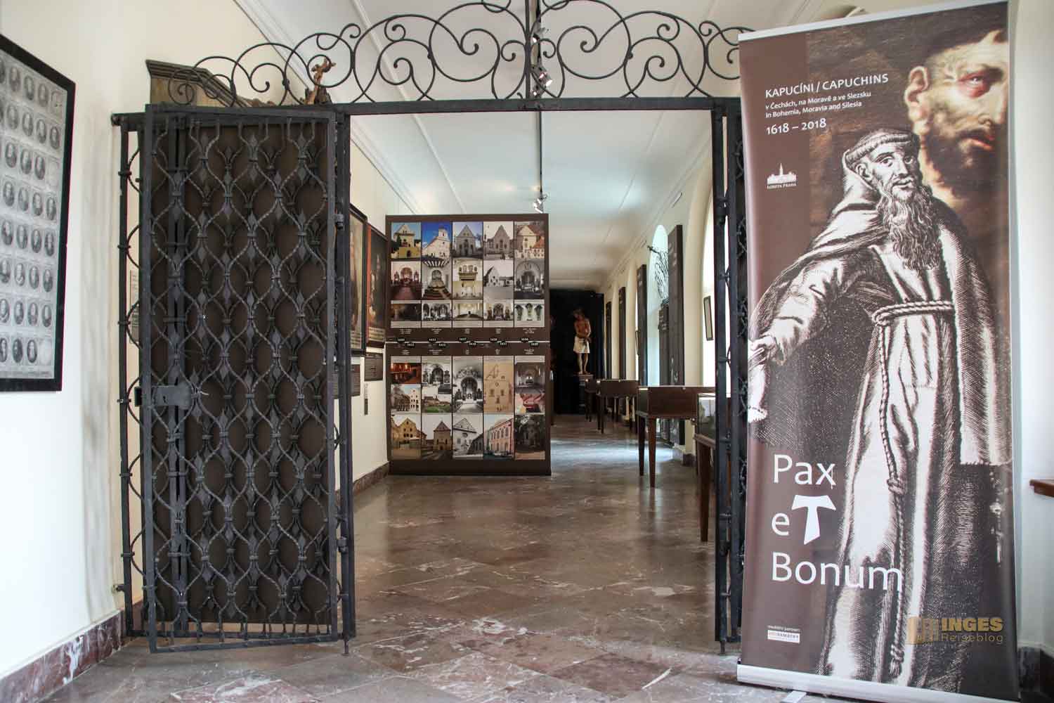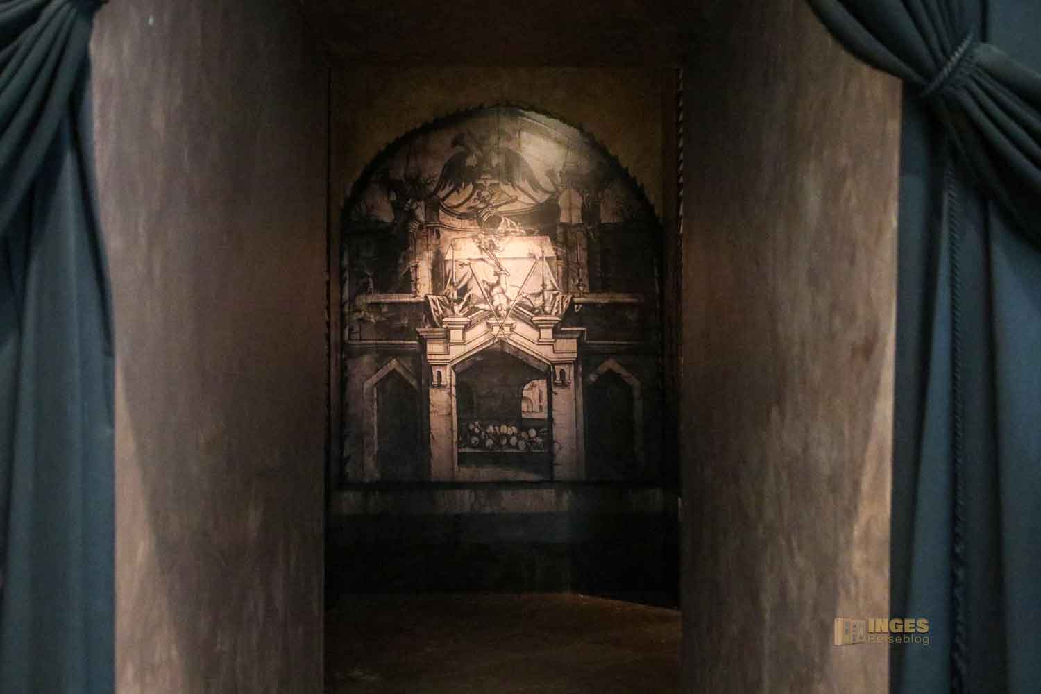 die in diesem Fall ausnahmsweise im ersten Stock als Ausstellungsteil zu sehen ist. Denn als man die Krypta, die die Gräfin von Kolowrat für die Wohltäter des Wallfahrtortes als letzten Ruheplatz in Auftrag gegeben hatte, fand, war sie seit 230 ungeöffnet. Dort zeigten sich barocke Wandgemälde, die von etwa 1664 stammen mussten. Alle Wände und das Gewölbe sind komplett mit diesen Schwarz-Grau Gemälden bedeckt. Zum Schutz dieses Schatzes, wurde die Krypta in den Ausstellungsräumen nachgestellt.