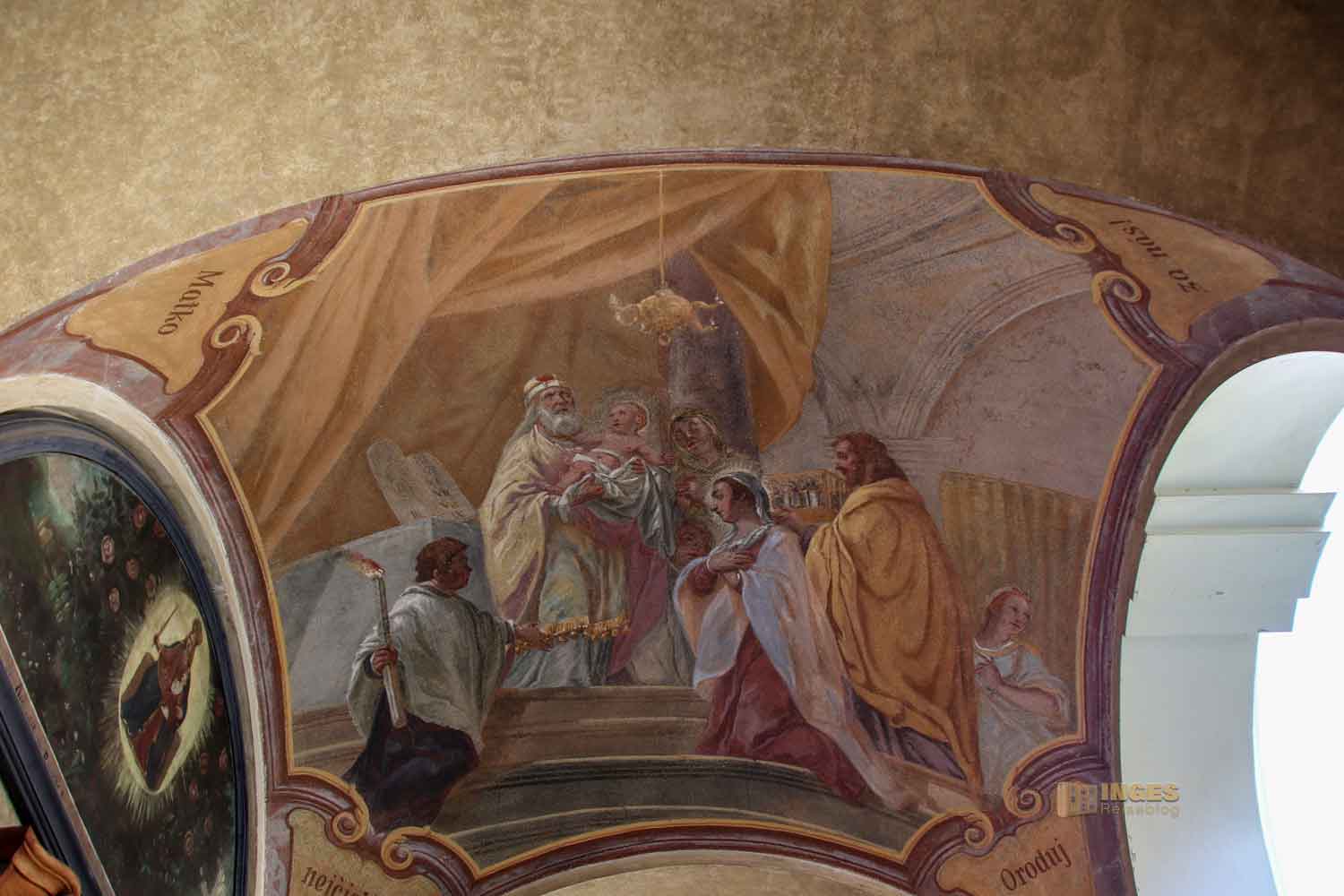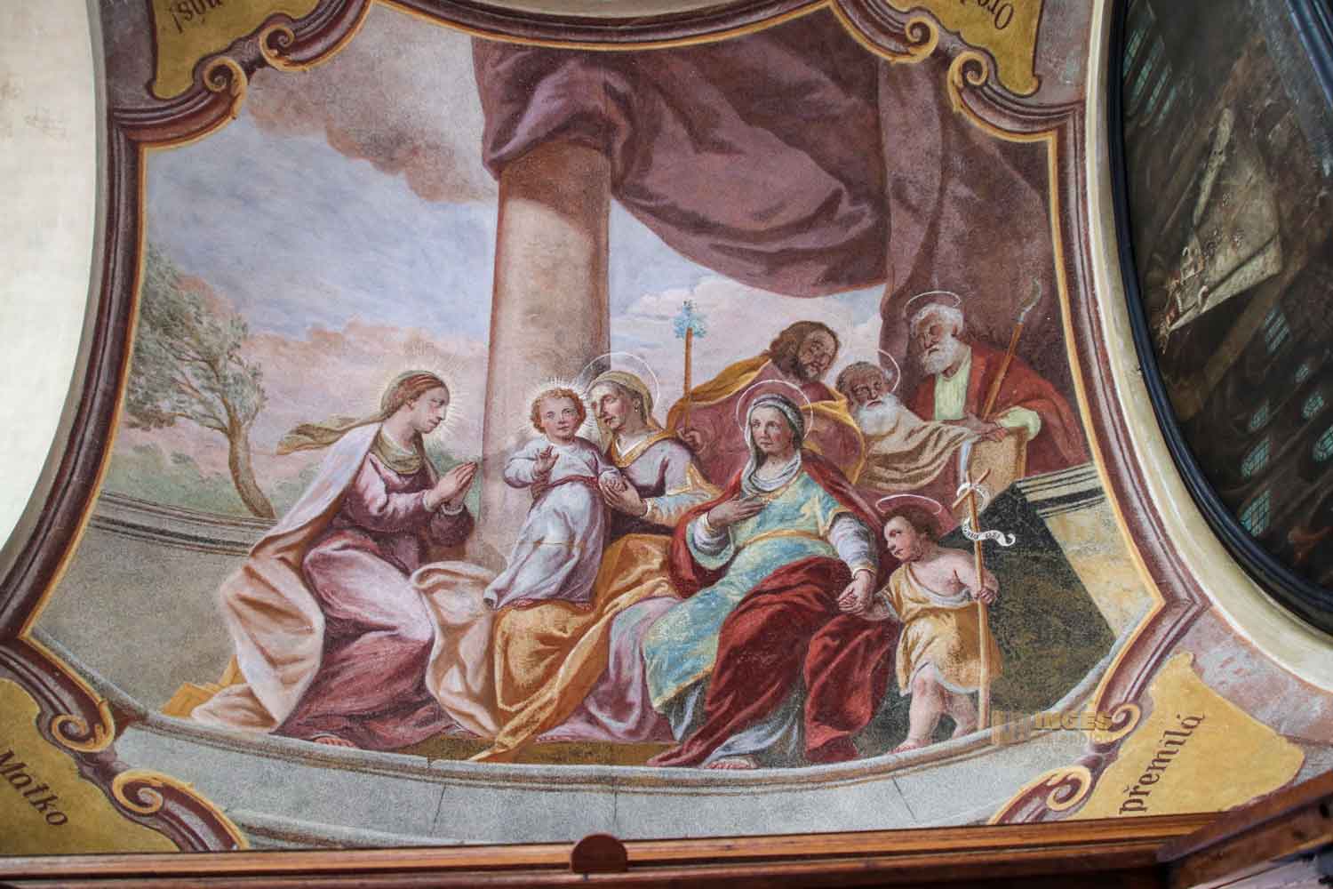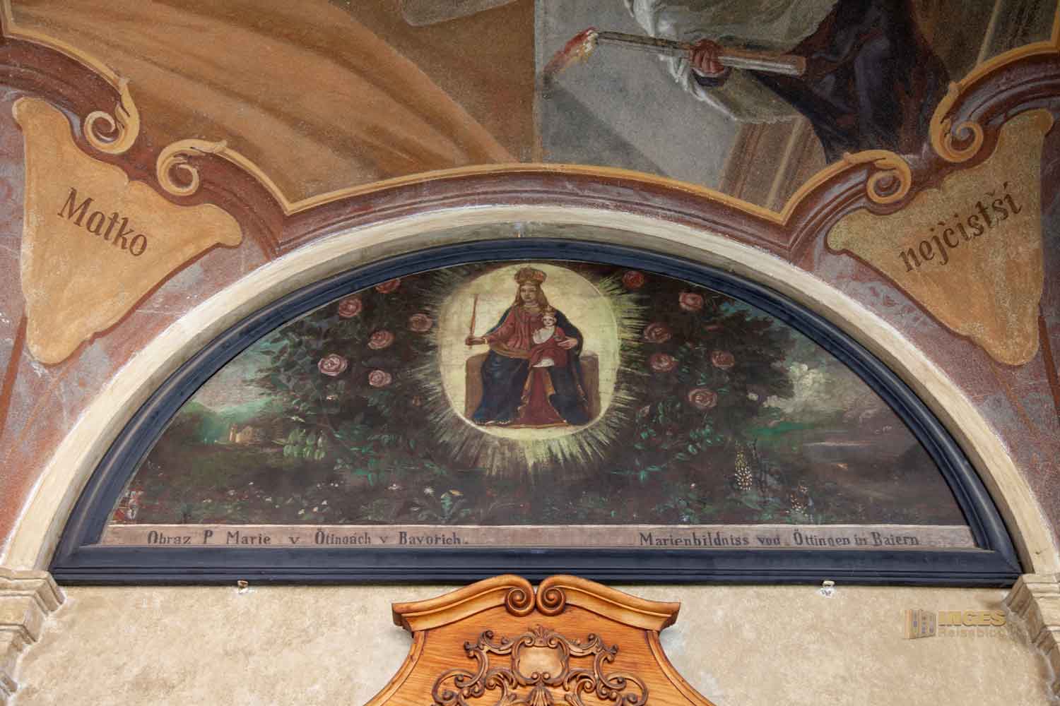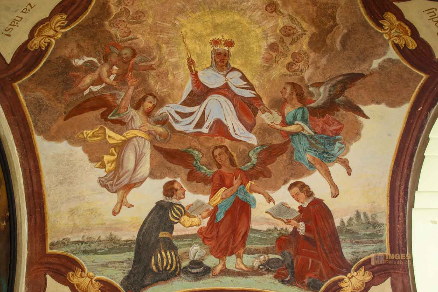 die in diesem Fall ausnahmsweise im ersten Stock als Ausstellungsteil zu sehen ist. Denn als man die Krypta, die die Gräfin von Kolowrat für die Wohltäter des Wallfahrtortes als letzten Ruheplatz in Auftrag gegeben hatte, fand, war sie seit 230 ungeöffnet. Dort zeigten sich barocke Wandgemälde, die von etwa 1664 stammen mussten. Alle Wände und das Gewölbe sind komplett mit diesen Schwarz-Grau Gemälden bedeckt. Zum Schutz dieses Schatzes, wurde die Krypta in den Ausstellungsräumen nachgestellt.