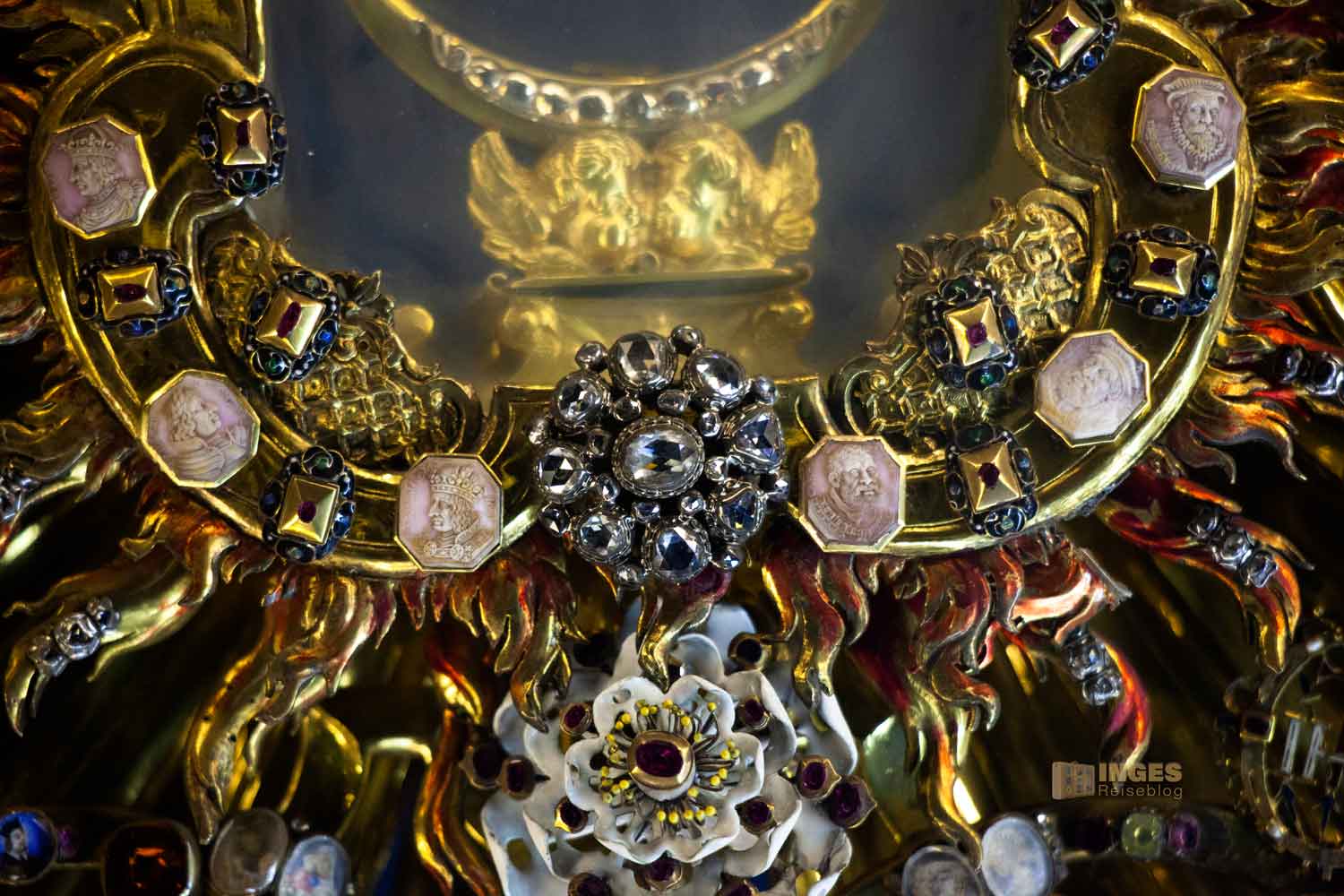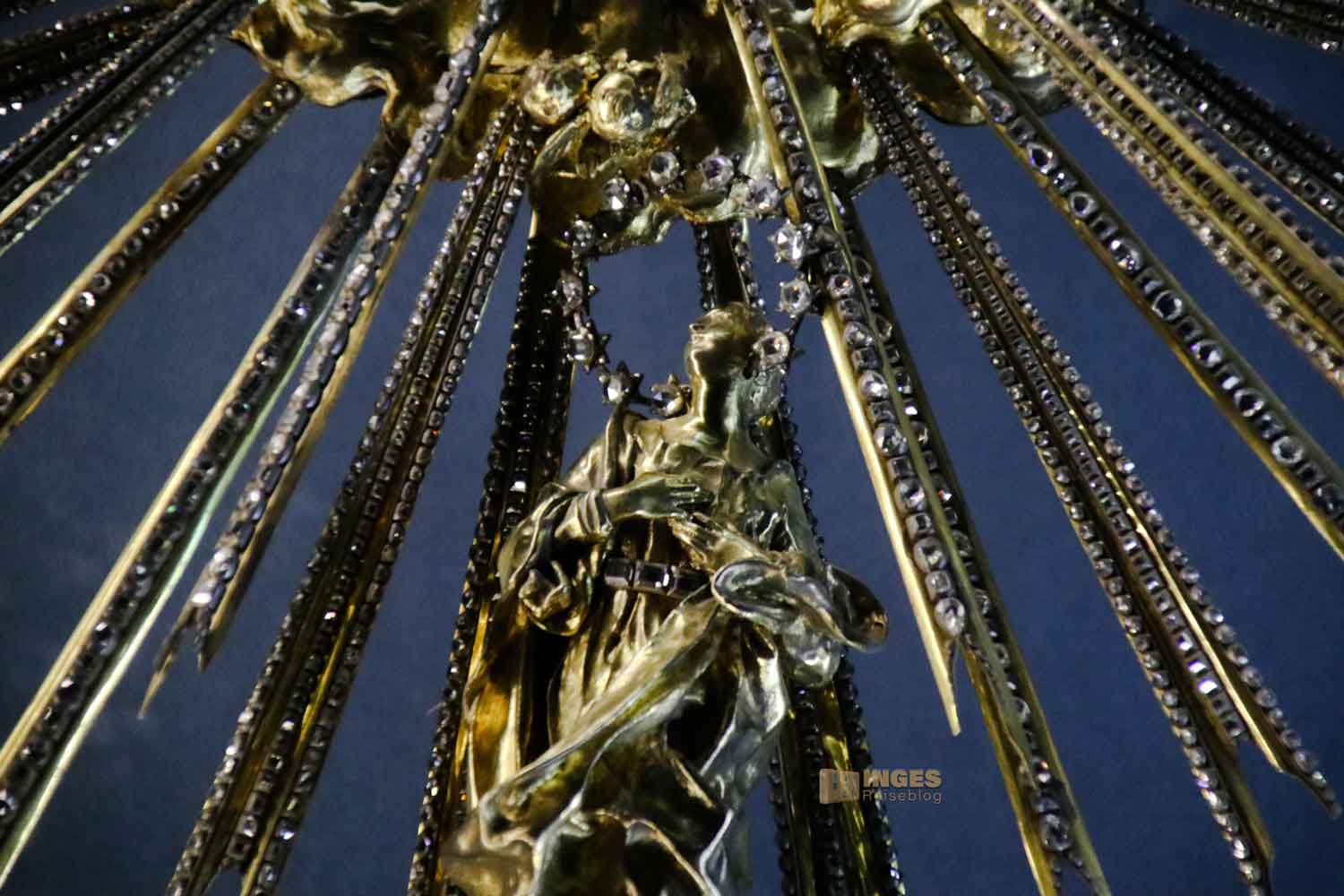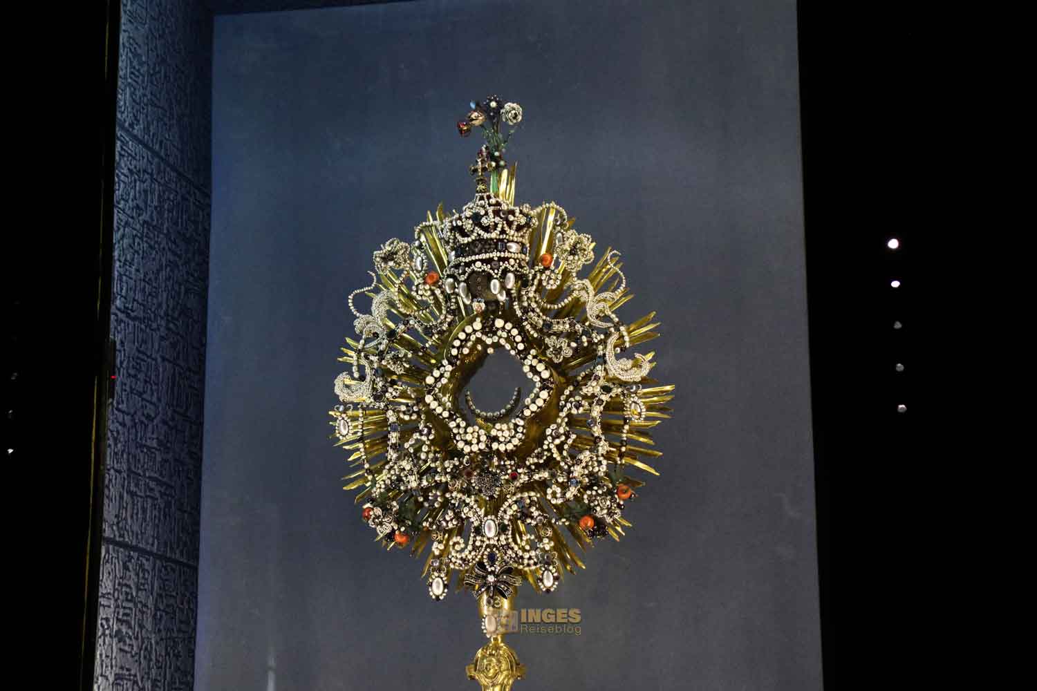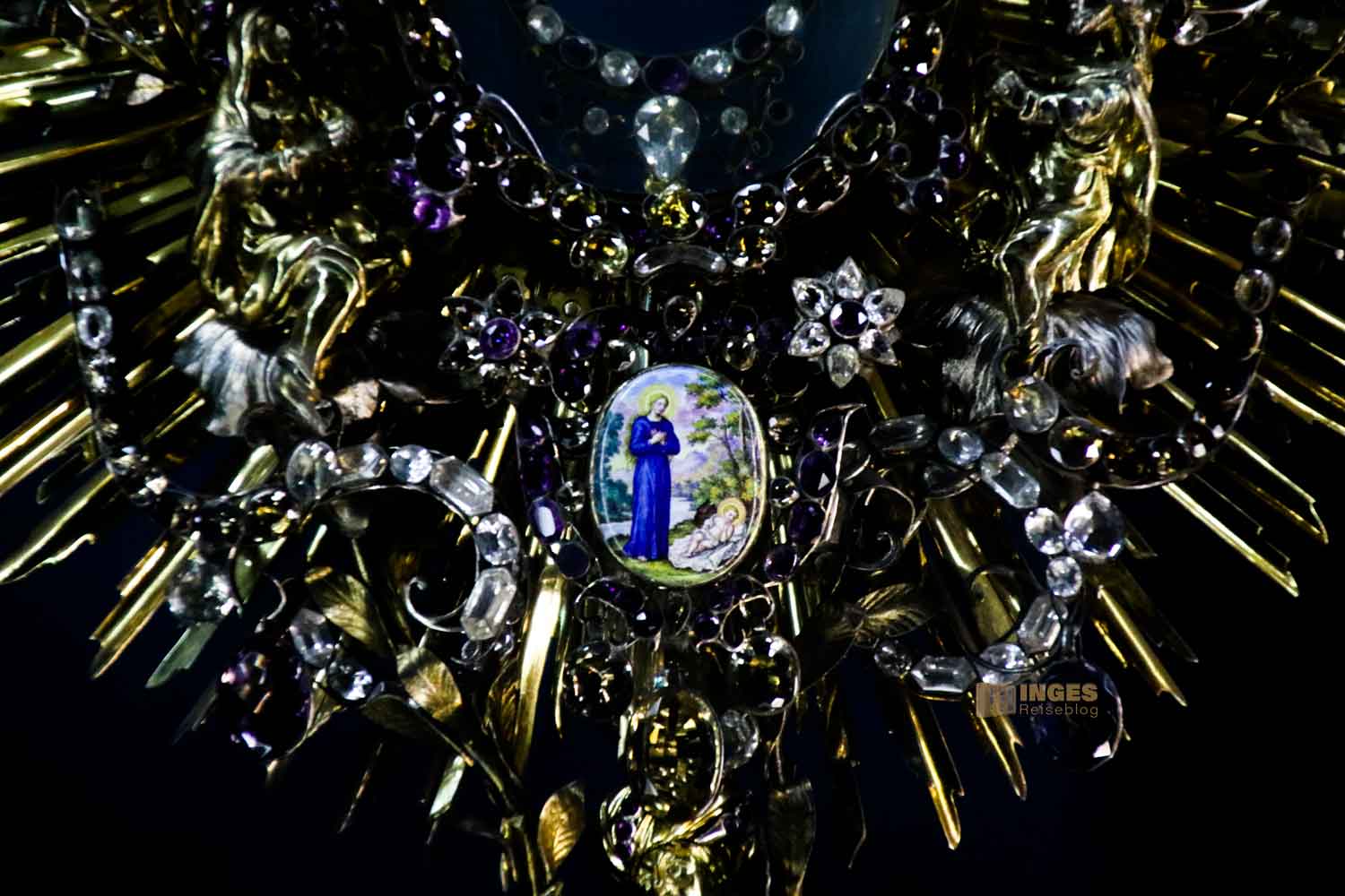 Wenn man die Monstranz, die in Form einer Sonne gearbeitet ist, und deren Strahlen dicht an dicht mit den Diamanten besetzt sind, genauer anschaut, dann sieht man das Gesicht der Mutter Maria mit zwölf Sternen um den Kopf. In der Krone der Sonne ist der Heilige Geist in Gestalt einer Taube. Schaut selber, einfach nur WOW!