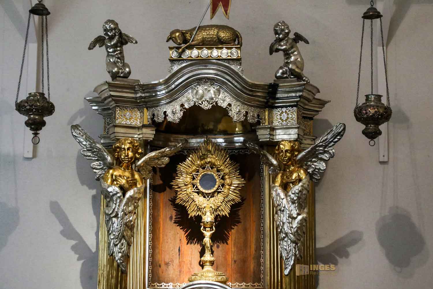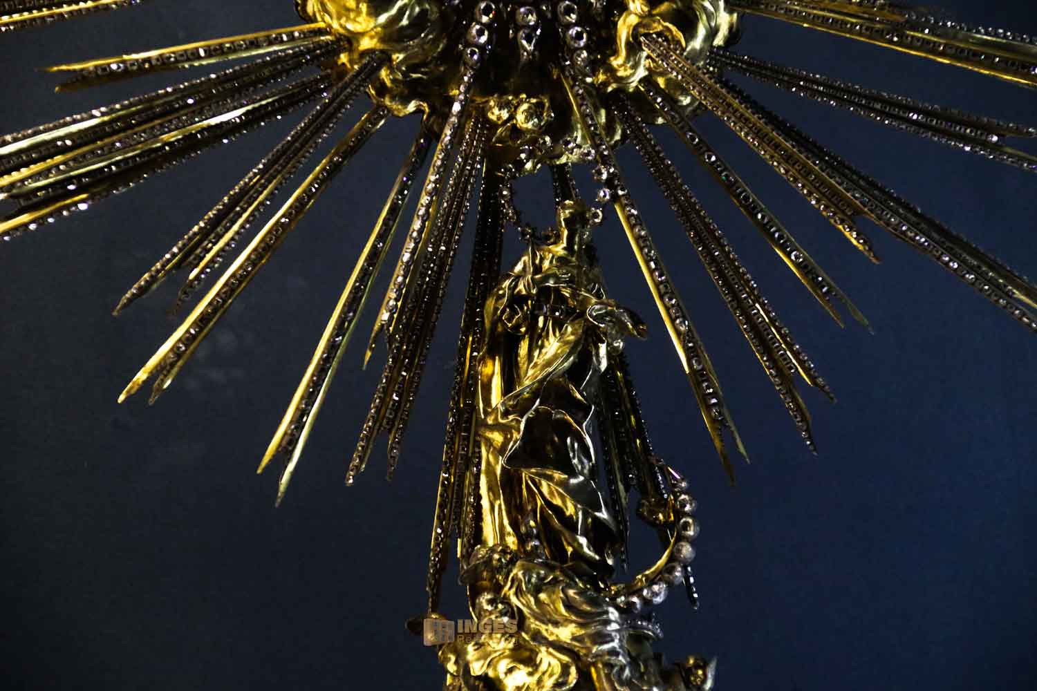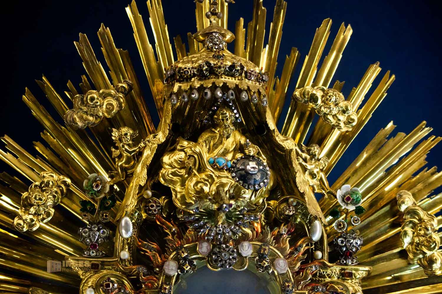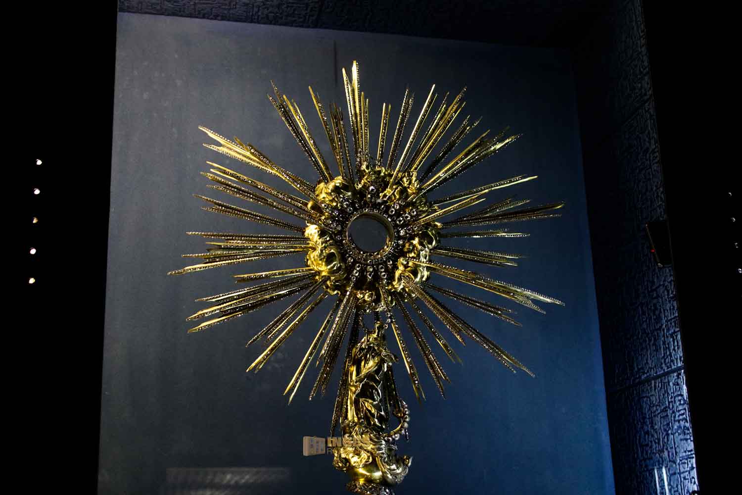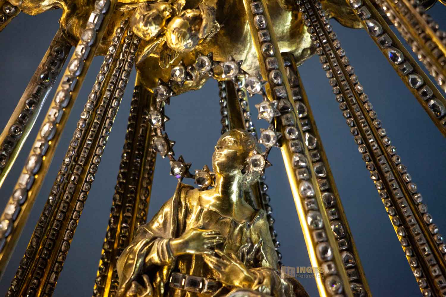 Wenn man die Monstranz, die in Form einer Sonne gearbeitet ist, und deren Strahlen dicht an dicht mit den Diamanten besetzt sind, genauer anschaut, dann sieht man das Gesicht der Mutter Maria mit zwölf Sternen um den Kopf. In der Krone der Sonne ist der Heilige Geist in Gestalt einer Taube. Schaut selber, einfach nur WOW!