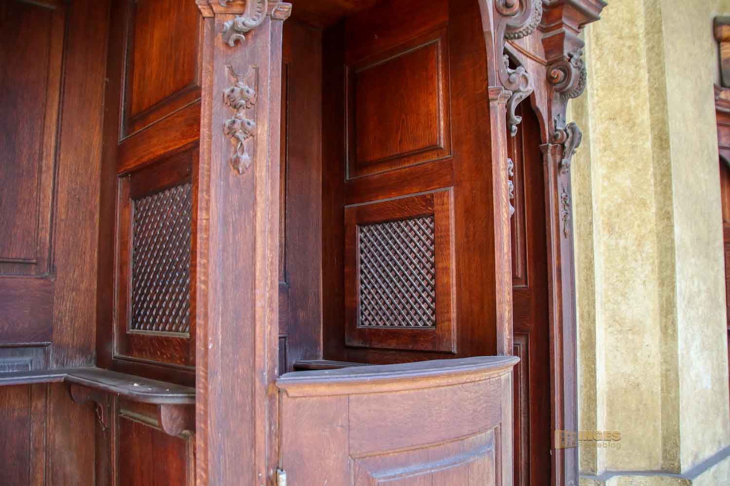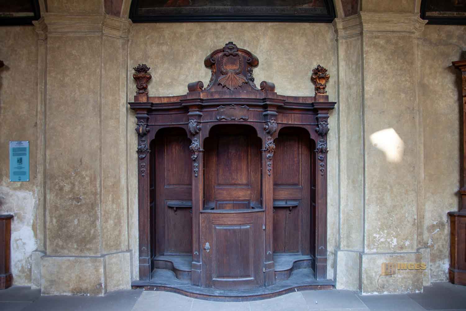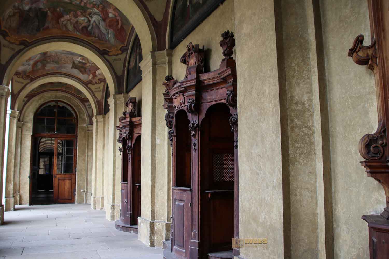 Beichtstühle und Bildern von Heiligen im Kreuzgang im Prager Loreto
