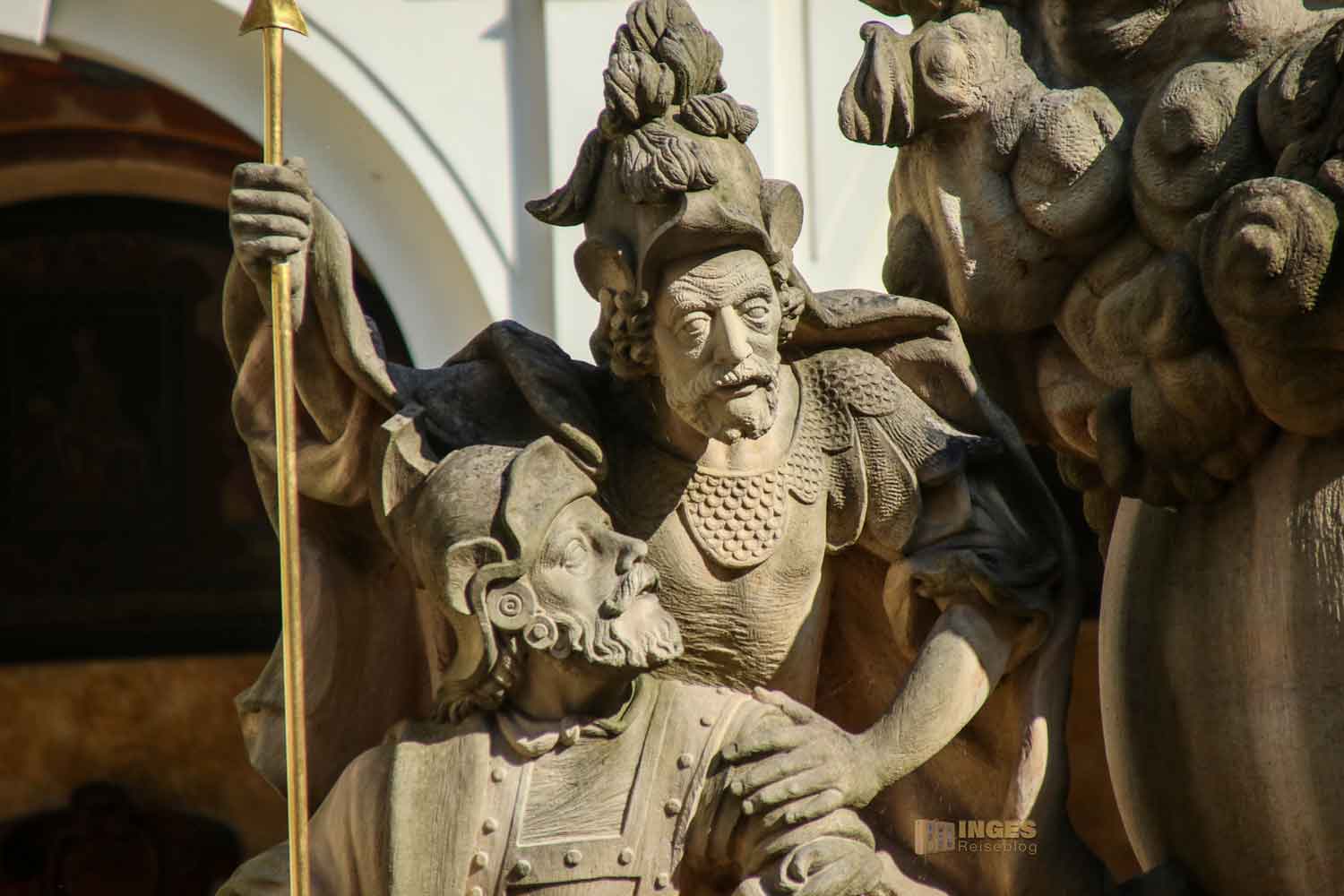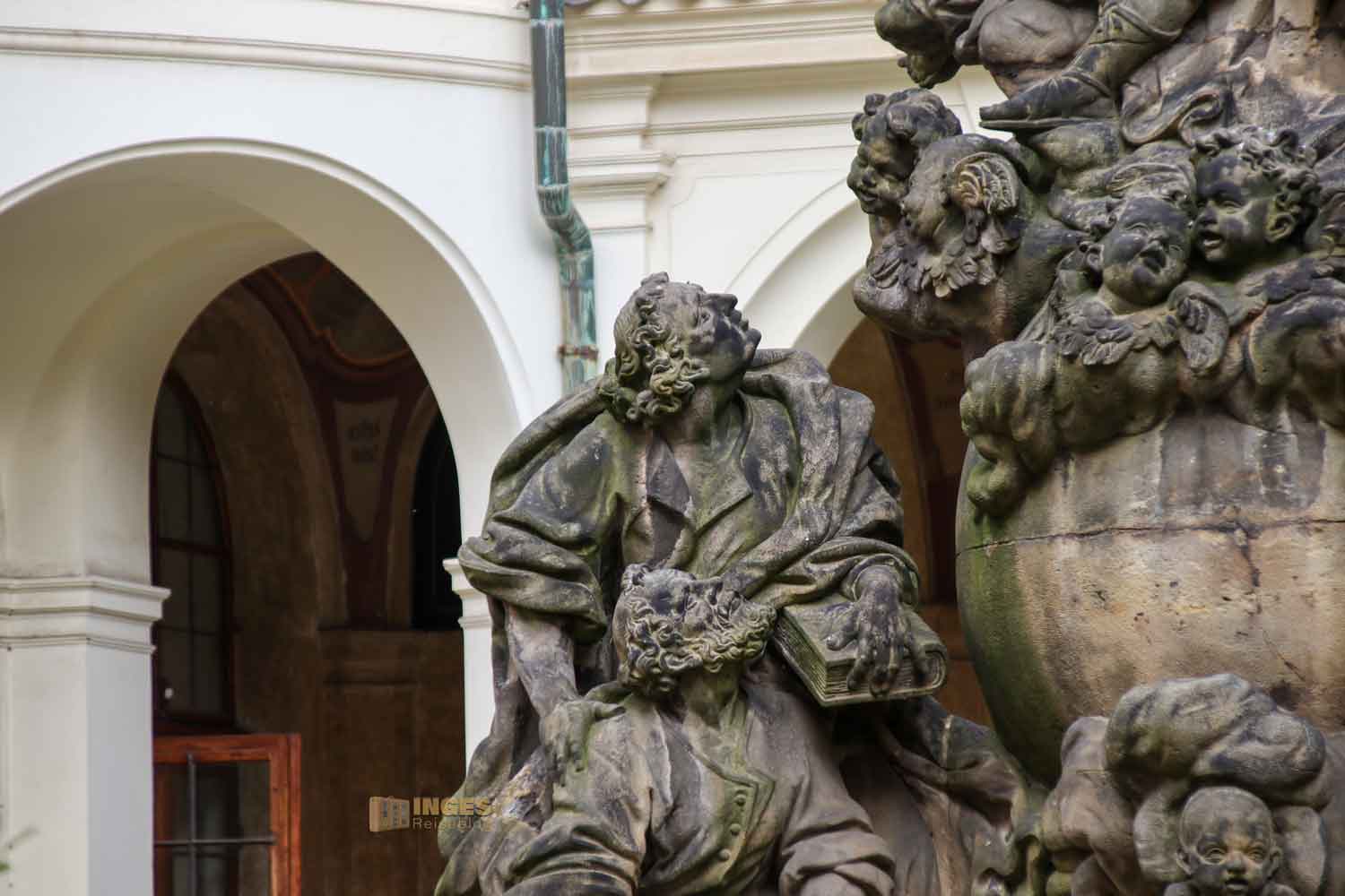 Ein Kloster sollte auch eigenes Brunnenwasser haben, und so wurde 1739 mit den Brunnen nach Wasser gebohrt. Jetzt ist es halt nur ein bisschen schlecht, wenn man für den Bau ein Material nimmt, das nicht für die Ewigkeit hält. Die Originale mussten deshalb ins Lapidarium im Nationalmuseum in Prag (am Wenzelsplatz) und beide Statuen wurden durch Kopien ersetzt. Aber so ist es halt insgesamt, wenn man diese Kunstwerke den Wetterwidrigkeiten aussetzt. Auch die Statuen auf der Karlsbrücke wurden allesamt mal durch Kopien ersetzt. Sechs Originale konnte ich in den Kasematten auf dem Vysehrad bewundern.