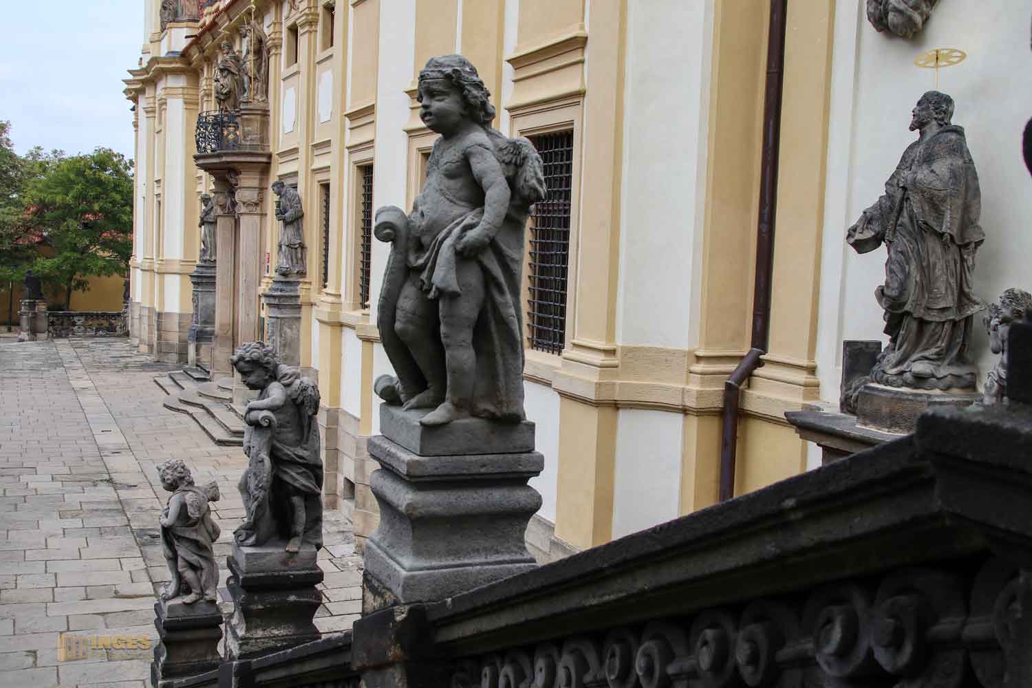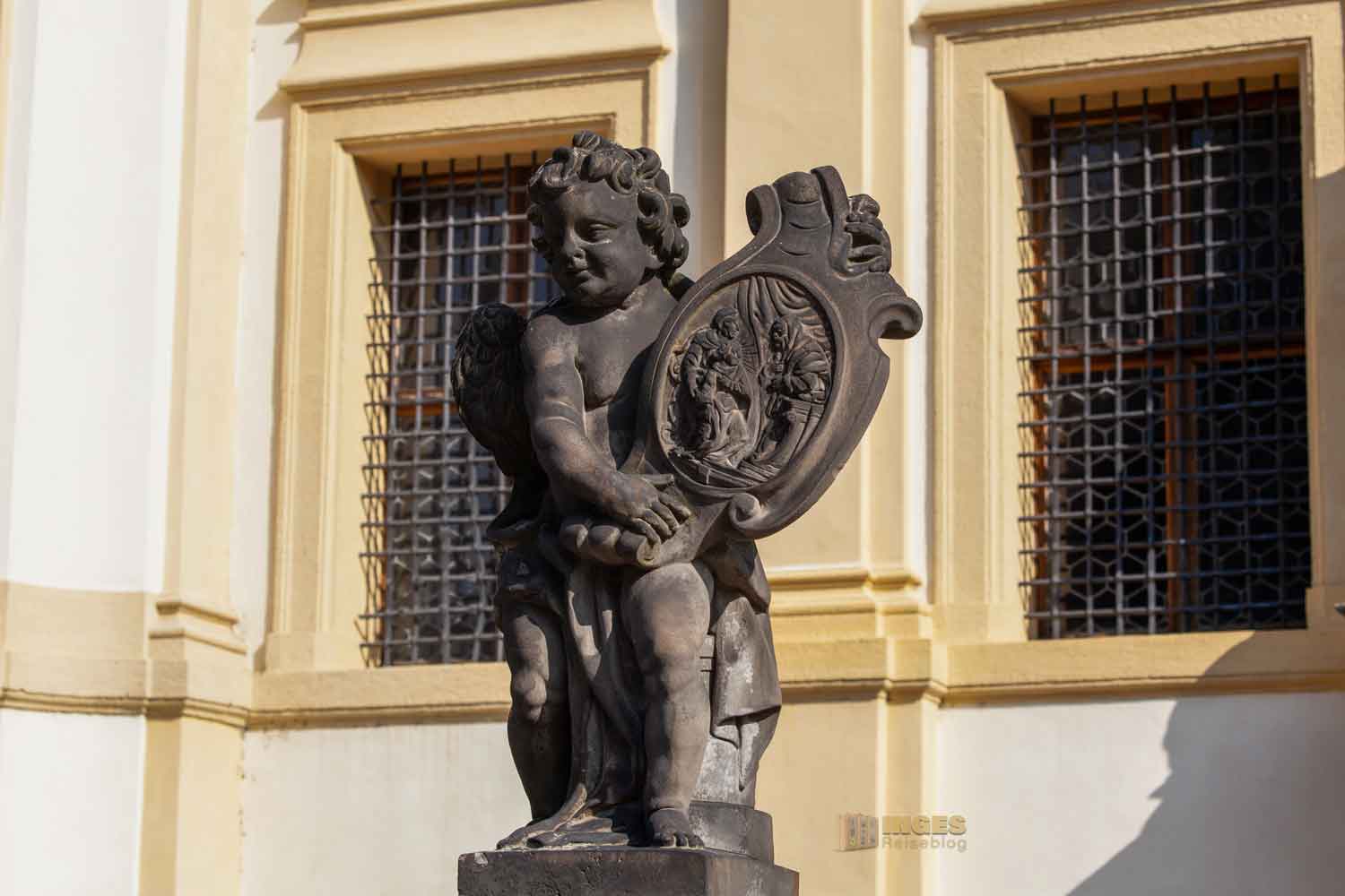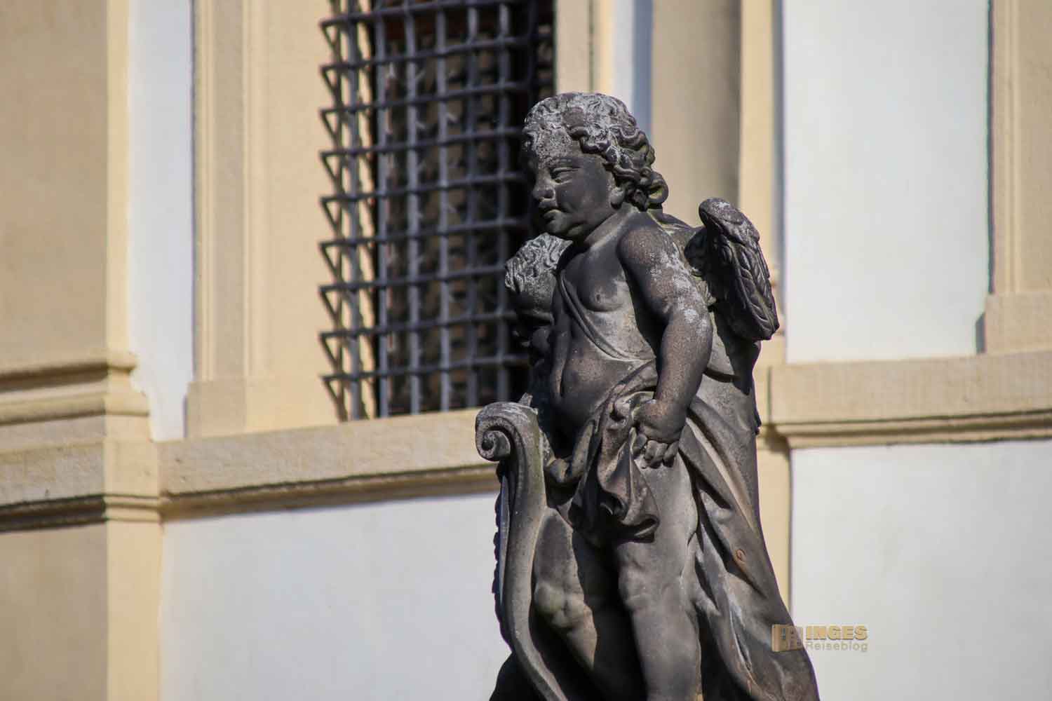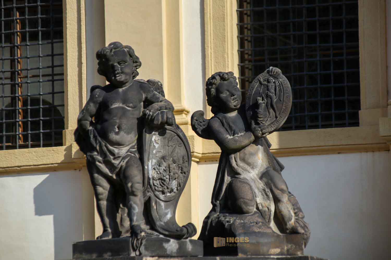 wurden etwa ab 1725 von dem Prager Bildhauer Andreas Philipp Quitainer gefertigt. Er war auf dem Hradschin nicht nur für das Prager Loreto tätig, sondern auch für das Kloster Strahov. Über 20 Engelfiguren und andere Statuen sind da zu bewundern, teilweise aber nicht mehr im Original. Was meiner Freude natürlich keinen Abbruch tat 😉