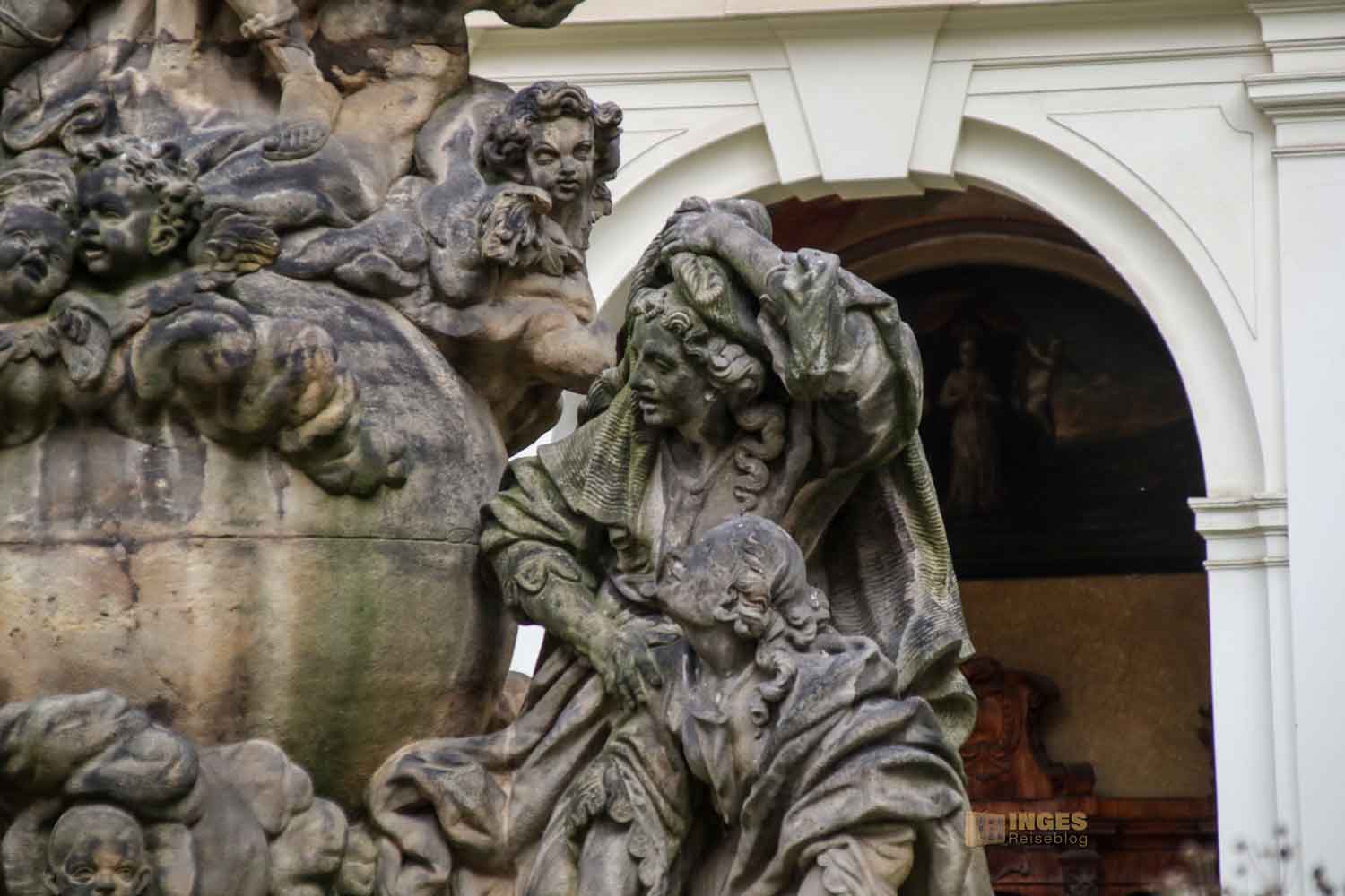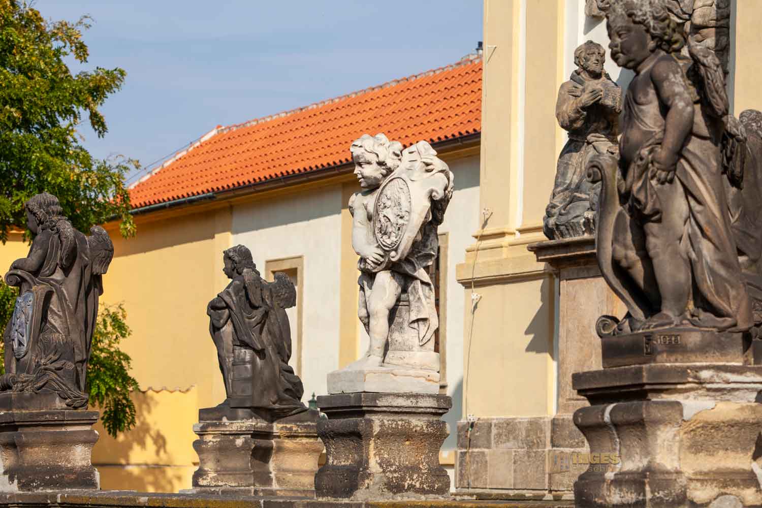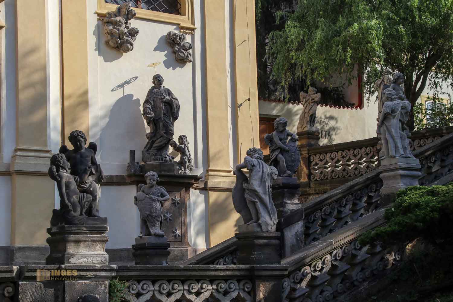wurden etwa ab 1725 von dem Prager Bildhauer Andreas Philipp Quitainer gefertigt. Er war auf dem Hradschin nicht nur für das Prager Loreto tätig, sondern auch für das Kloster Strahov. Über 20 Engelfiguren und andere Statuen sind da zu bewundern, teilweise aber nicht mehr im Original. Was meiner Freude natürlich keinen Abbruch tat 😉