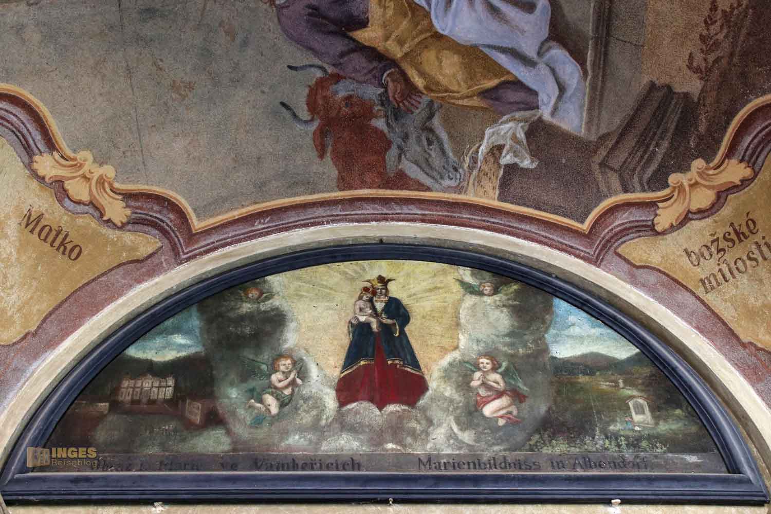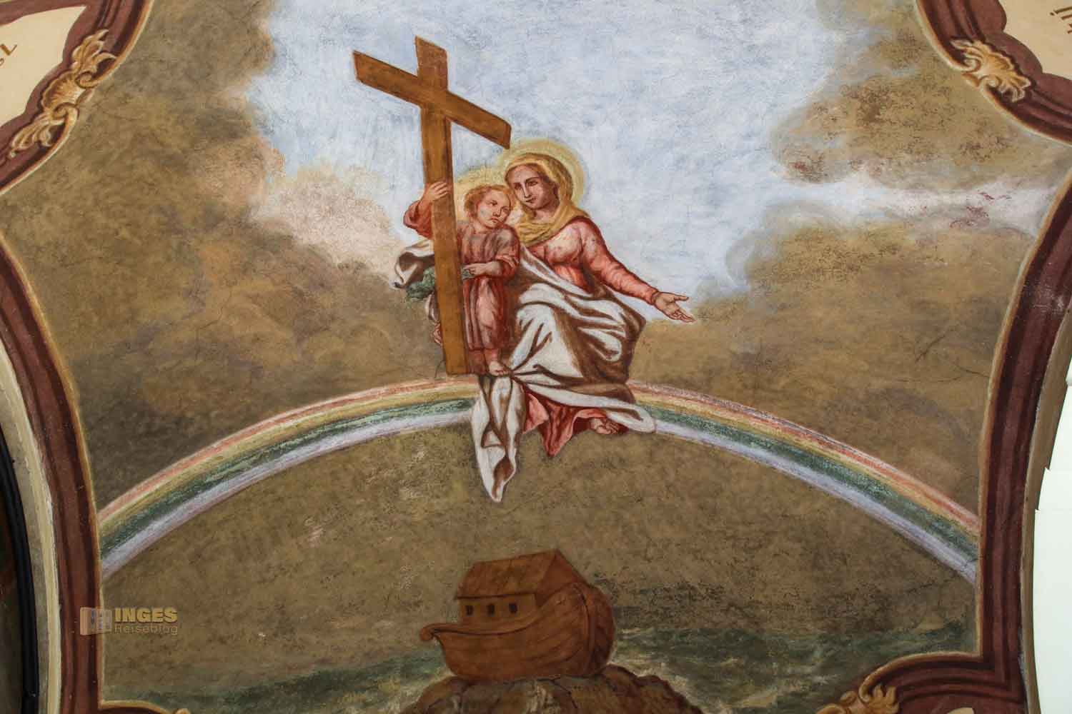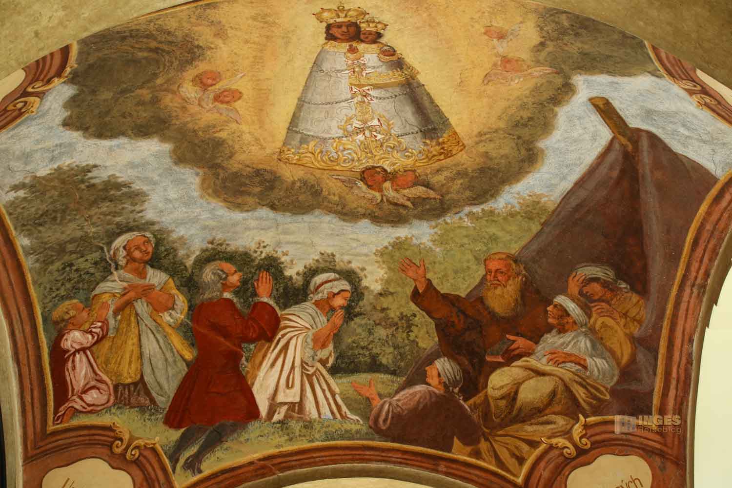 erzählt aus dem Leben von Maria. Es versteht sich bei diesem tollen Aussehen der Fresken von selbst, dass diese im Lauf der Zeit restauriert wurden. In den einzelnen Felder stehen Anrufungen an die Mutter Maria dabei. Diese sind aus der lauretanischen Litanei. Diese Litanei geht bis ins Mittelalter zurück und ist 1531 erstmals im italienischen Wallfahrtsort Loreto erwähnt. Deshalb auch der Name der Litanei. In Wechselgesängen zwischen einem Vorbeter und den Gläubigen wird die Gottesmutter angerufen. Die Antwort der Gläubigen auf die Anrufung des Vorbeters, ist dann meist "Bitte für uns".