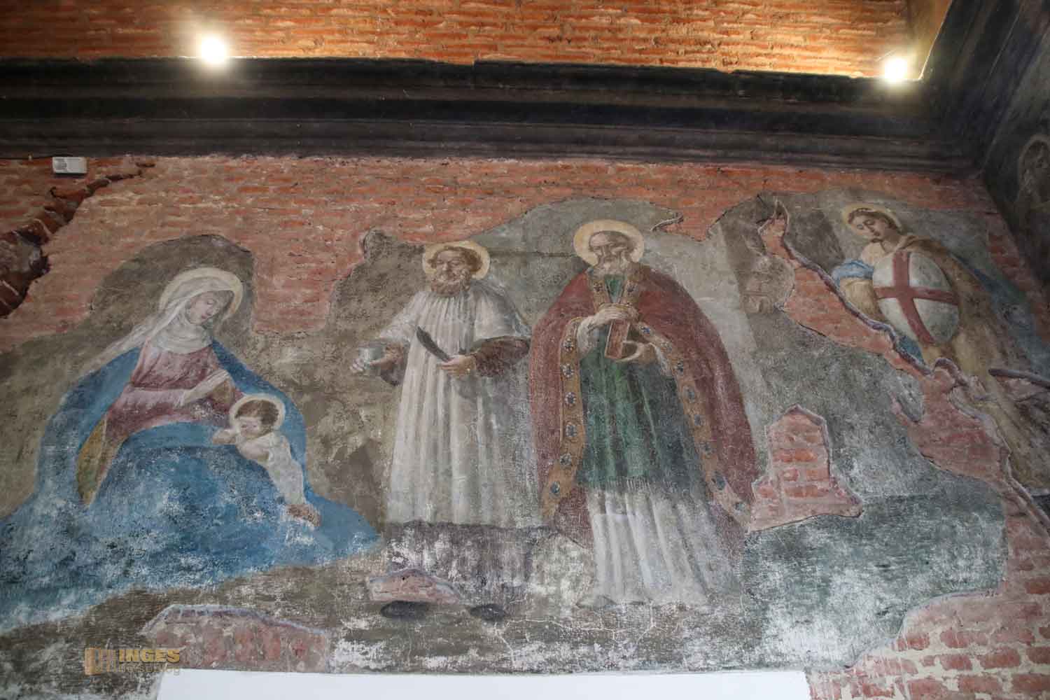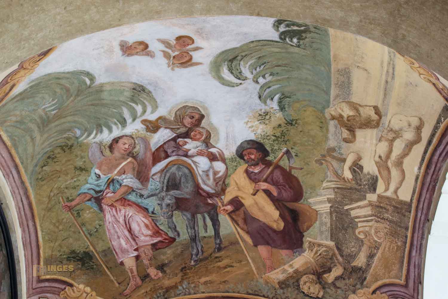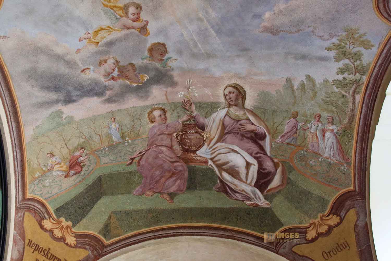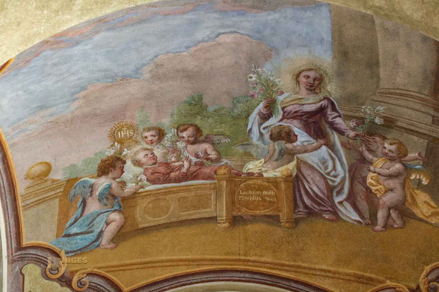erzählt aus dem Leben von Maria. Es versteht sich bei diesem tollen Aussehen der Fresken von selbst, dass diese im Lauf der Zeit restauriert wurden. In den einzelnen Felder stehen Anrufungen an die Mutter Maria dabei. Diese sind aus der lauretanischen Litanei. Diese Litanei geht bis ins Mittelalter zurück und ist 1531 erstmals im italienischen Wallfahrtsort Loreto erwähnt. Deshalb auch der Name der Litanei. In Wechselgesängen zwischen einem Vorbeter und den Gläubigen wird die Gottesmutter angerufen. Die Antwort der Gläubigen auf die Anrufung des Vorbeters, ist dann meist "Bitte für uns".
