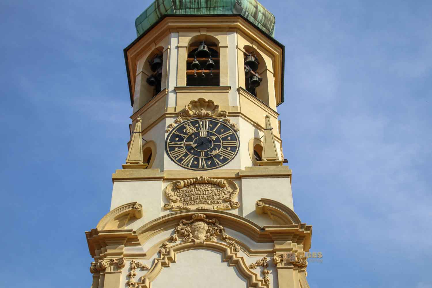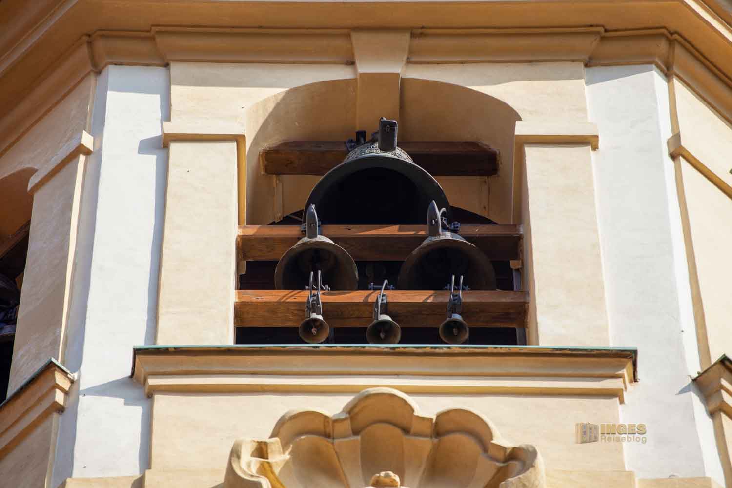 Im Turm sind 30 Glocken, die 1694 in Amsterdam gegossen wurden und als Glockenspiel stündlich ein Marienlied ertönen lassen. Dieses stündliche Glockenspiel geht auf eine traurige Legende zurück, die sich unweit des Prager Loreto, in der kleinen Gasse Nový Svět abgespielt haben soll. Diese Gasse wird als die schönste und malerischste Gasse in Prag beschrieben (ich hab sie auf unserem nächsten Besichtigungszettel).