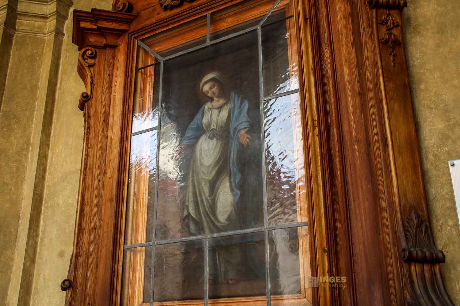 das die Freifrau genau nach dem Original hier im Innenhof haben wollte. Dies gab dem Wallfahrtskomplex auch seinen Namen. Im italienischen Loreto steht das Heilige Haus, das Geburtshaus von Maria, das Engel von Nazareth bis nach Italien getragen hätten.