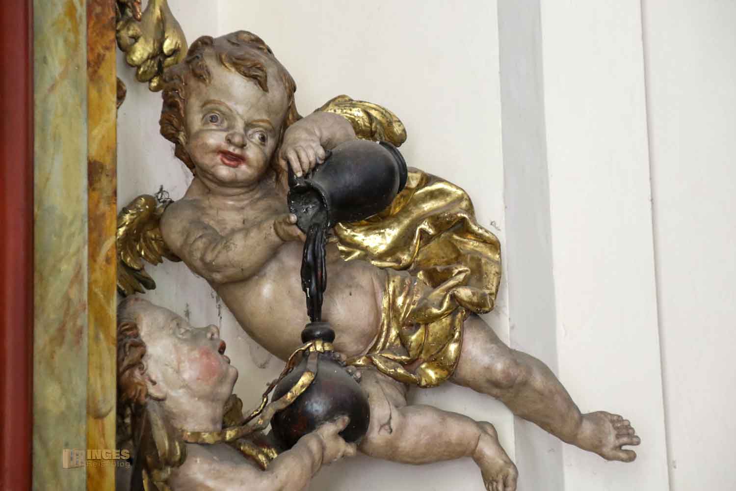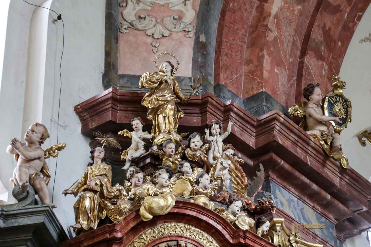 In den Kartuschen, die die Engel tragen, werden Szenen aus dem Leben von Maria dargestellt. Eine Meisterleistung auf so kleiner Fläche.