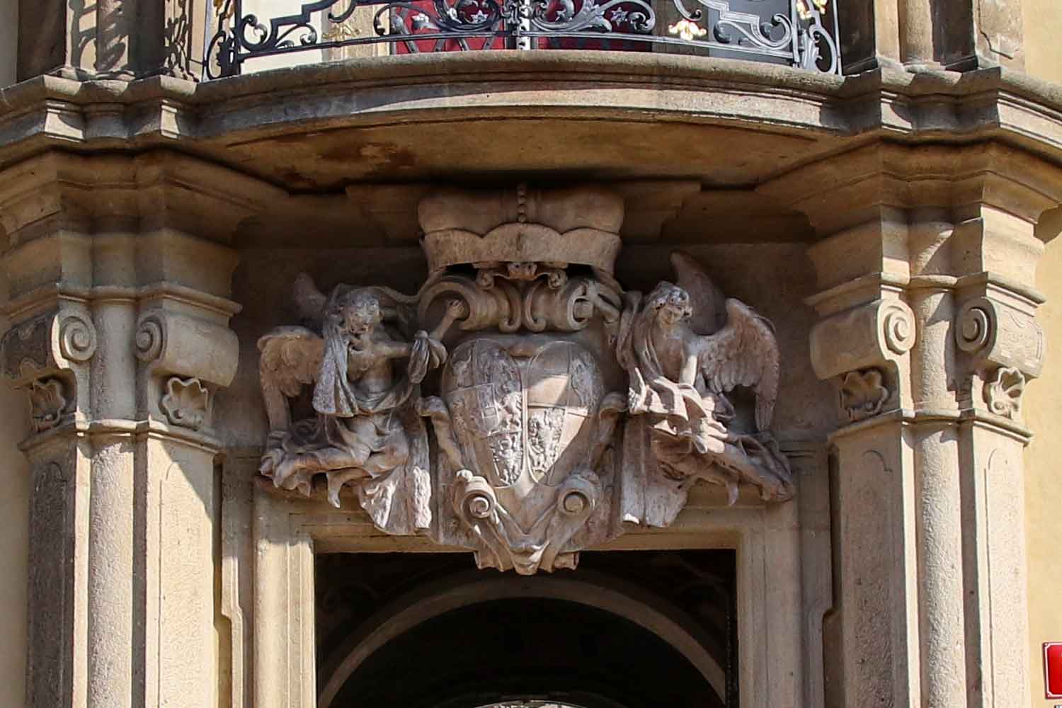 der unter einem kleinen Balkon in den Innenhof der Klosteranlage führt. Wer den Umbau bestimmt (und natürlich auch bezahlt) dem darf über dem Eingang auch ein Denkmal gesetzt werden. Man sieht das Allianzwappen von Fürst und Fürstin von Lobkowicz. Auch wenn sie zu dieser Zeit es selbst nicht mehr bewundern konnte, sie verstarb 1720. Ihr Mann setzte aber das Wohlwollen seiner Gattin zum Prager Loreto fort.