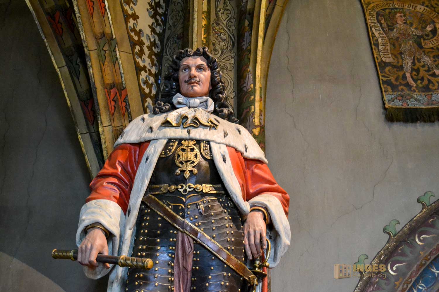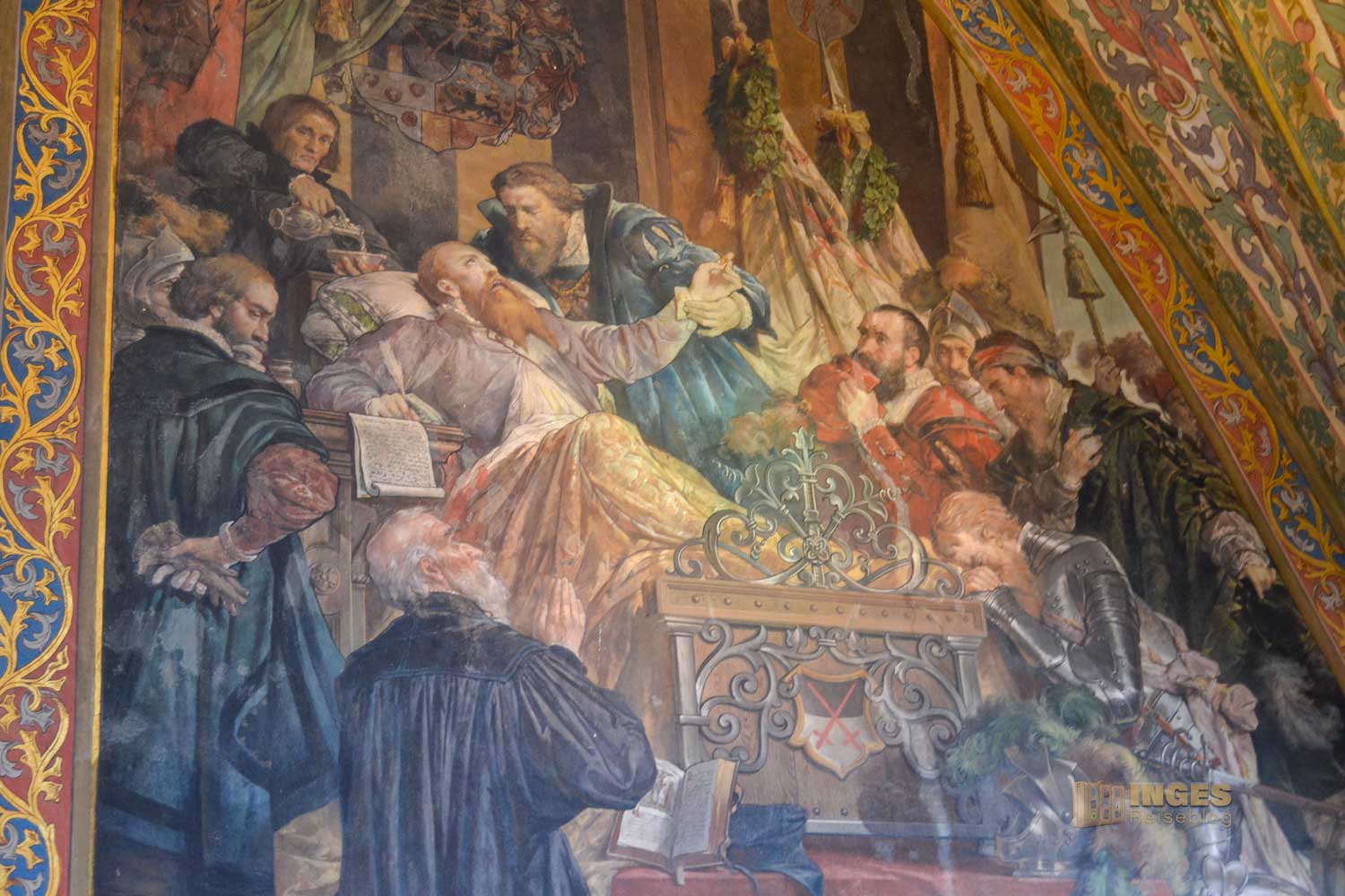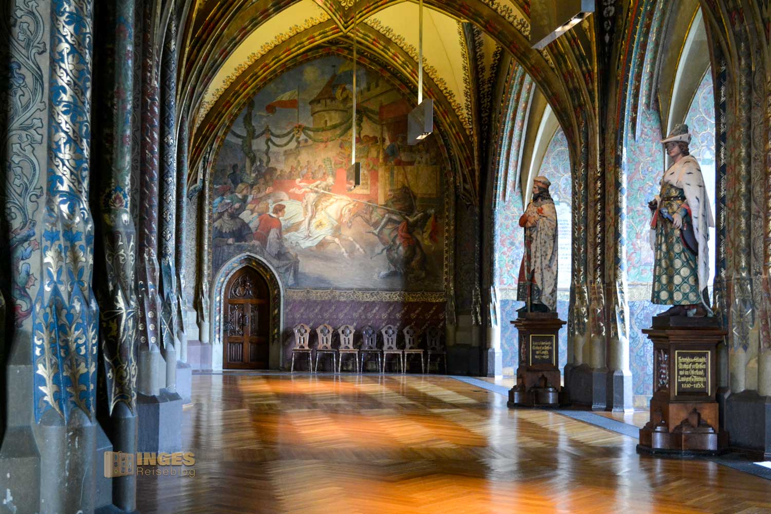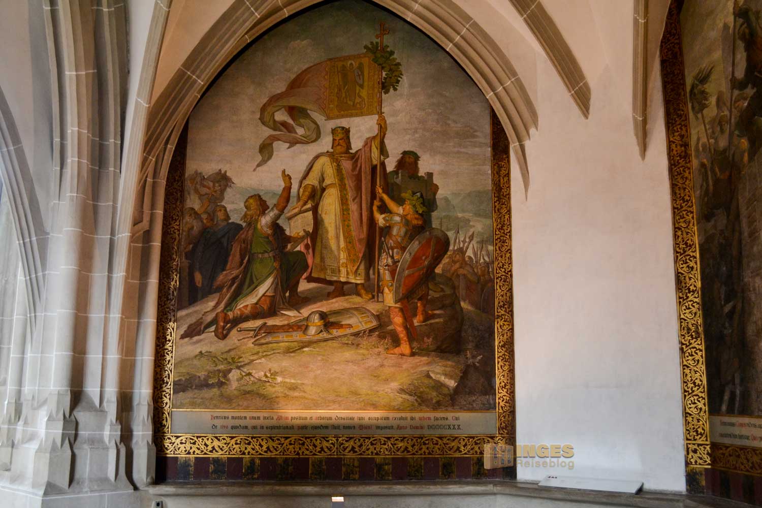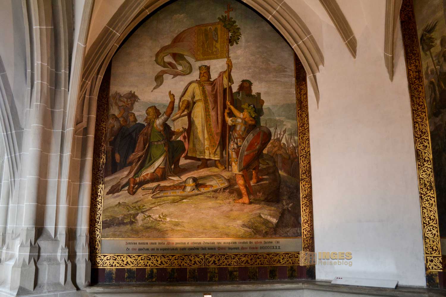 34 Meter lang und 13,5 Meter breit ist dieser beeindruckende Saal. Herrscherfiguren, samt König Heinrich I., der Wettiner oder Johann Georg II., Kurfürst zu Sachsen haben hier ihre Plätze. Wunderschöne Historienbilder und -texte zieren die Wände. Ein Saal, dem man Zeit geben darf ihn zu erkunden. Und dass Restaurierungen in diesen 'alten' wunderschönen Gemäuern immer notwendig sind, war an den beiden fleißigen Restauratoren auf ihren hohen Gerüsten sichtbar.