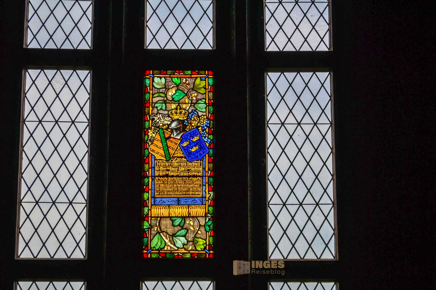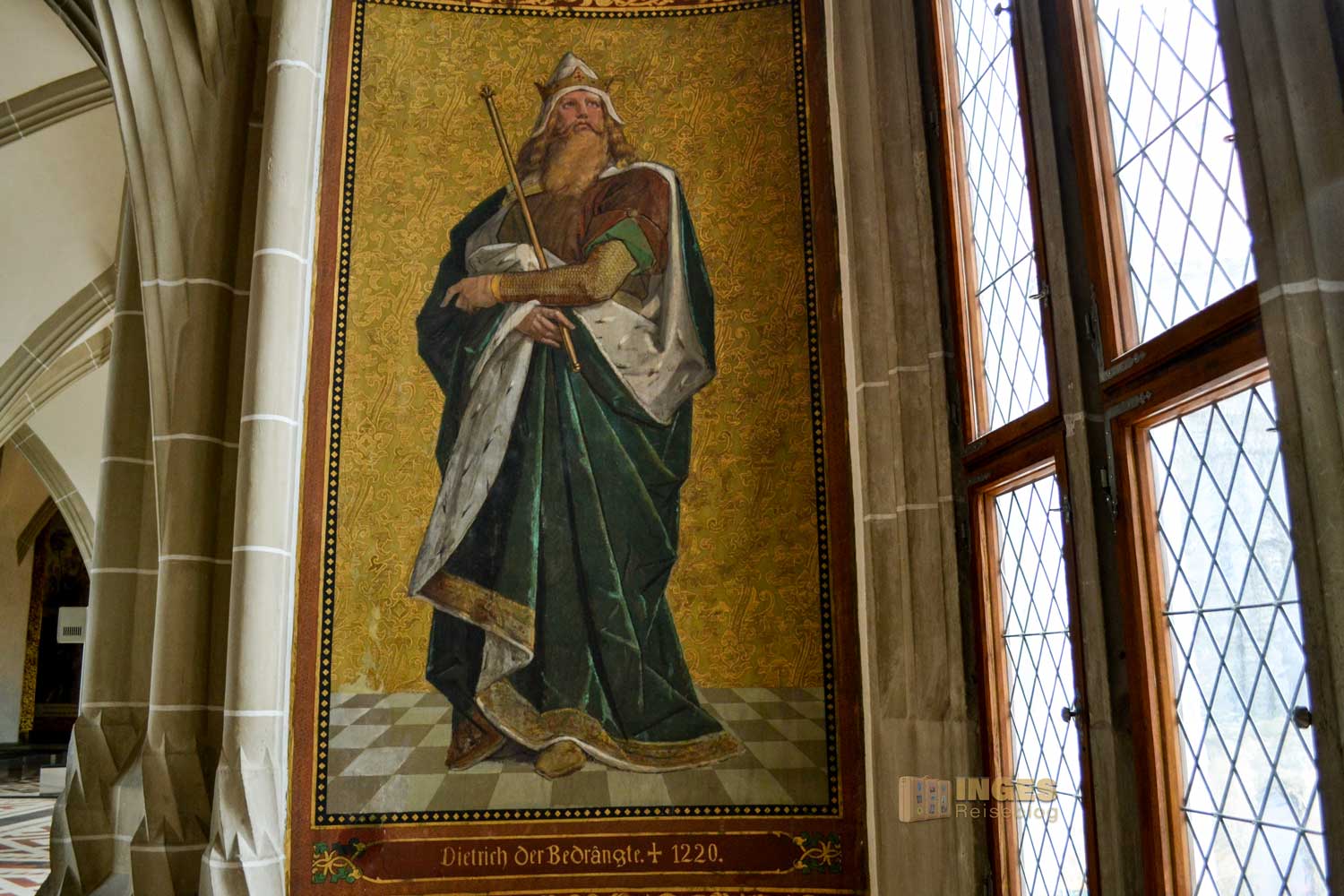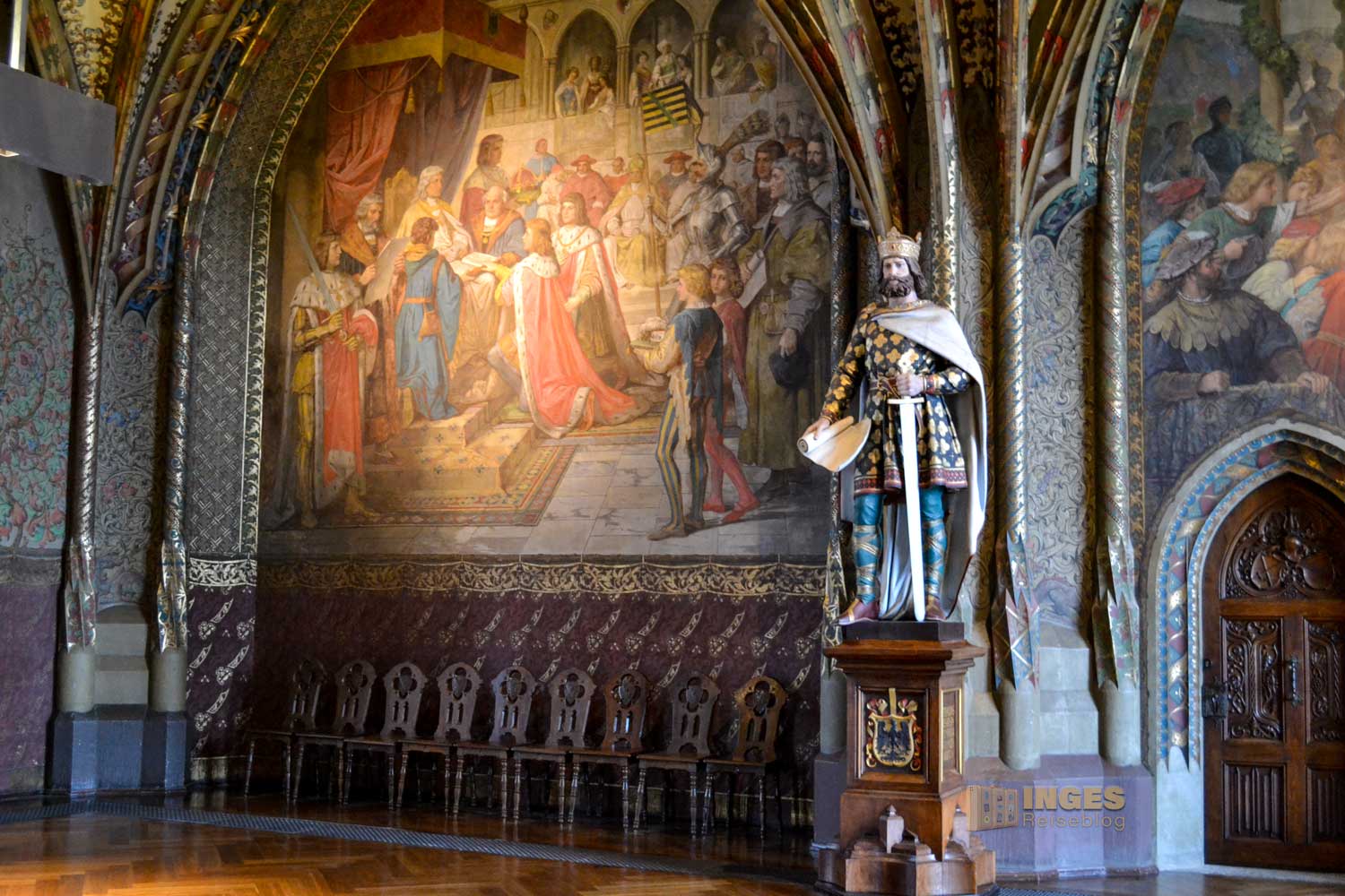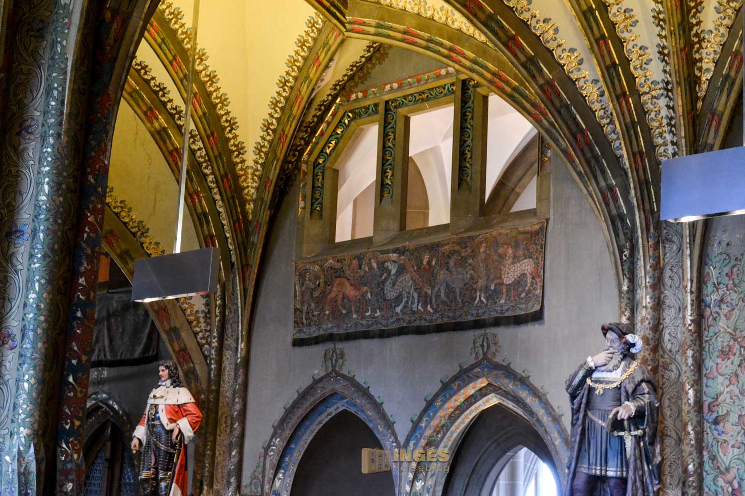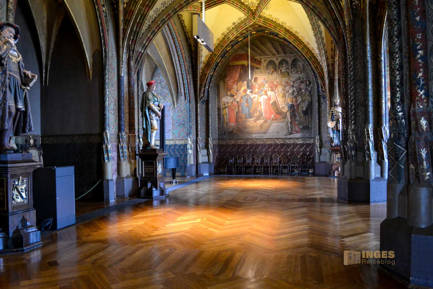 34 Meter lang und 13,5 Meter breit ist dieser beeindruckende Saal. Herrscherfiguren, samt König Heinrich I., der Wettiner oder Johann Georg II., Kurfürst zu Sachsen haben hier ihre Plätze. Wunderschöne Historienbilder und -texte zieren die Wände. Ein Saal, dem man Zeit geben darf ihn zu erkunden. Und dass Restaurierungen in diesen 'alten' wunderschönen Gemäuern immer notwendig sind, war an den beiden fleißigen Restauratoren auf ihren hohen Gerüsten sichtbar.