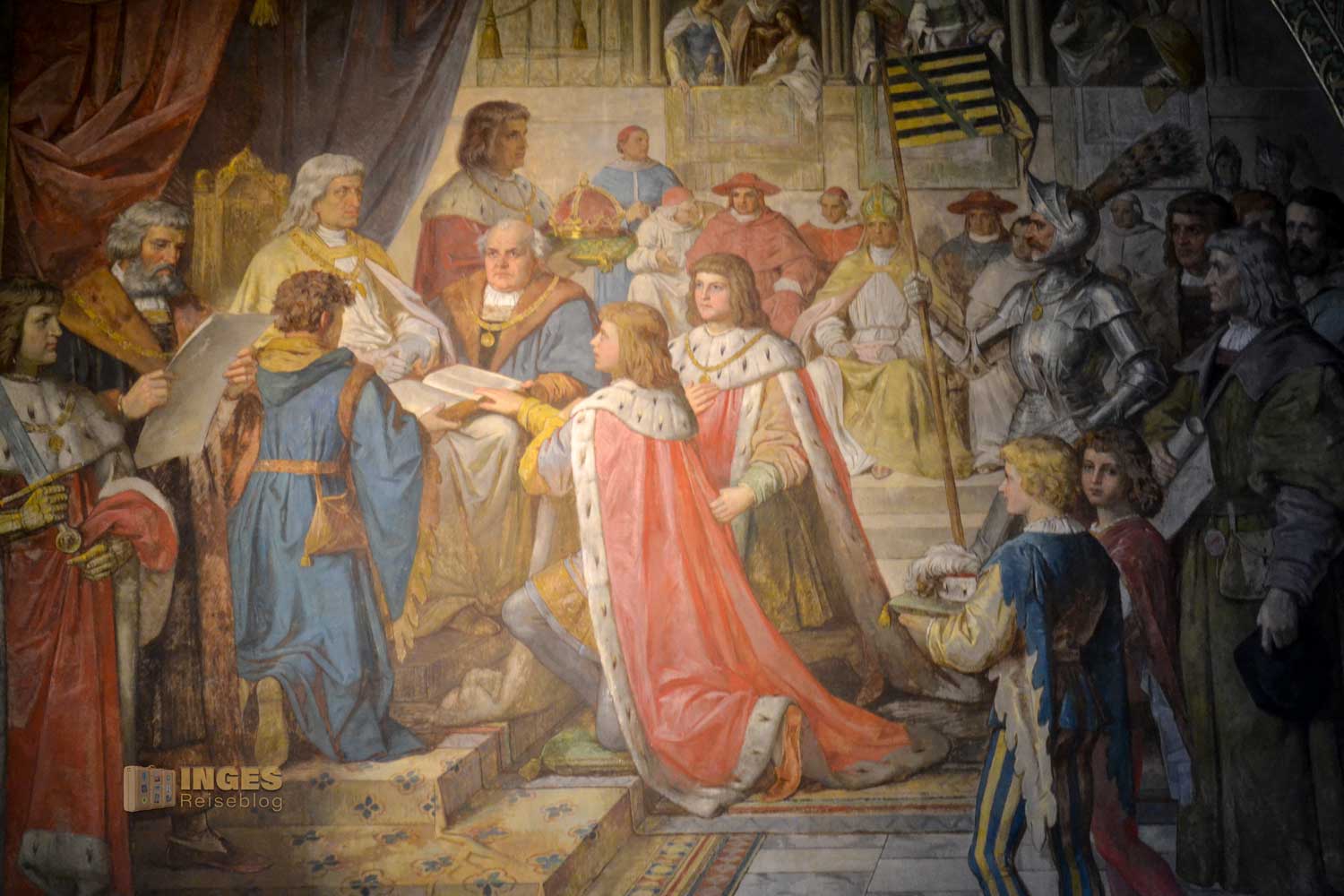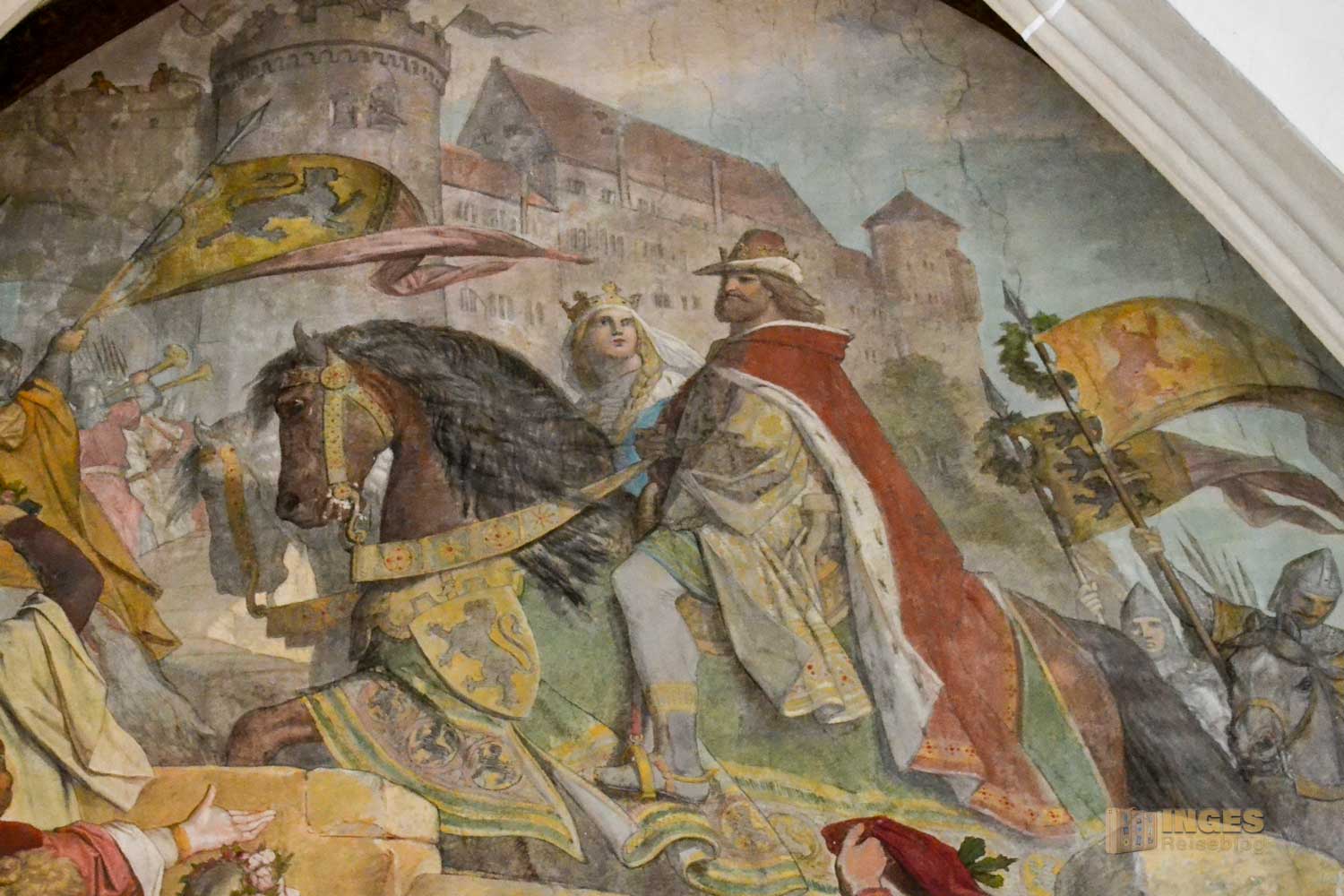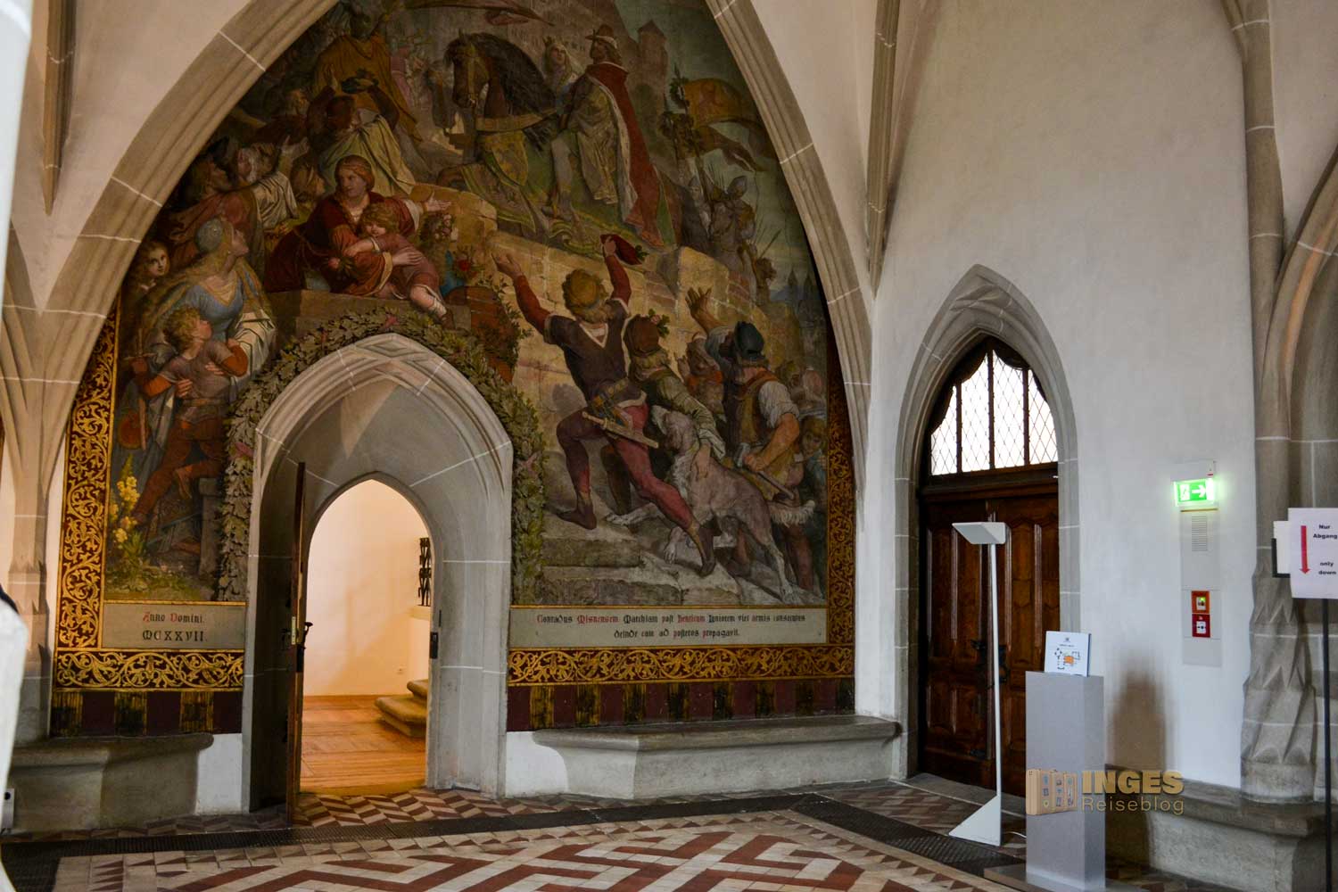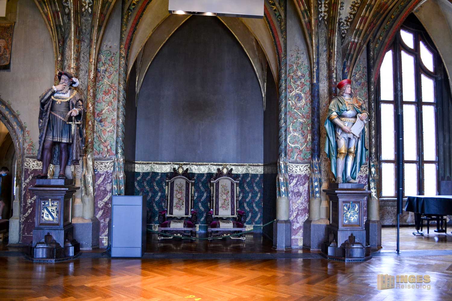 34 Meter lang und 13,5 Meter breit ist dieser beeindruckende Saal. Herrscherfiguren, samt König Heinrich I., der Wettiner oder Johann Georg II., Kurfürst zu Sachsen haben hier ihre Plätze. Wunderschöne Historienbilder und -texte zieren die Wände. Ein Saal, dem man Zeit geben darf ihn zu erkunden. Und dass Restaurierungen in diesen 'alten' wunderschönen Gemäuern immer notwendig sind, war an den beiden fleißigen Restauratoren auf ihren hohen Gerüsten sichtbar.