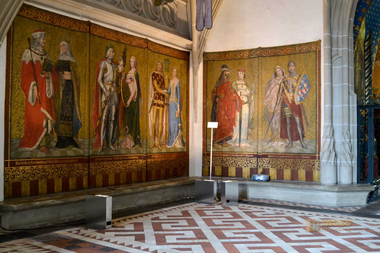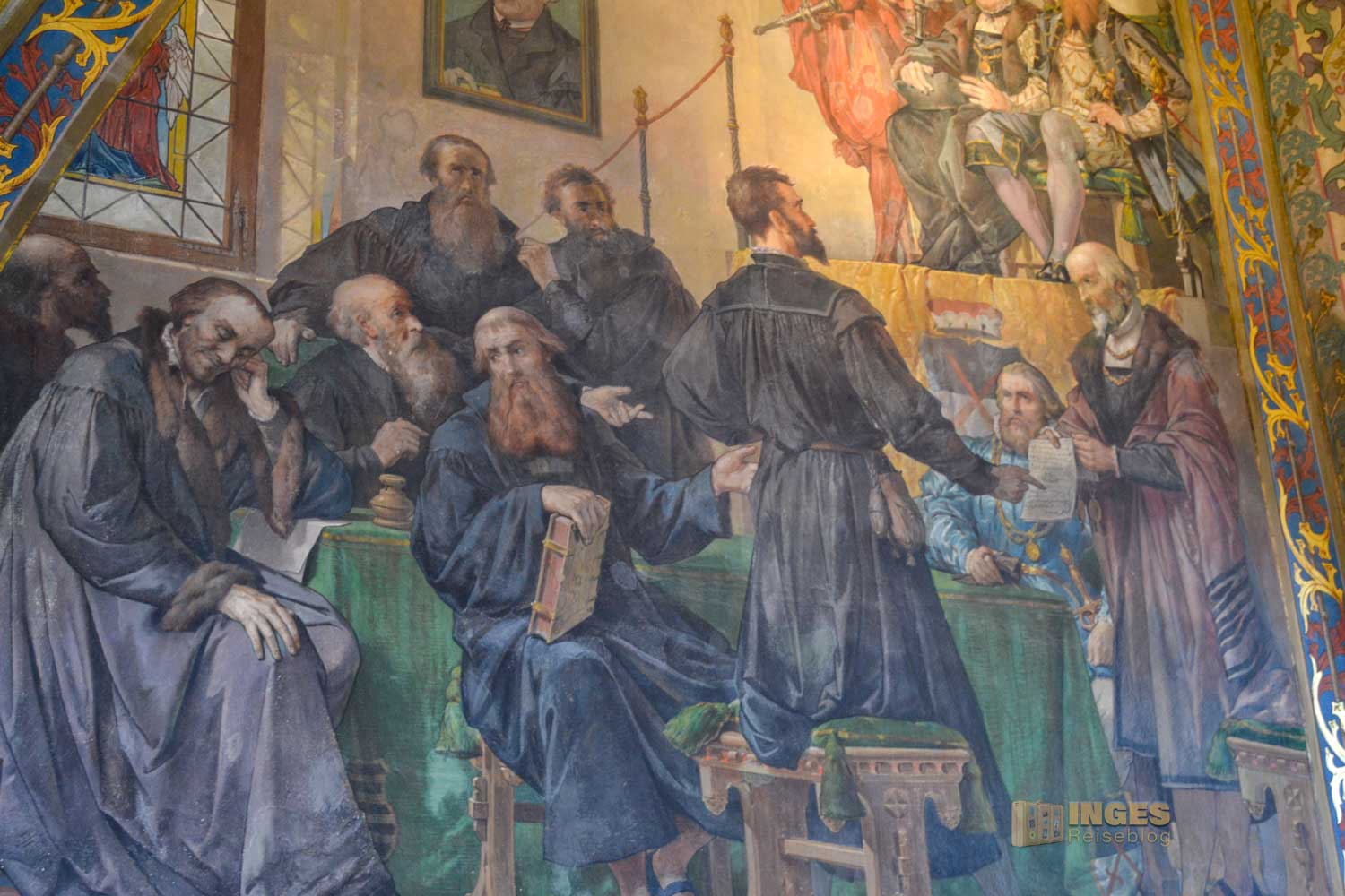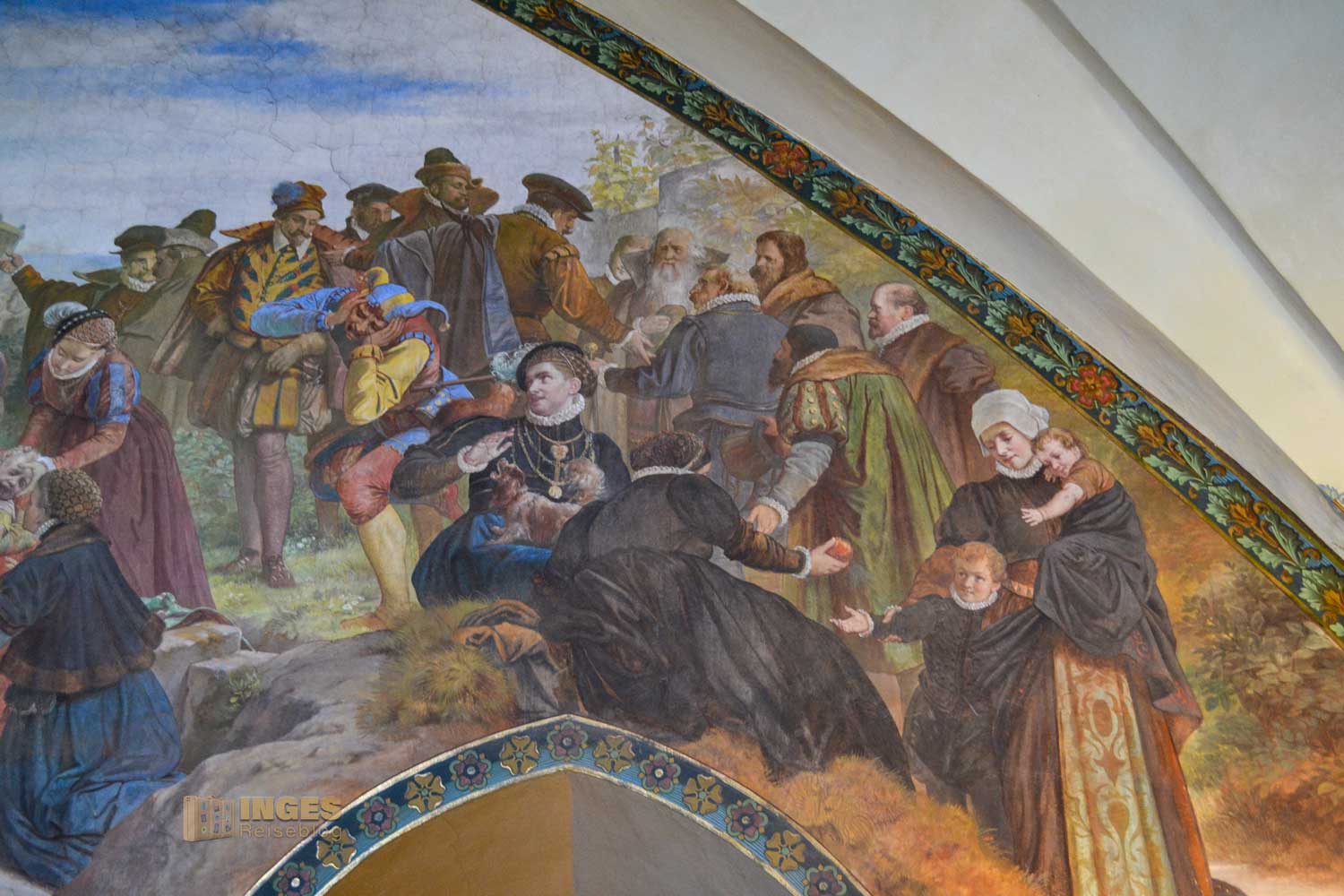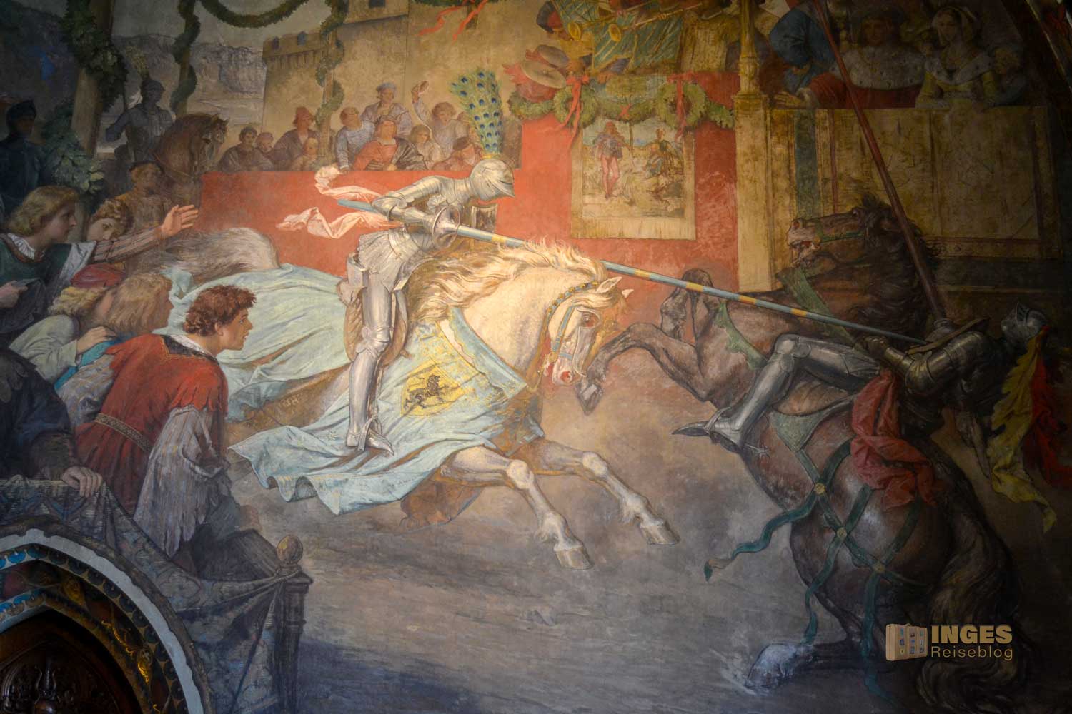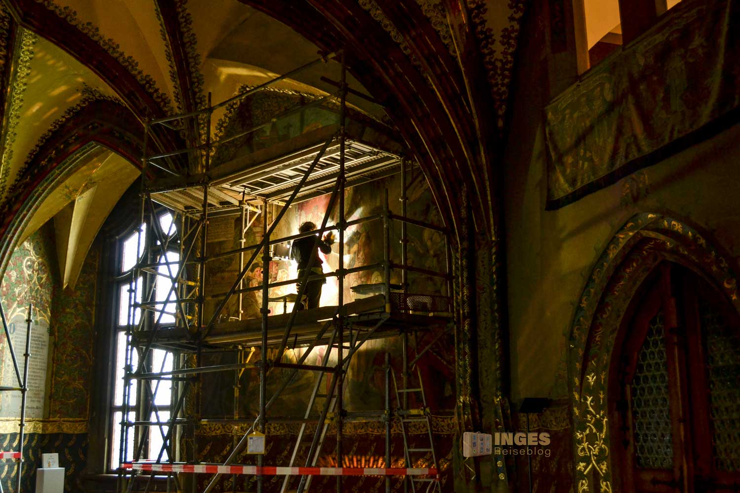 34 Meter lang und 13,5 Meter breit ist dieser beeindruckende Saal. Herrscherfiguren, samt König Heinrich I., der Wettiner oder Johann Georg II., Kurfürst zu Sachsen haben hier ihre Plätze. Wunderschöne Historienbilder und -texte zieren die Wände. Ein Saal, dem man Zeit geben darf ihn zu erkunden. Und dass Restaurierungen in diesen 'alten' wunderschönen Gemäuern immer notwendig sind, war an den beiden fleißigen Restauratoren auf ihren hohen Gerüsten sichtbar.