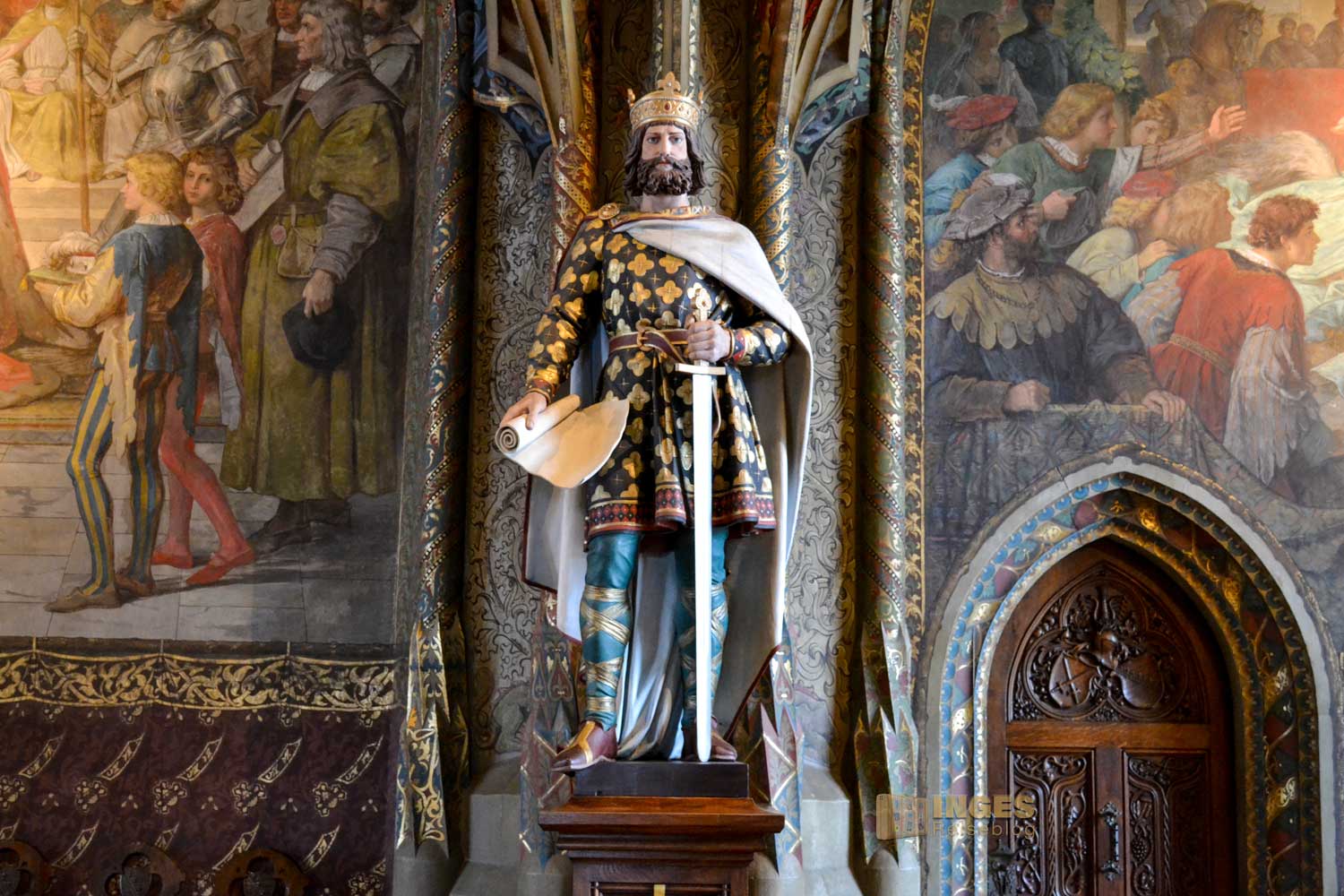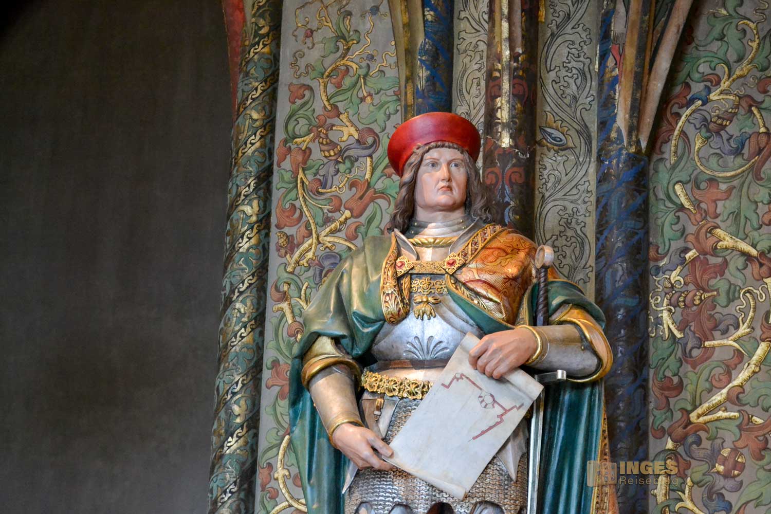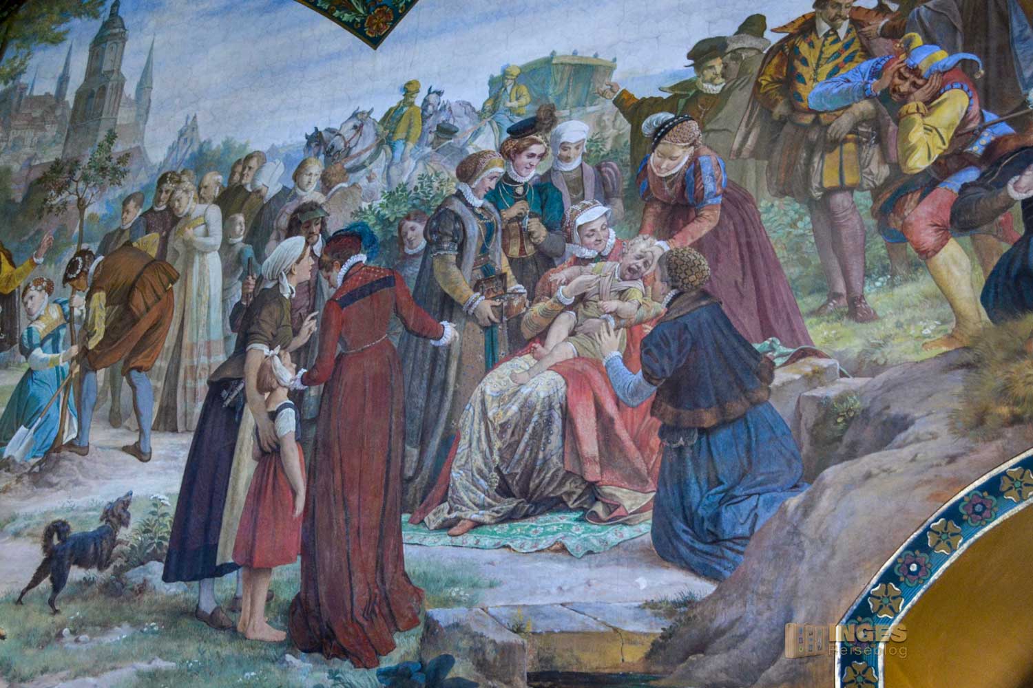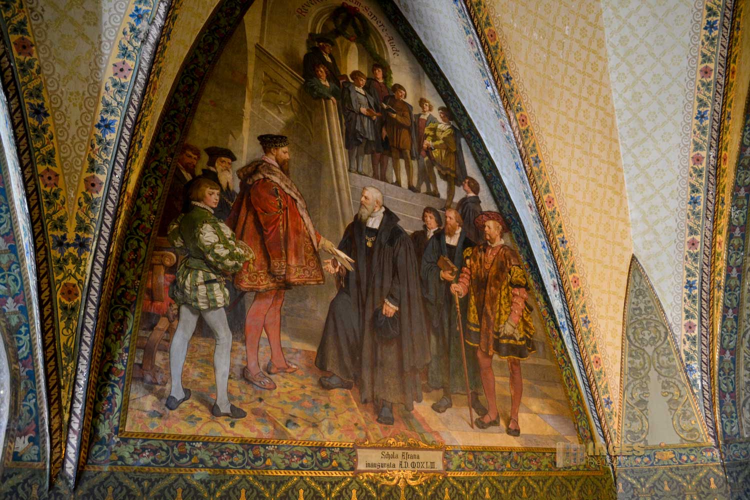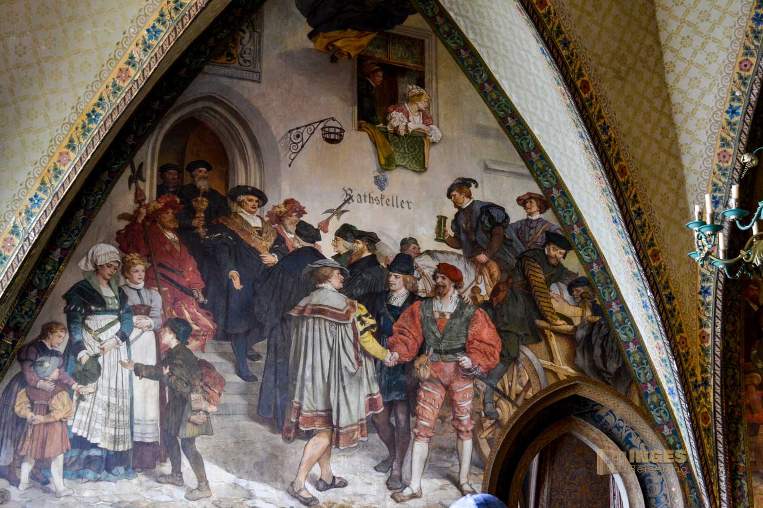 34 Meter lang und 13,5 Meter breit ist dieser beeindruckende Saal. Herrscherfiguren, samt König Heinrich I., der Wettiner oder Johann Georg II., Kurfürst zu Sachsen haben hier ihre Plätze. Wunderschöne Historienbilder und -texte zieren die Wände. Ein Saal, dem man Zeit geben darf ihn zu erkunden. Und dass Restaurierungen in diesen 'alten' wunderschönen Gemäuern immer notwendig sind, war an den beiden fleißigen Restauratoren auf ihren hohen Gerüsten sichtbar.