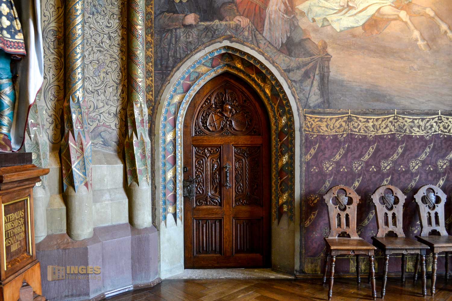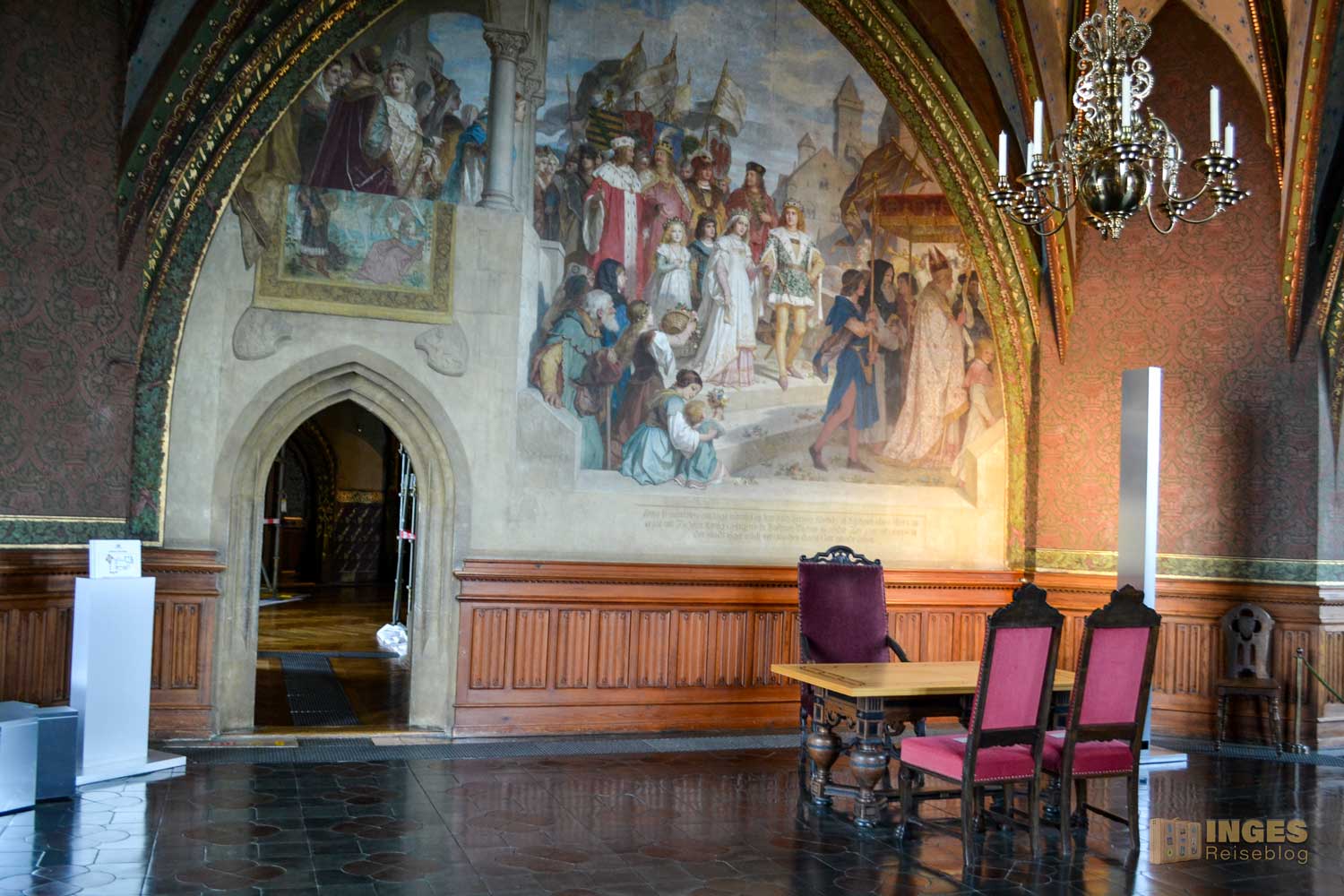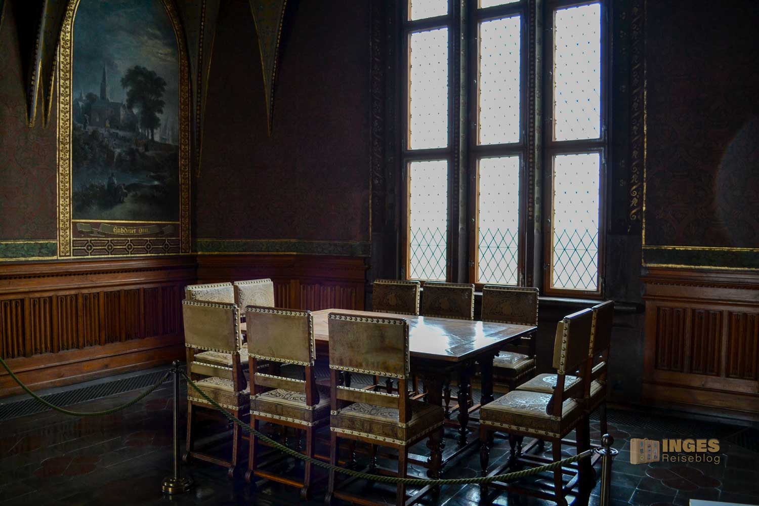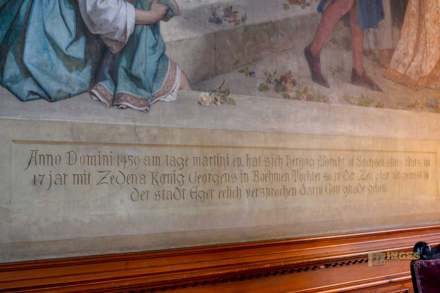 Wieder das 'kleine' Besondere, der Raum wird auch als Standesamt genutzt. Und was würde als Gemälde in diesen Raum besser passen, wie die Hochzeit zwischen Albrecht und seiner Braut Zedena. Wunderschön auch die kleinen Details an den Möbeln ....