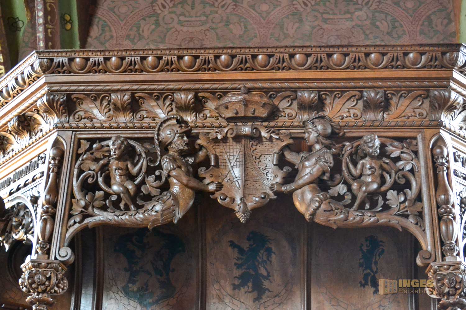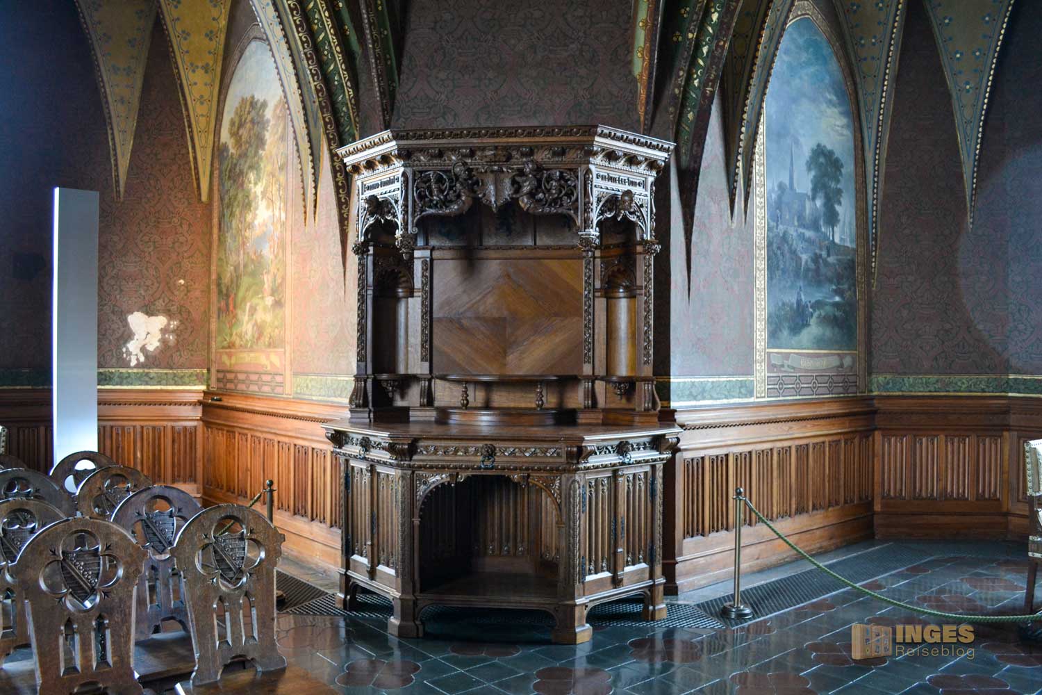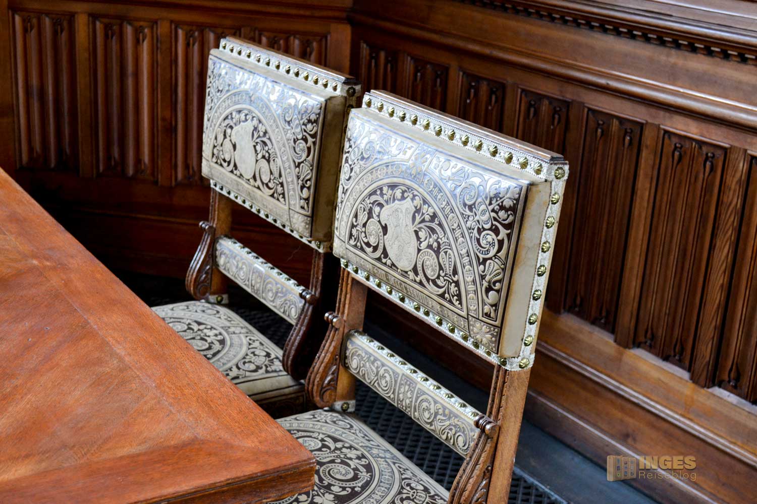 Wieder das 'kleine' Besondere, der Raum wird auch als Standesamt genutzt. Und was würde als Gemälde in diesen Raum besser passen, wie die Hochzeit zwischen Albrecht und seiner Braut Zedena. Wunderschön auch die kleinen Details an den Möbeln ....