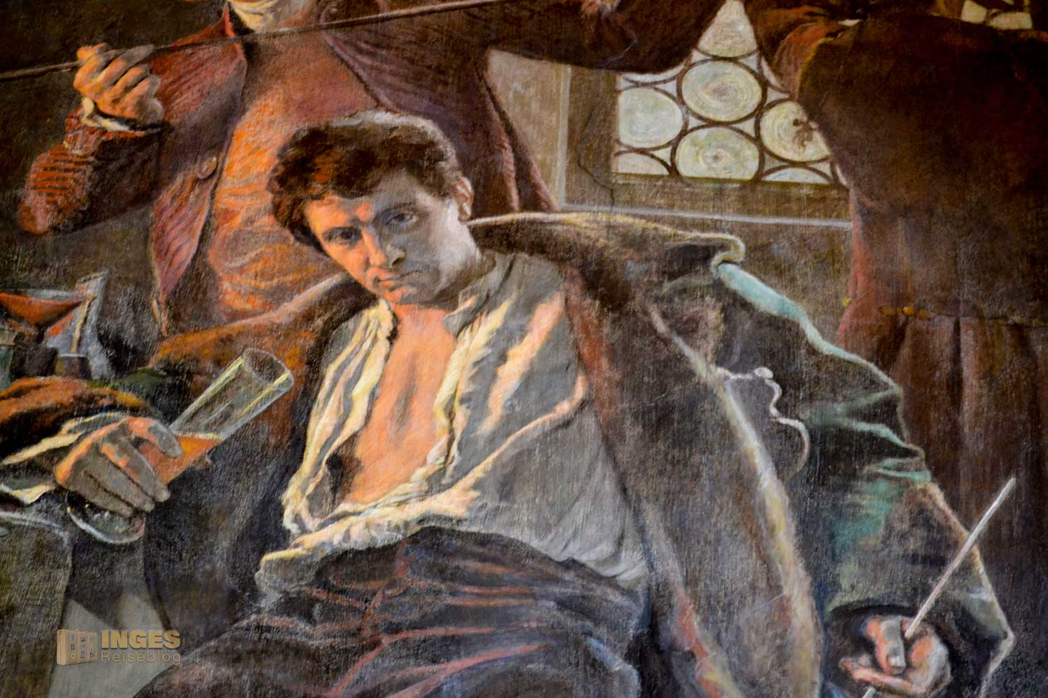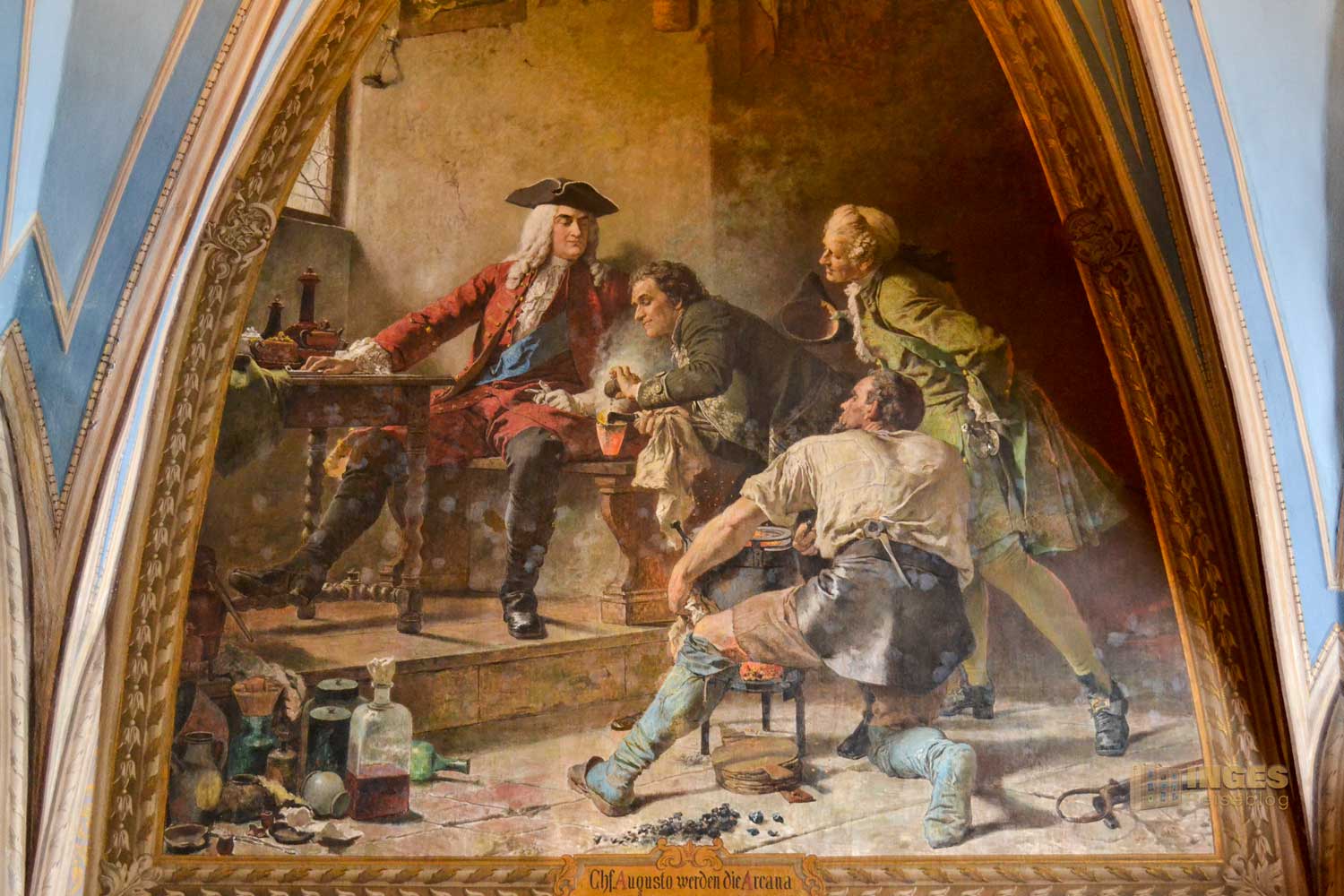Leben wurde der Albrechtsburg erst Anfang des 18. Jahrhunderts durch August den Starken eingehaucht. 1708 wurde das europäische Porzellan erfunden und August der Starke ließ 1710 die erste europäische Porzellanmanufaktur im Schloss Albrechtsburg einrichten. Er dachte, hoch auf dem Berg, isoliert und bewacht, ist das Geheimnis der Porzellanherstellung sicherer als in Dresden. Nachdem Mitte des 19. Jahrhunderts die Manufaktur in ein neu erbautes Fabrikgebäude umsiedelte, stand das Schloss wieder leer. Das triste Schloss mit einem fehlenden Mobiliar sollte durch neu geschaffene Wandbilder aufgepeppt werden. Und so begann 1875 die Ausmalung der Schlossräume, die heute den umfangreichsten Bestand an Historienmalerei in Sachsen darstellt. Und ich hoffe, dass ihr nachher beim Rundgang durch das Schloss vielleicht genauso begeistert über diese Malereien seid, wie ich es war, als ich davor stand.