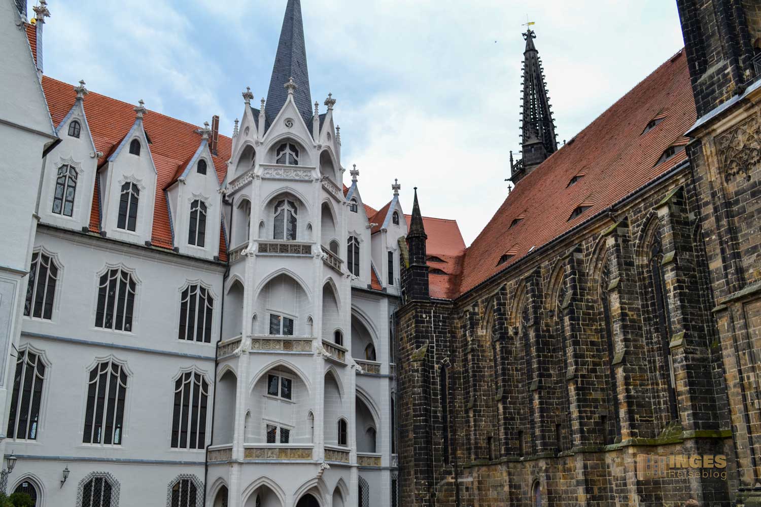 Auf diesem Weg nach oben sieht man aber nur einen Teil von dem, was einen oben auf dem Burgberg tatsächlich erwartet. Steht man dann vor der Albrechtsburg und schaut an ihr hoch, dann fühlt man sich so klein wie David vor Goliath. Die Burg ist ein Teil einer ganzen Burganlage, direkt verbunden mit dem Dom von Meißen.