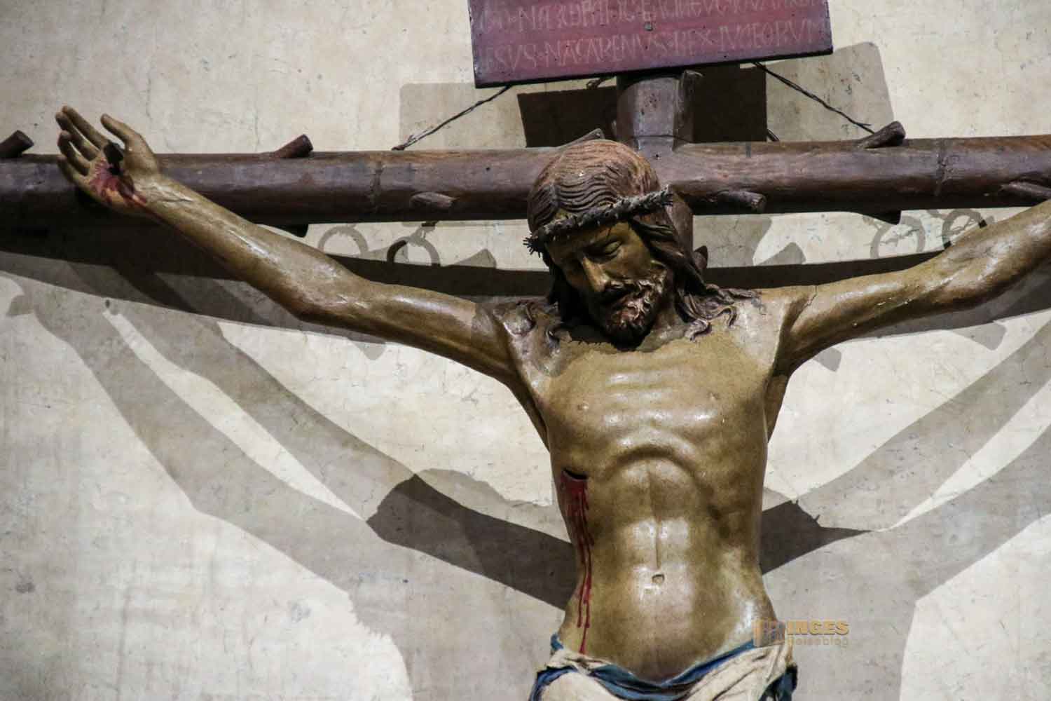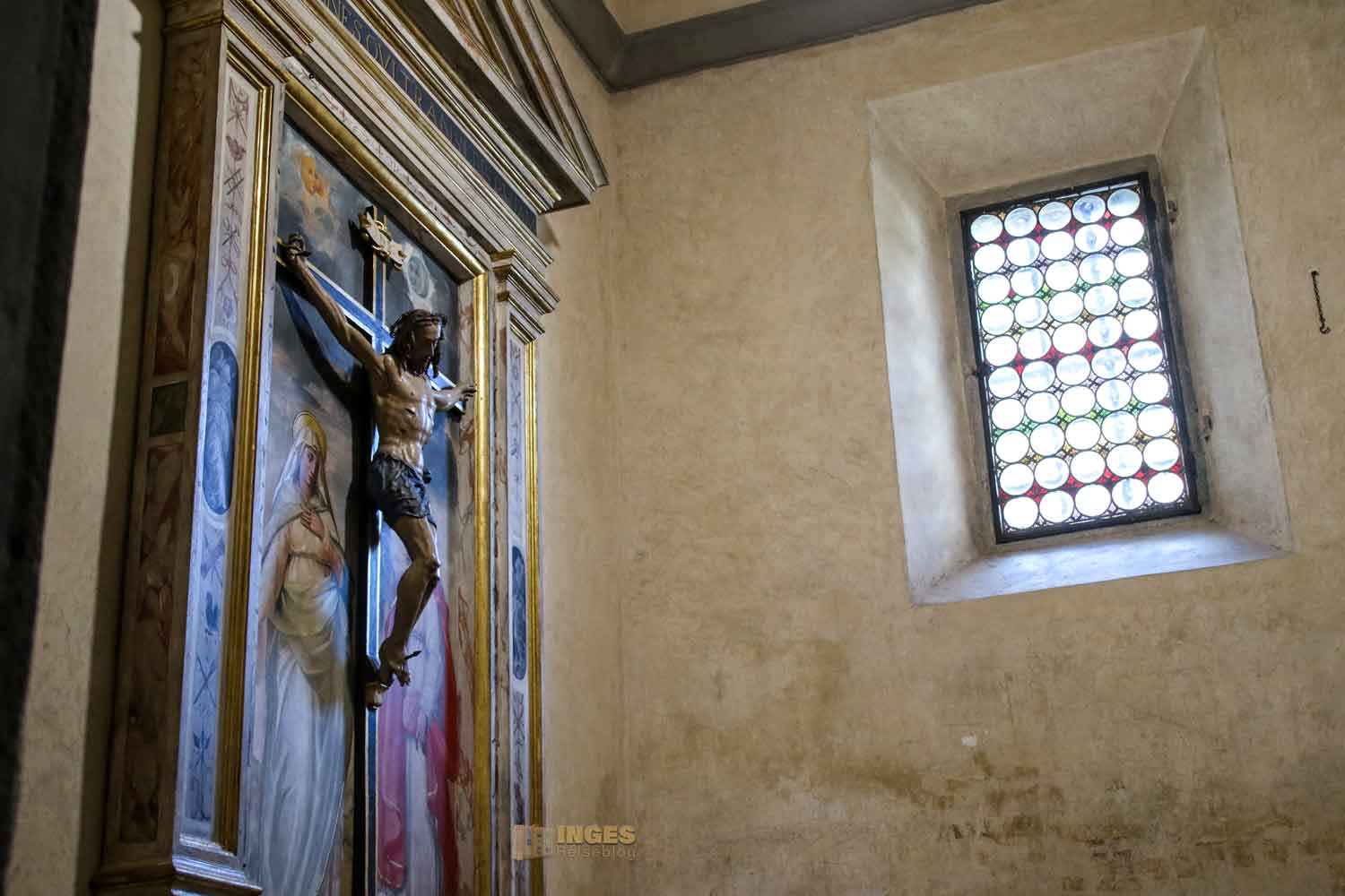 der schlicht in einer Nische platziert ist. Das Kruzifix stammt aus der zweiten Hälfte des 15. Jahrhundert.