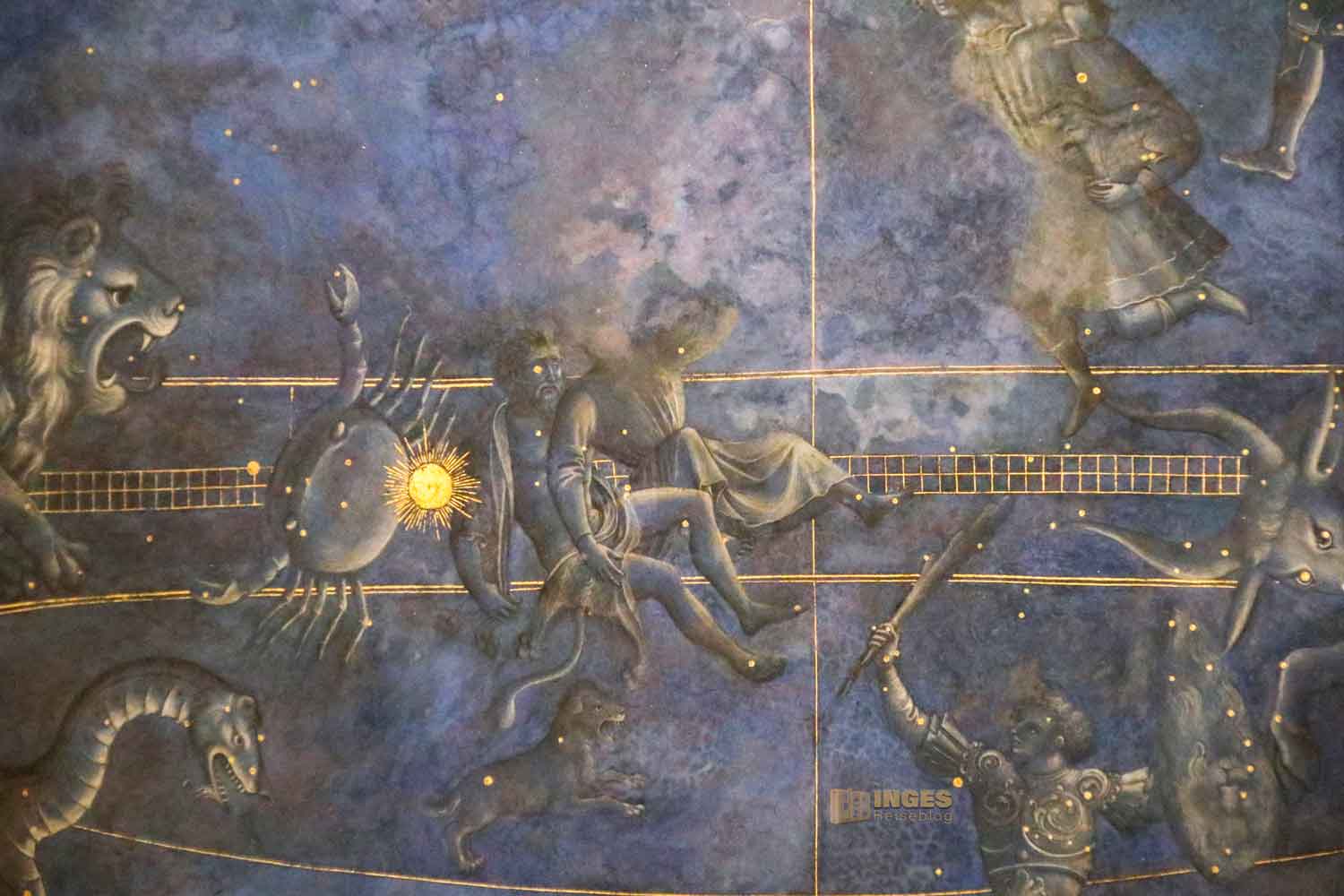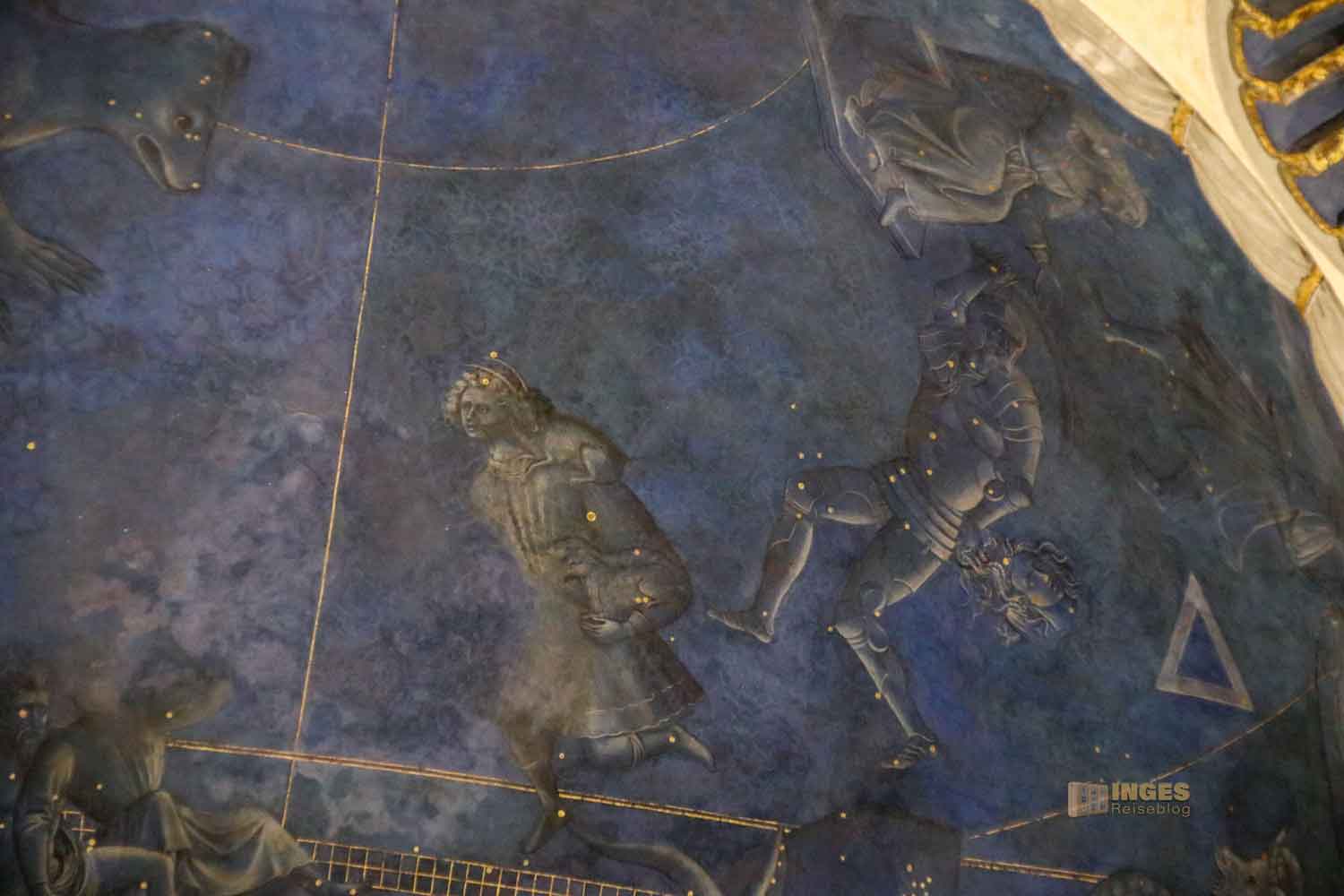 zeigt eine Darstellung, die ich bis dato noch in keiner Kirche gesehen habe. Ich musste zweimal schauen - sind das Sternbilder? Meine 'Emma' ist mir ja immer treu zur Seite, aber in diesen vier Wochen in Florenz ganz besonders, und hat mir ganz viele Darstellungen nah herangeholt. Ja, das sind Sternbilder - der Kosmos in der Kuppel über dem Altar. Einfach zufällige, oder hatten die eine Bedeutung? Wie ihr mich kennt, ich habe gesucht und fand eine Untersuchung von 1911 die besagt, dass die Berechnung auf den 9. Juli 1422, dem Tag der Altarweihe, deutet. Nein, nein meinten andere, das deutet auf 1439 hin, auf die Schlusssitzung des Konzils von Florenz, die in einer zweiten Meinung bestätigt worden ist.