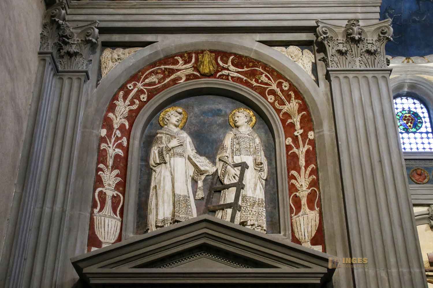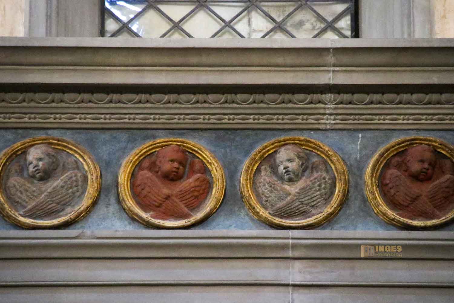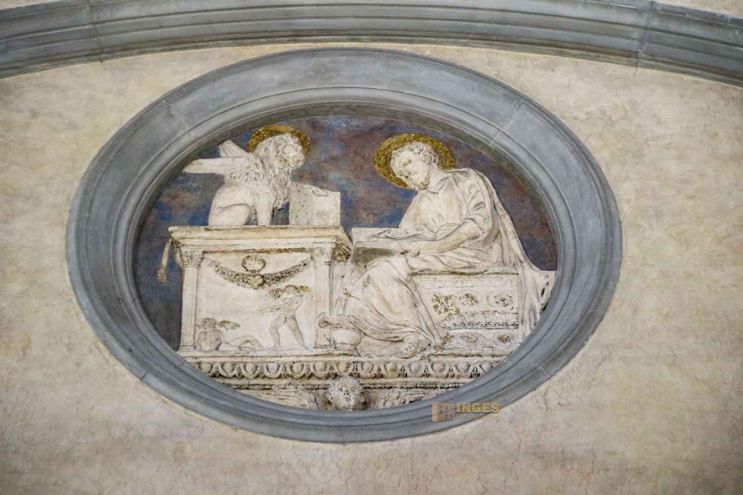 Man kann sich vermutlich lebhaft vorstellen, wie das bei Brunelleschi angekommen sein mag. Er, der für nüchterne Formen und Kargheit in der Ausschmückung stand, muss wohl den Auftrag an Donatello akzeptieren. Dieser hat in vier Reliefmedaillons die Evangelisten dargestellt. In weiteren vier farbenfrohen Medaillons sind Szenen aus dem Leben des Namenspatrons des Stifters, dem Hl. Johannes des Evangelisten, zu sehen. Und natürlich darf das Wappen des Gönners nicht fehlen. Geht man mit offenen Augen durch Florenz, sieht man die Kugeln an vielen Gebäuden der Stadt.