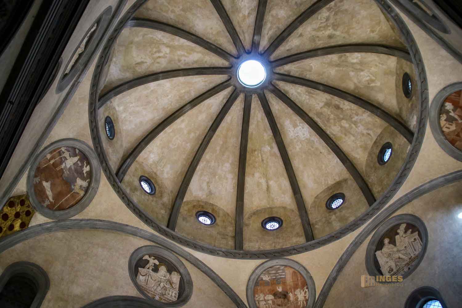 und vor allem in Florenz und in der Renaissance sieht man so gut wie in jeder Kirche. Insgesamt ist es ja eine Wissenschaft für sich, und wenn ihr mehr über Kuppelbauten nachlesen möchtet, dann habe ich HIER eine tolle Abhandlung dazu gefunden. In der Religion erklärt sich der Kuppelbau, vereinfacht ausgedrückt, mit dem Übergang des irdischen Lebens in die Unsterblichkeit des Himmels. Wenn man dieser Symbolik dann noch zugrunde legt, dass, wie auch hier in der Sakristei, die letzten Ruhestätten von Persönlichkeiten sind, macht diese Erklärung Sinn. Ein komplexes Thema, ich zeig euch jetzt lieber die Kuppel in der Alten Sakristei.