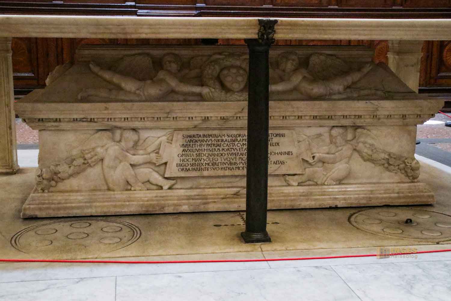 Zusammen mit ihm ruht hier auch seine Ehefrau Piccarda Bueri. 1433 wurde er in der Sakristei aufgestellt, da der Platz in der Mitte aber schon mit einem großen Marmortisch, auf dem die Messgewänder vor dem Gottesdienst bereit gelegt wurden, belegt war, kam der Sarkophag einfach darunter. So ist auch der Spender in der Mitte seiner Kapelle. Immer im Blick des Hl. Laurentius.