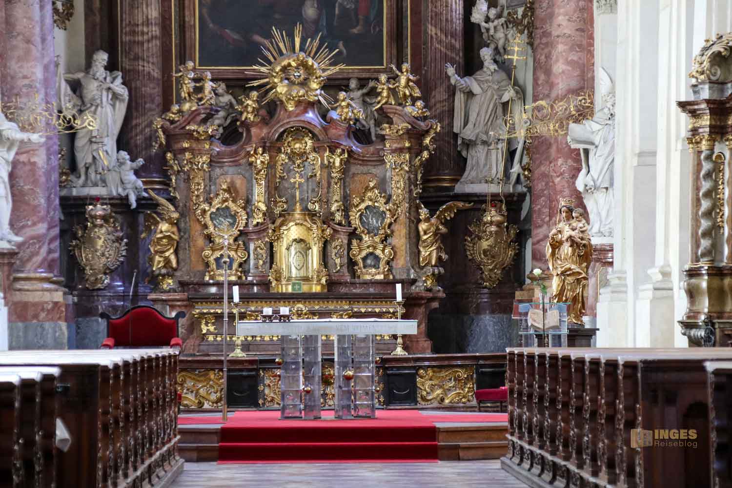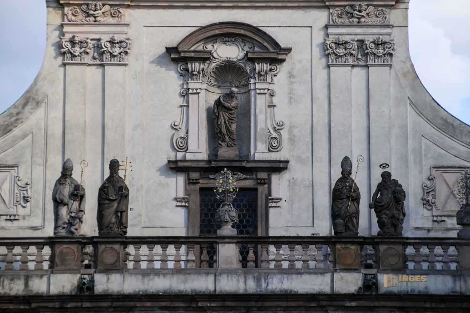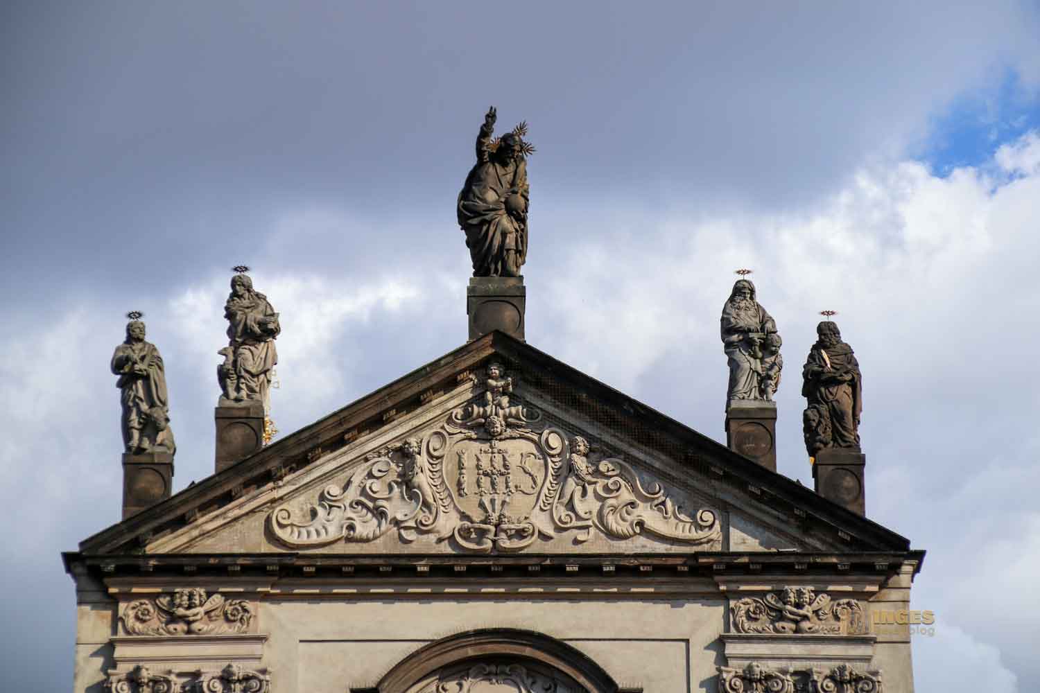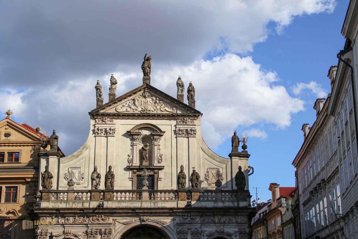 beginnt. Vielleicht werdet ihr, wenn ihr schon in Prag ward, bei den nachfolgenden Fotos sagen ... ach dieeeee Kirche ist das 🙂 Genau dieeee, von der sich auf dem Portalvorbau Statuen das Geschehen auf der Karlsbrücke und auf dem kleinen Kreuzherrenplatz anschauen. Ganz on top natürlich Christus mit den vier Evangelisten Markus, Lukas, Matthäus und Johannes. Weiter unten die Gottesmutter Maria, sowie Kirchenväter und Jesuitenheilige. Warum gerade Jesuitenheilige? Dazu später mehr. Johann Georg Bendl hat sie im 17. Jahrhundert geschaffen.