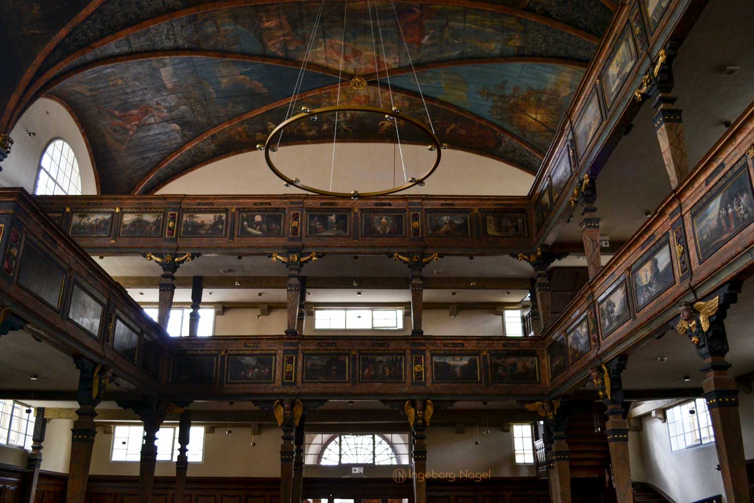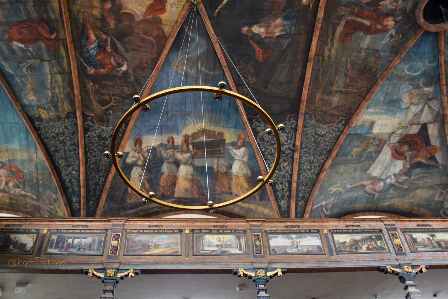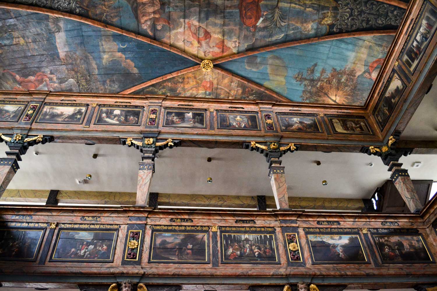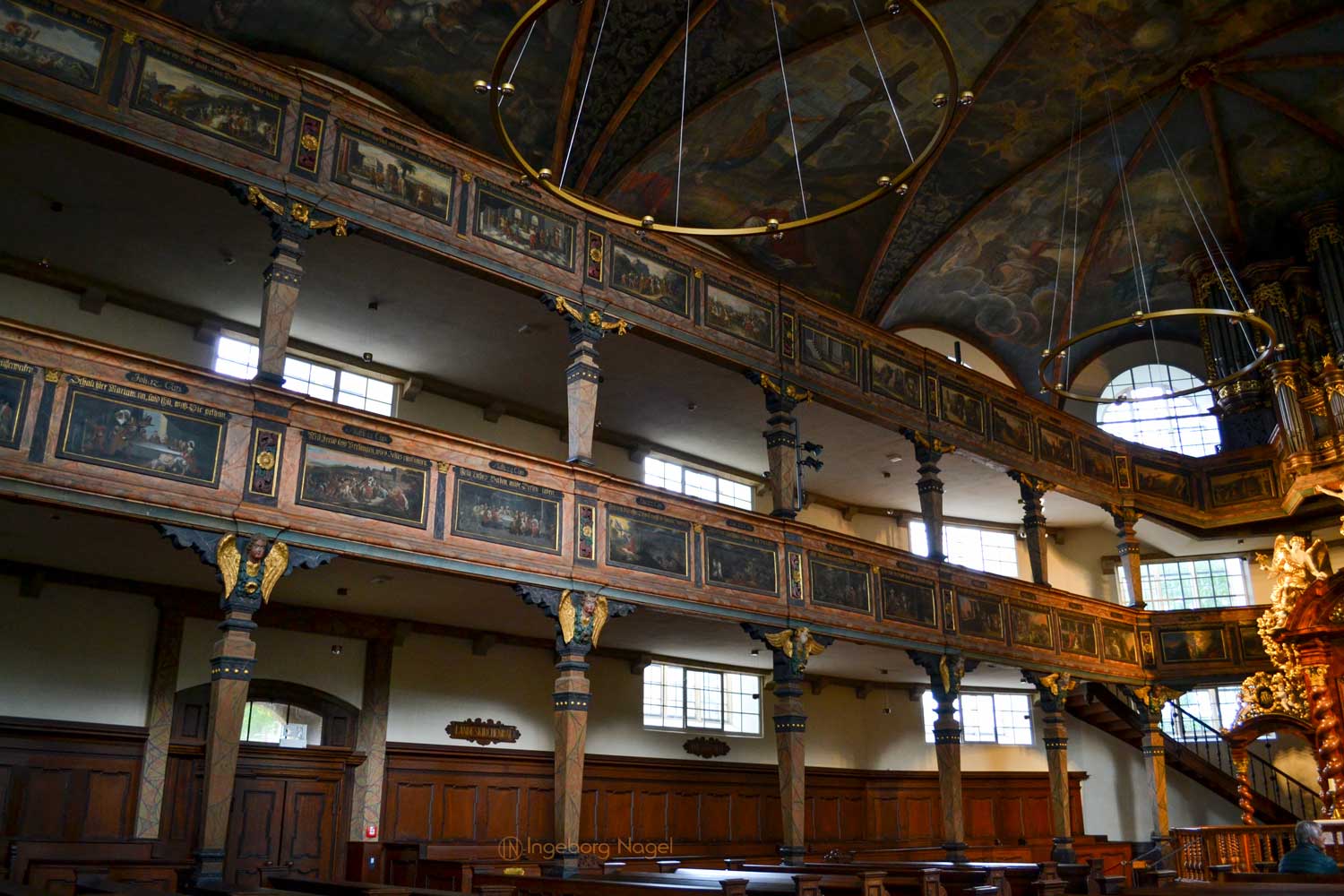Ein WOW hat mir der Innenausbau mit einem hölzernen Rippengewölbe und den zweistöckigen Emporen an drei Seiten, die von Pfeilern getragen sind, entlockt. Beides ist bis heute weitgehendst originalgetreu erhalten, ebenso die wunderschönen Deckengemälden und Emporenbilder, die Szenen aus dem Alten und Neuen Testament zeigen. Von 2015 - 2017 wurden sie aufwändig restauriert.