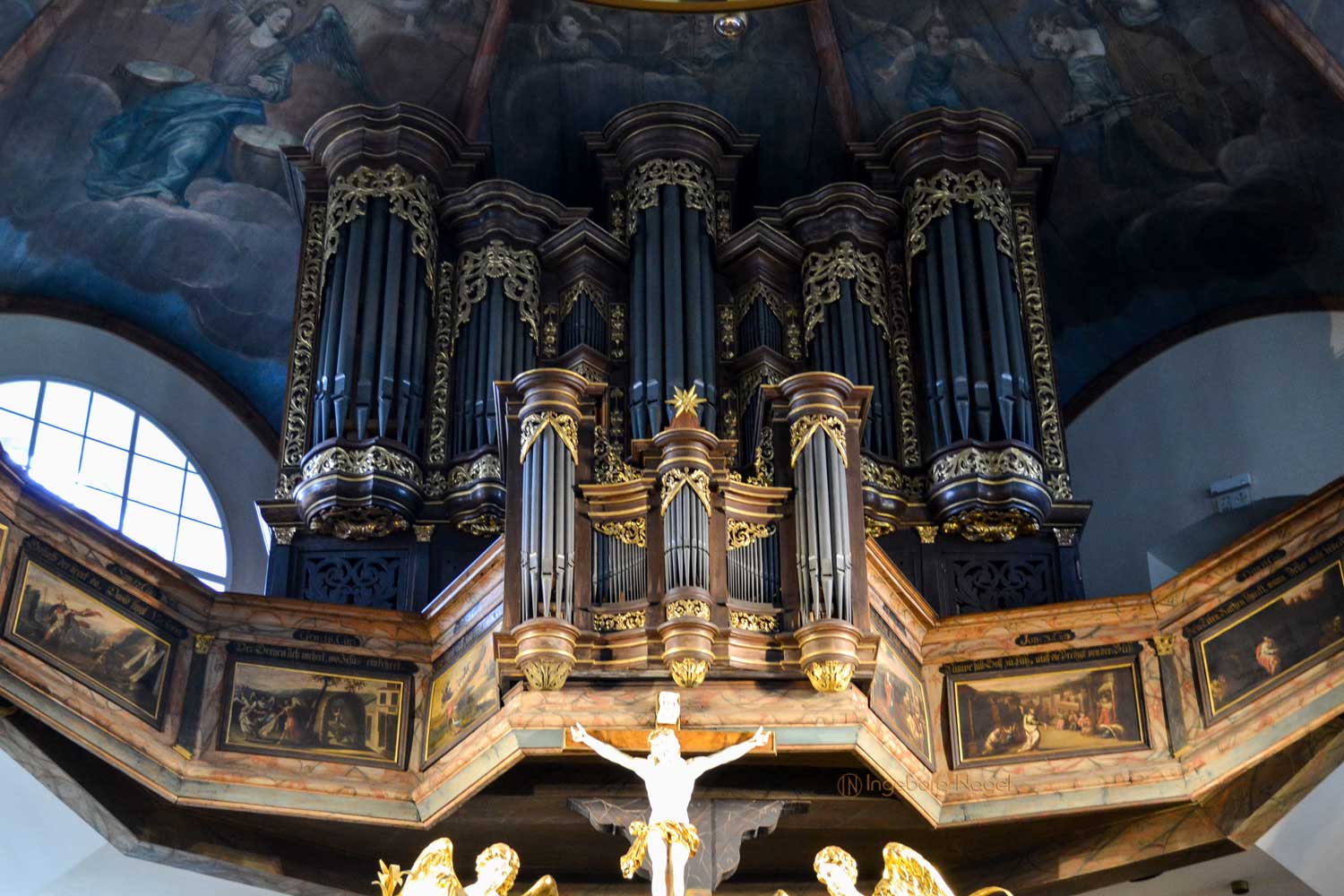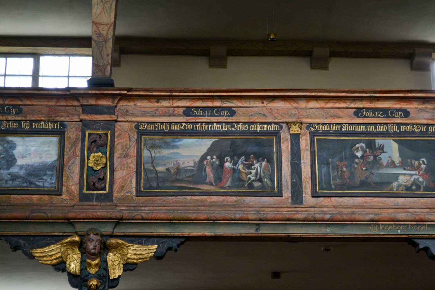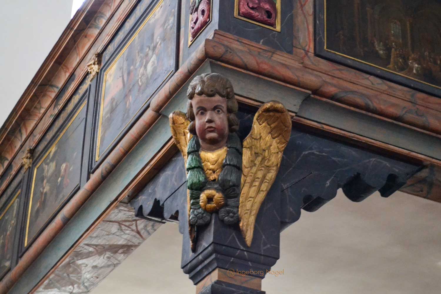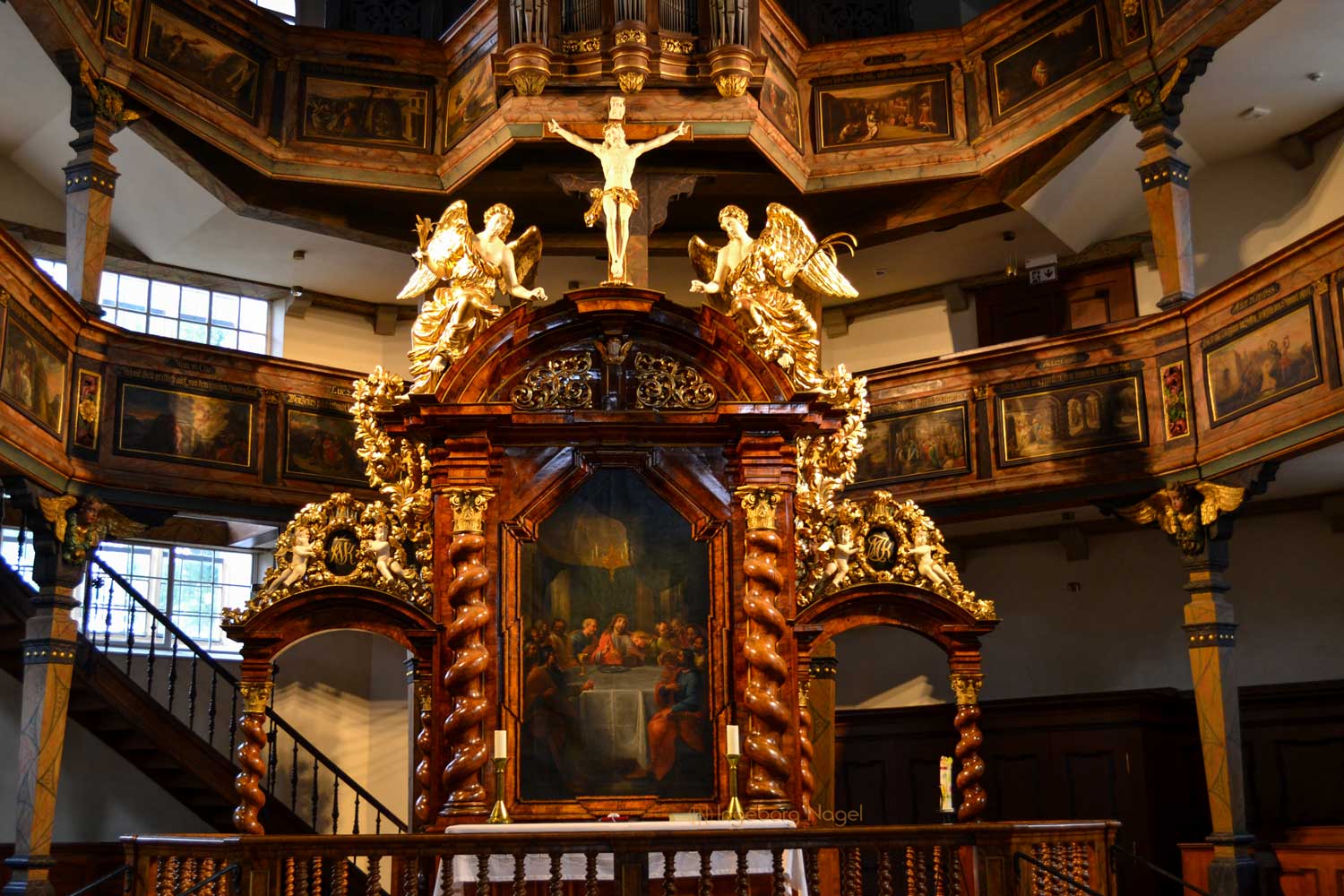 Ein WOW hat mir der Innenausbau mit einem hölzernen Rippengewölbe und den zweistöckigen Emporen an drei Seiten, die von Pfeilern getragen sind, entlockt. Beides ist bis heute weitgehendst originalgetreu erhalten, ebenso die wunderschönen Deckengemälden und Emporenbilder, die Szenen aus dem Alten und Neuen Testament zeigen. Von 2015 - 2017 wurden sie aufwändig restauriert.