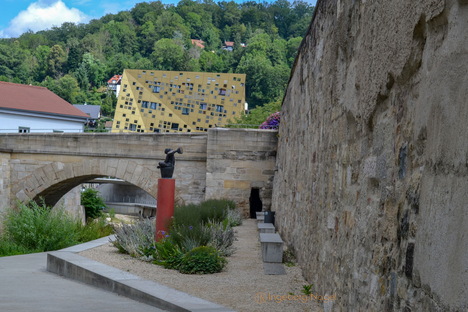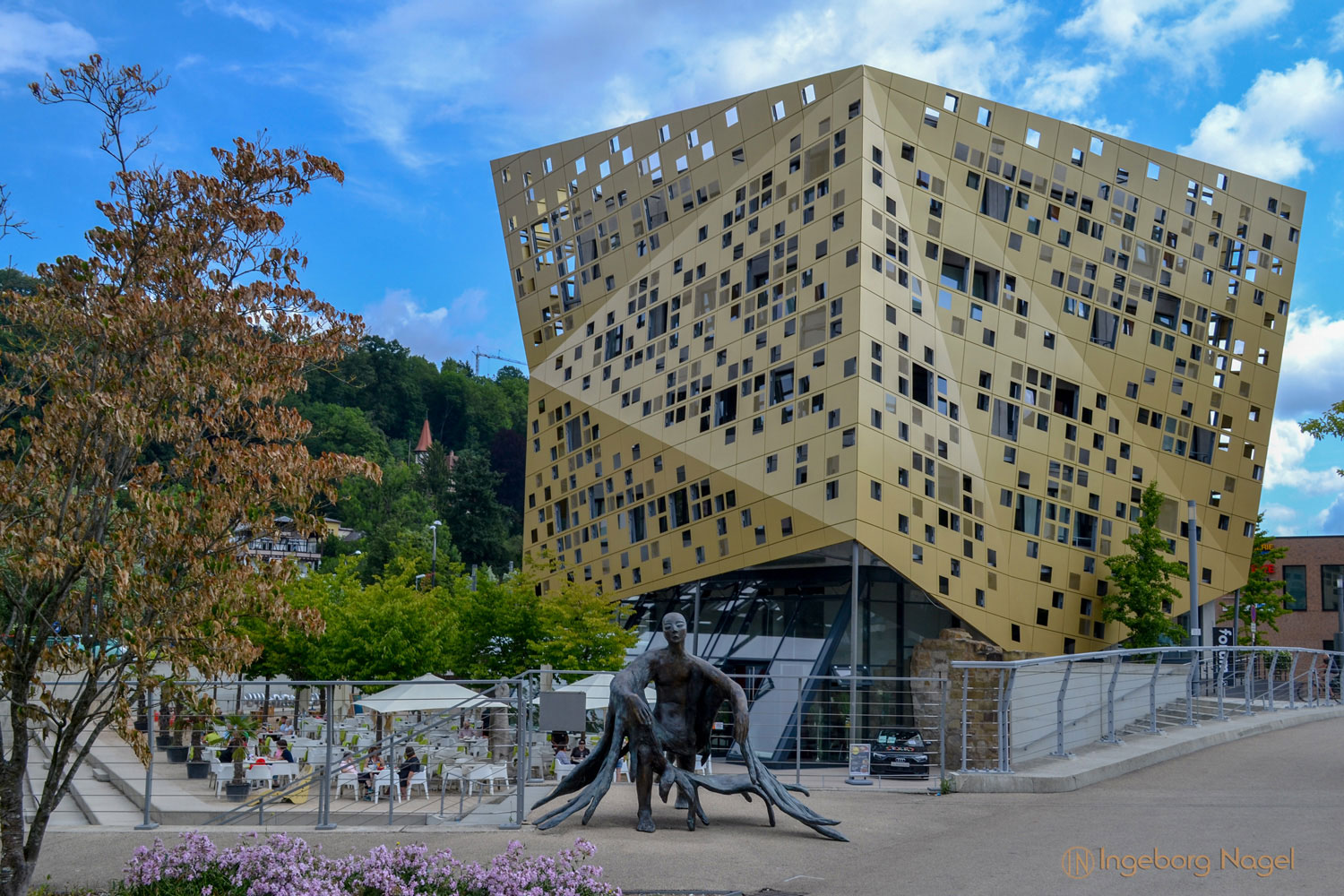 Am Ende des Wasserweges der Grabenallee geht man direkt darauf zu - auf das Wahrzeichen der Bundesgartenschau 2014 und Blickfang von Gmünd, das Gold und Silber Forum, liebevoll unser 'Käsewürfele'.
