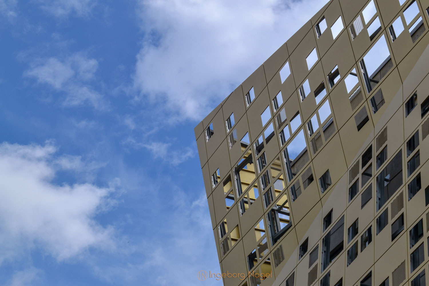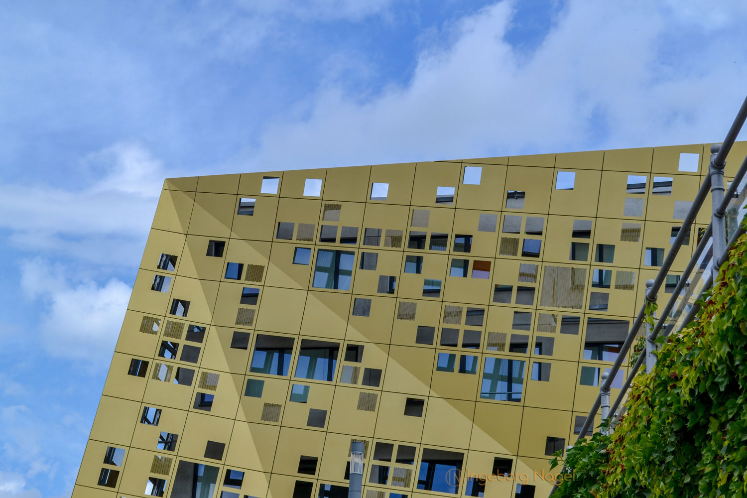 Vorgesetzte Fassadenplatten umhüllen wie ein wertvolles Gewand einen massiven Betonkern. Und je nach Sonnenstand und dem eigenen Standort sorgt die goldfarbene Beschichtung für interessante Blickpunkte und unterstreicht den Ruf der Gold- und Silberstadt.