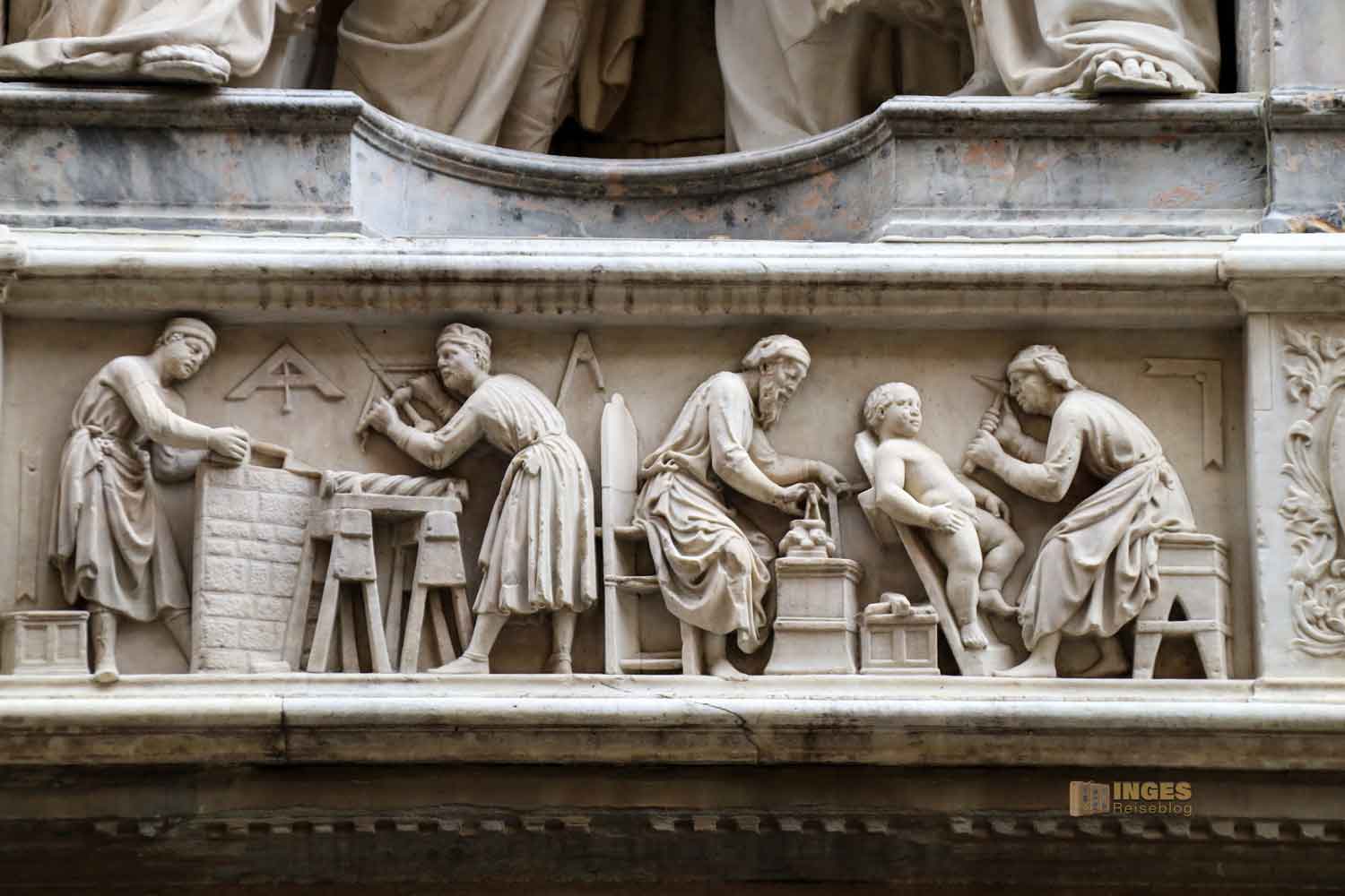 wurden so um 1412 von ihm geschaffen. Der Künstler der Renaissance zeichnet auch für einige Arbeiten am Dom von Florenz verantwortlich. Er stellt das Quartett, die "Quattro Coronati" als Römer dar, kein Wunder, denn unter dem römischen Kaiser Diokletian erlitten die vier Heiligen ihr Martyrium. Unter den vier Herren zeigen Reliefs, welche Zunft für die Nische verantwortlich ist.
