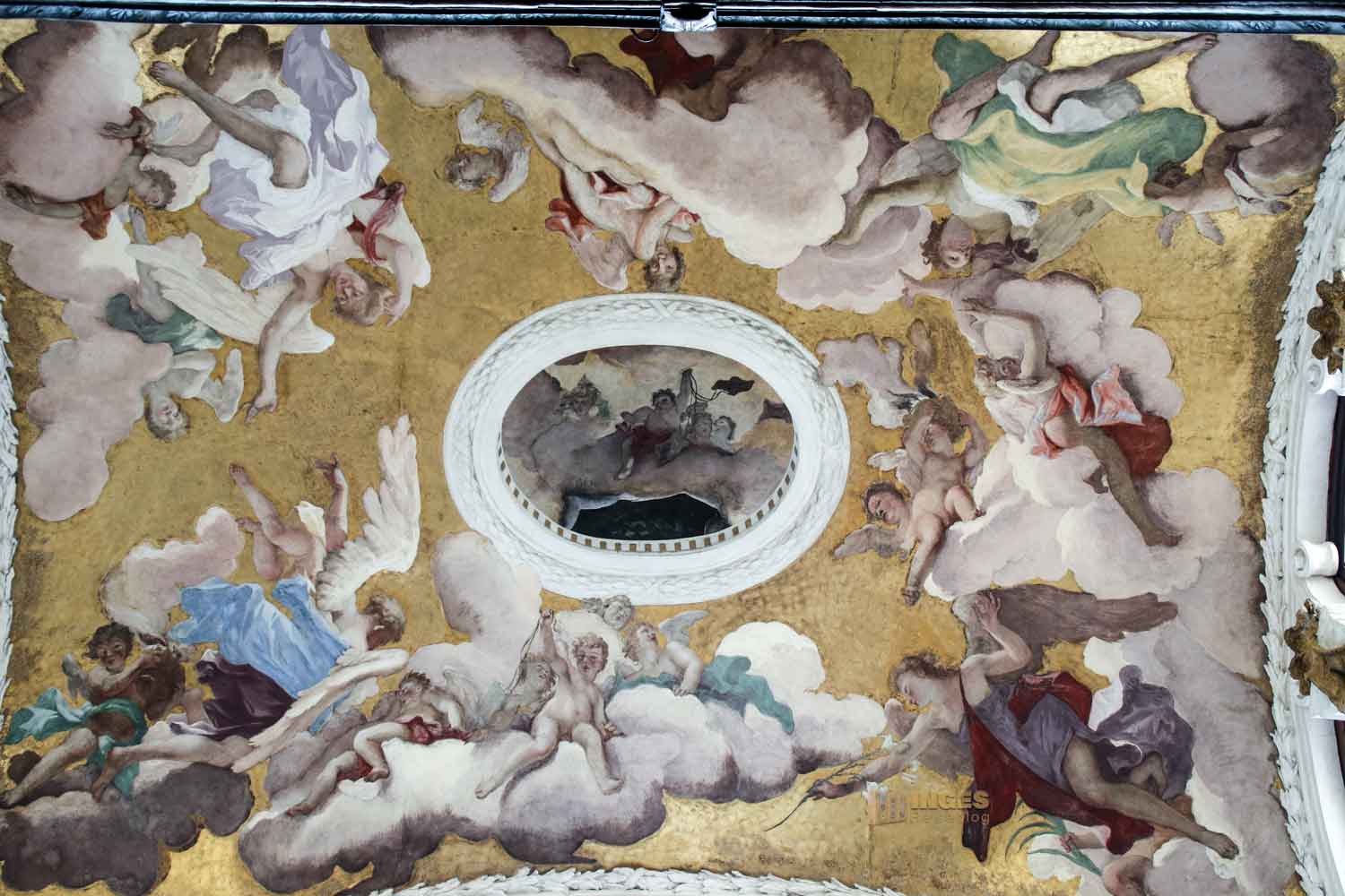 Sorry, dass ich euch hier zum Künstler so gar keine Infos liefern kann. Ich habe diesen Namen nicht im Internet gefunden. Weiß jemand von euch mehr? Von wem die beiden Skulpturen an der Seite sind, darüber hüllt sich kein Nebel. Corradini und Torreto sollen sie geschaffen haben. Sie zeigen die Jungfräulichkeit (Corradini) und die Demut (Torreto). Ganz aus dem Rahmen fiel die Deckenbemalung über dem Altar zu dieser Zeit, die von Sebastiano Ricci 1708 ausgeführt wurde. Der "Engelflug" wurde, zu dieser Zeit ungewöhnlich, auf einen Goldgrund gemalt. Der Altar wurde von der Bruderschaft der Scuol dei Camini gesponsert.