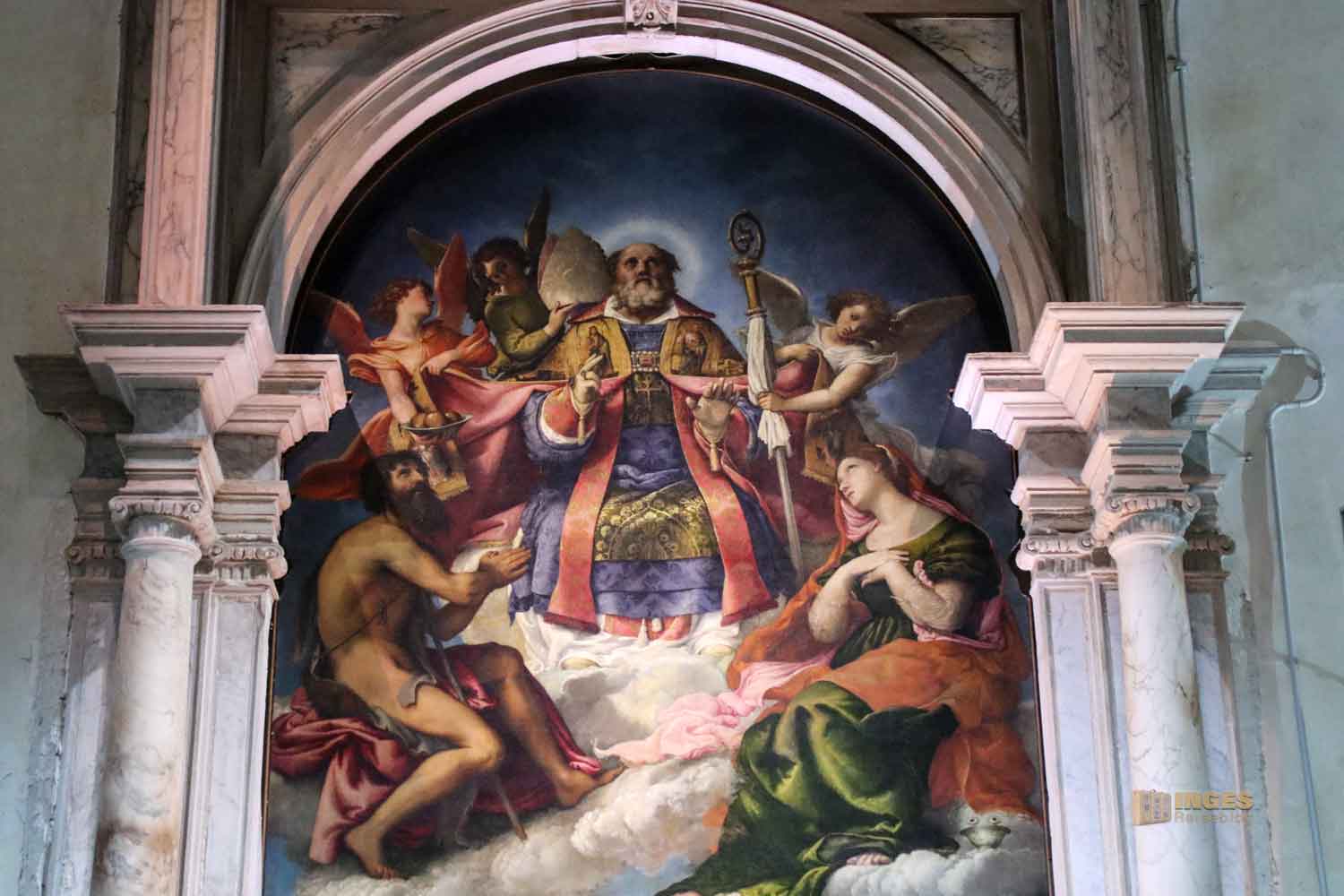 die Lorenzo Lotto zwischen 1527 und 1529 malte. Rechts und links von der Hauptfigur stellt er Johannes den Täufer und die Hl. Lucia dar. Ganz unten, aber da braucht es schon einen genauen Blick um es zu erkennen, soll der Hl. Georg den Drachen töten.