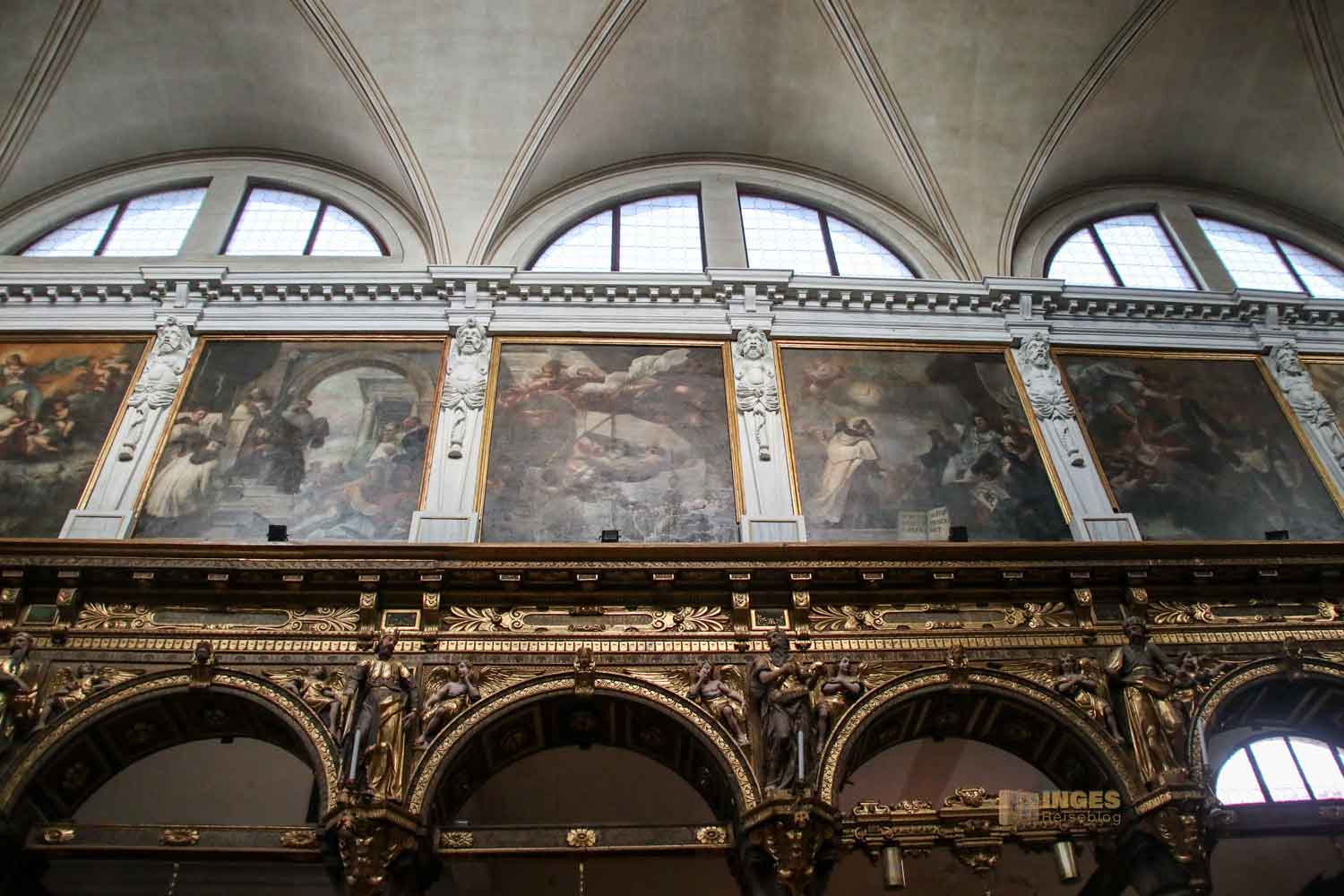 Solche Gesamtaufnahmen in meinen Kirchenberichten sollen aber nicht signalisieren: die Kirche ist nicht gut besucht. Ich kann da sehr geduldig oft 10/15 Minuten warten, bis sich mir dieser Blick bietet. Ihr wisst ja, ich mag kein schmückendes Beiwerk in Form von Menschen auf meinen Fotos. Ich möchte mich selbst auch nicht im Internet auf Fotos wiederfinden. Tja, wie jetzt in dieser reichhaltig ausgestatteten Kirche anfangen? Ich bin den Mittelgang vor zum