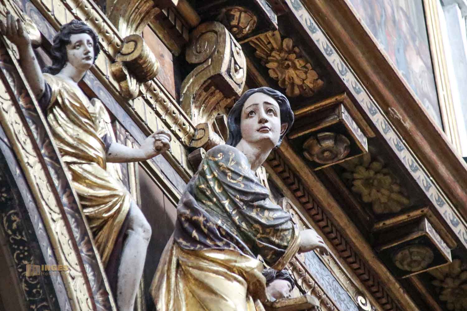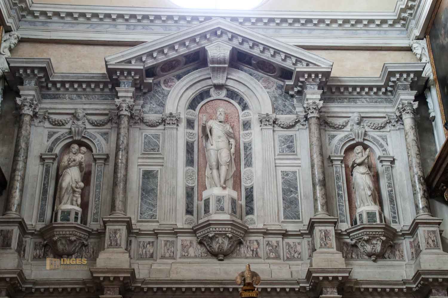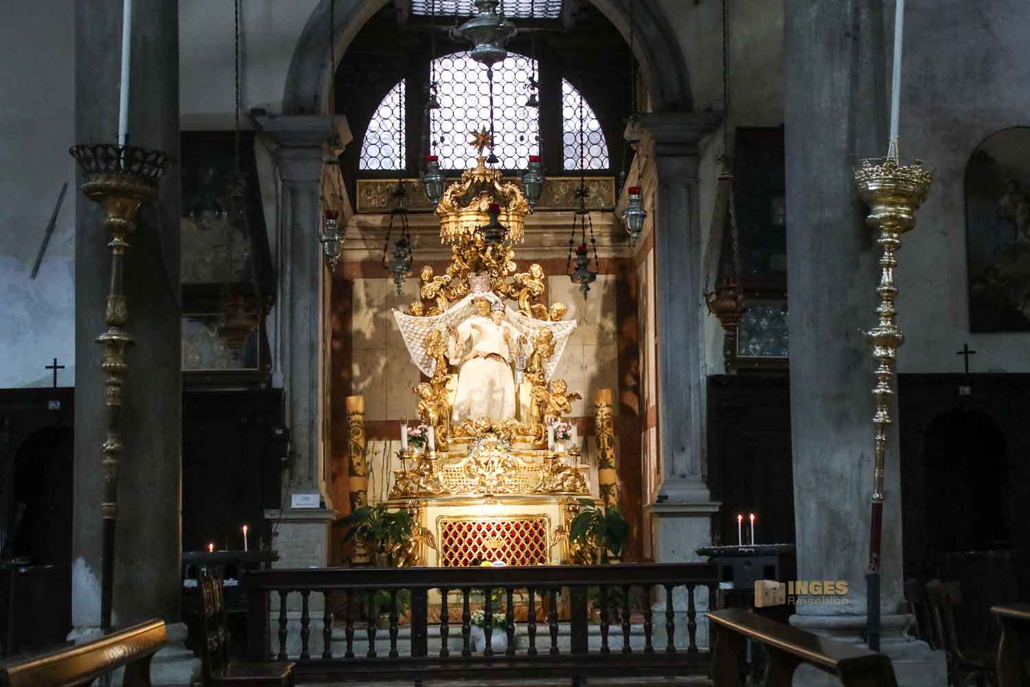 Zwei Engel flankieren den Hochaltar, und etwas versetzt erblickt man das große Altarbild "Maria Himmelfahrt". Es ist eine Kopie des Gemäldes von Tiziano, das in der Frari-Kirche zu sehen ist. Im Chorgestühl aus Holz, links und rechts vom Altar, sind Figuren von Heiligen des Karmeliterordens zu sehen.
