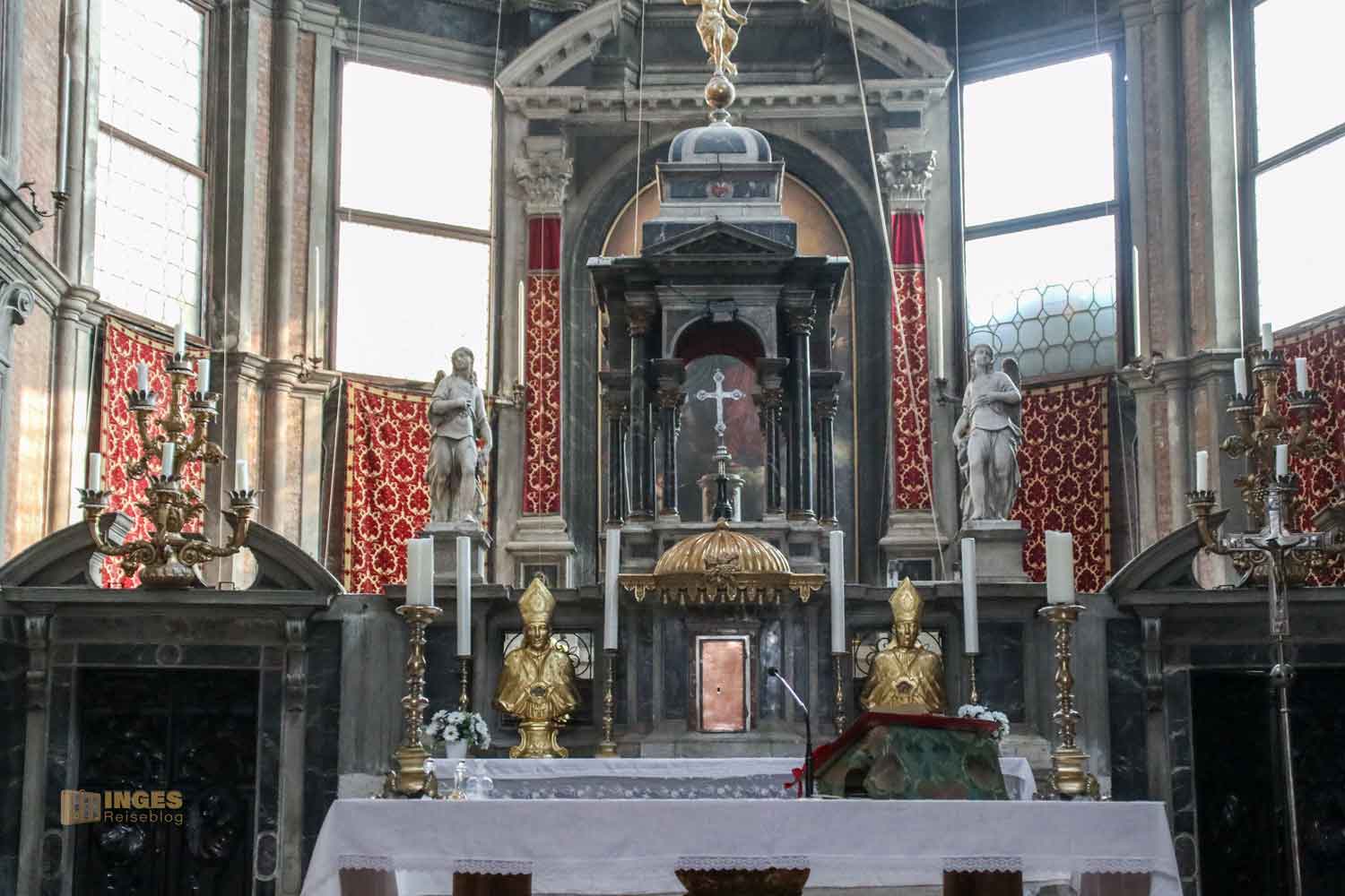 die einfach zu finden ist, wenn man sich am Campo di Santa Margherita orientiert. Wenn! Denn wie so oft haben wir das Feld von der anderen Seite aufgerollt und kamen von der Kirche San Sebastiano durch enge Gässchen zur Kirche. Puhh, da geht es so richtig eng her mit dem Kirchenbau. Ganz ehrlich, da wir auch noch die Scuola Grande dei Carmini gleich nebenan besucht haben, habe ich mich nicht weiter um eine totale Kirchenansicht gekümmert. Geöffnete Türe an der Seite, und zack war Inge drin 😅