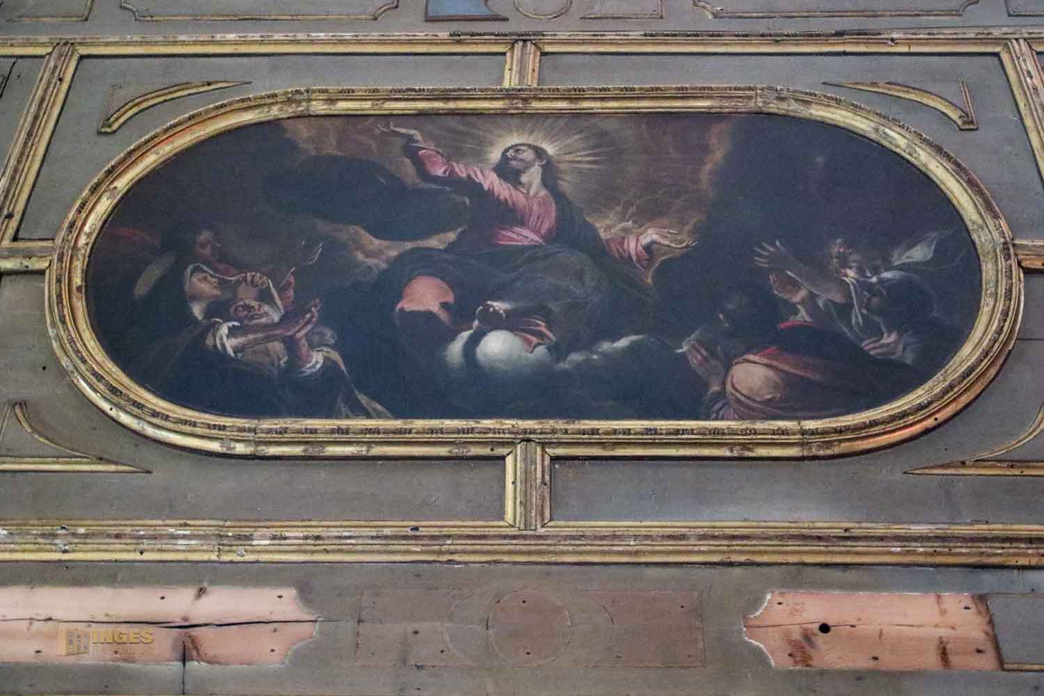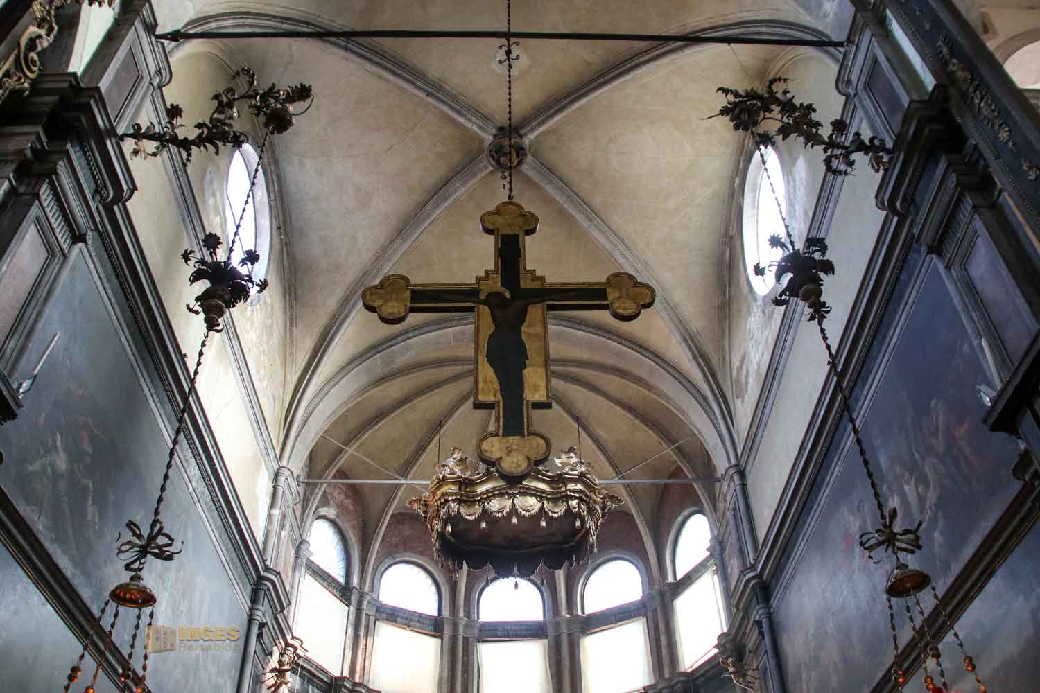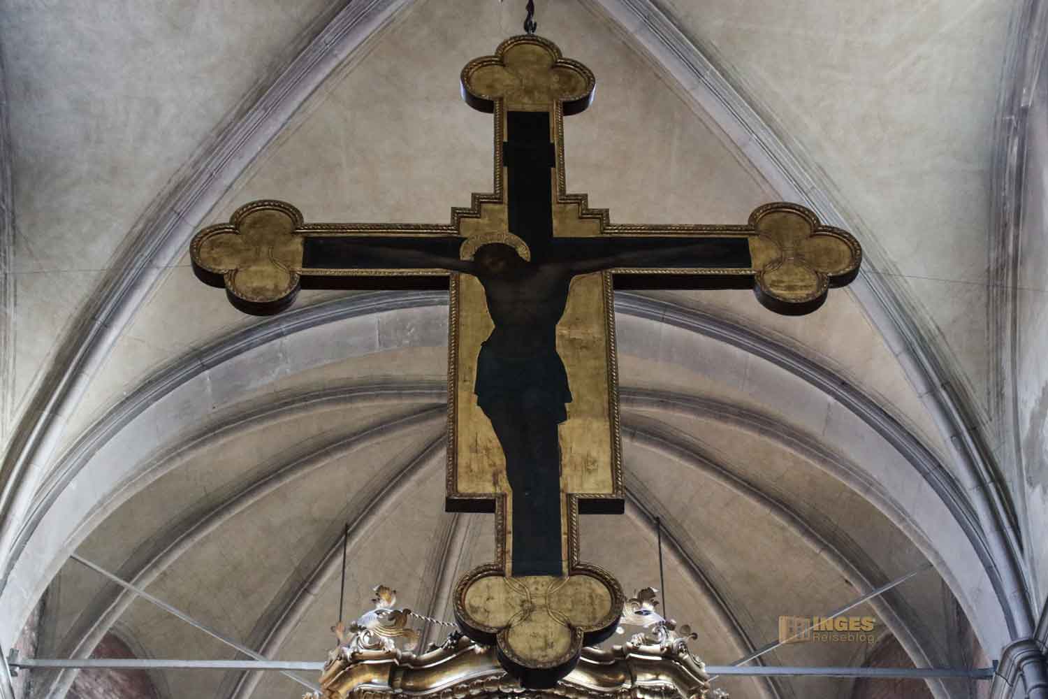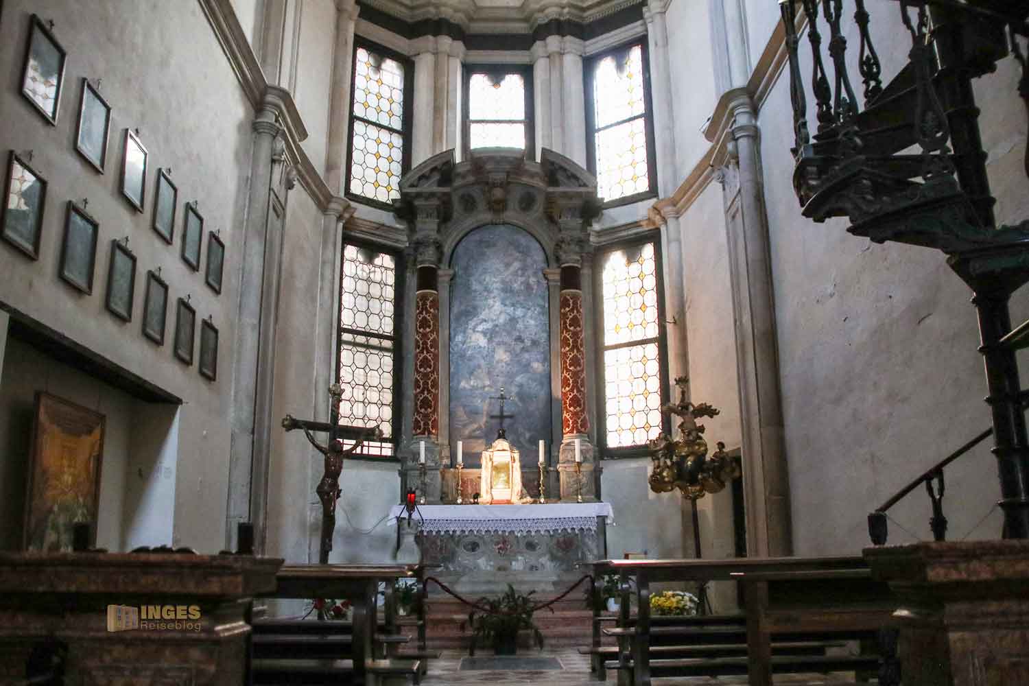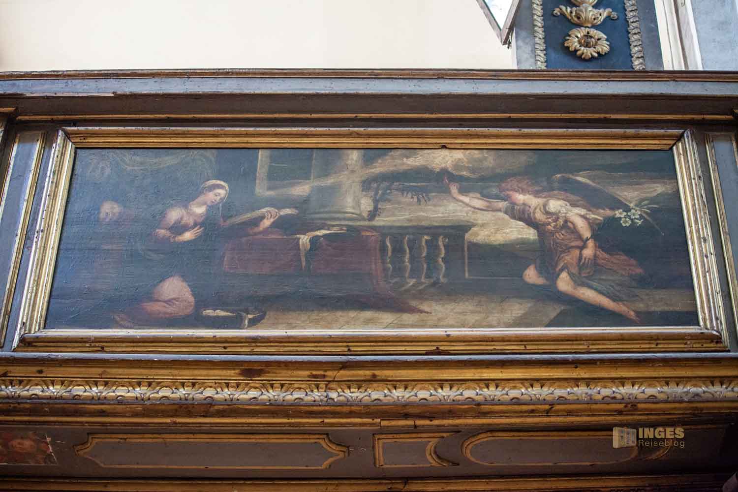 Sofort fällt das hängende Holzkruzifix auf, das Paolo Veneziano Ende des 14. Jahrhunderts gemalt hat. Übergroß rechts und links Gemälde, die 'Emma' leider nicht optimal einfangen konnte. Bedeutet - ihr müsst sie euch selber vor Ort anschauen 😉