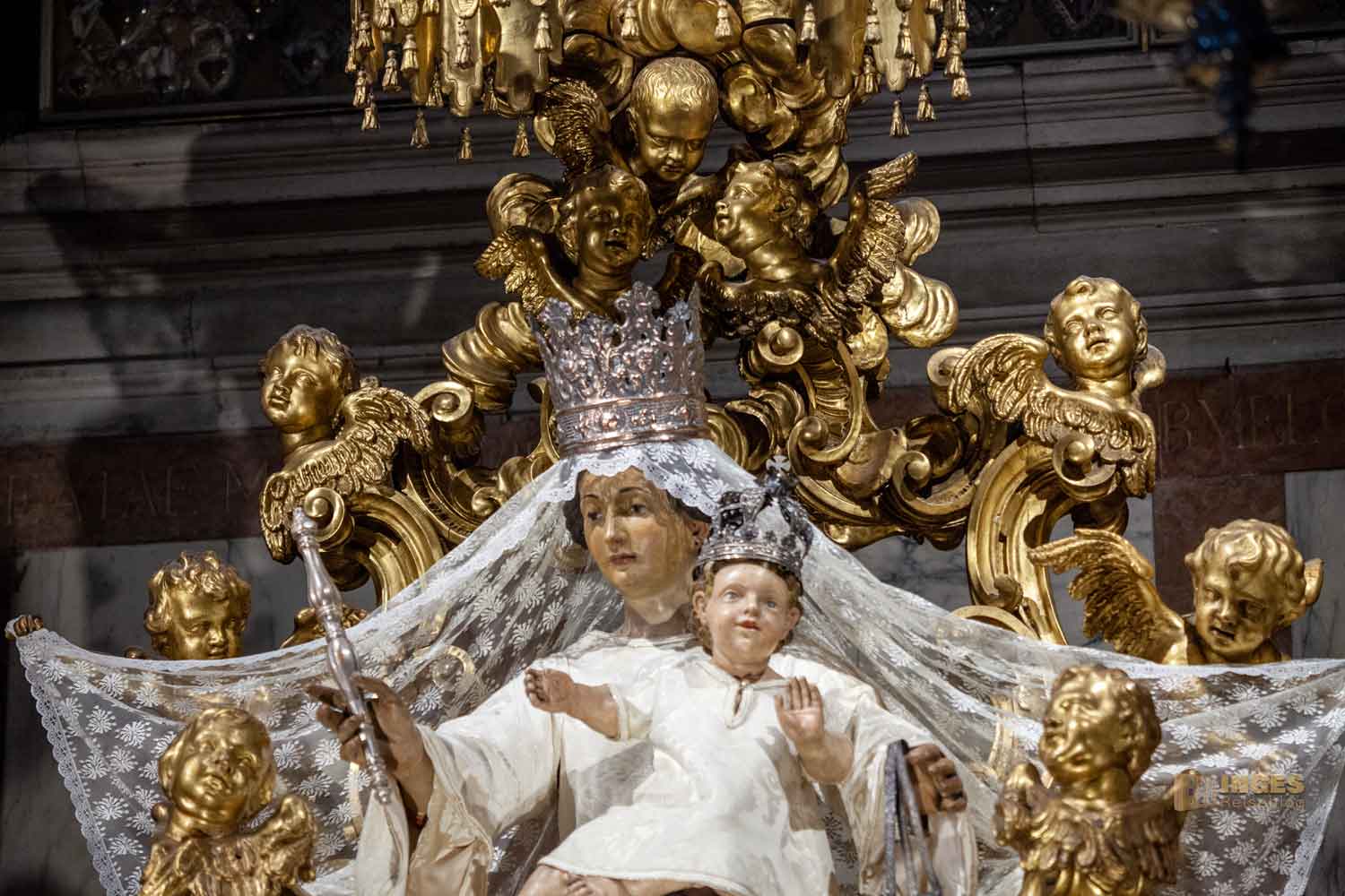 Ende des 17. Jahrhunderts wurde die Prozessionsfigur der Schutzpatronin des Ordens der Karmeliten gefertigt. Ein absoluter Blickfang in der Kirche mit dem goldenen Kranz der Engelschar um sich. Auf dem Karmel (Carmel), einem Gebirgszug in Nordisrael lebten die ersten Karmeliten als Einsiedler. Die dort von ihnen errichtete Kirchen wurde nach der Gottesmutter genannt, und eben nach dem Berg.