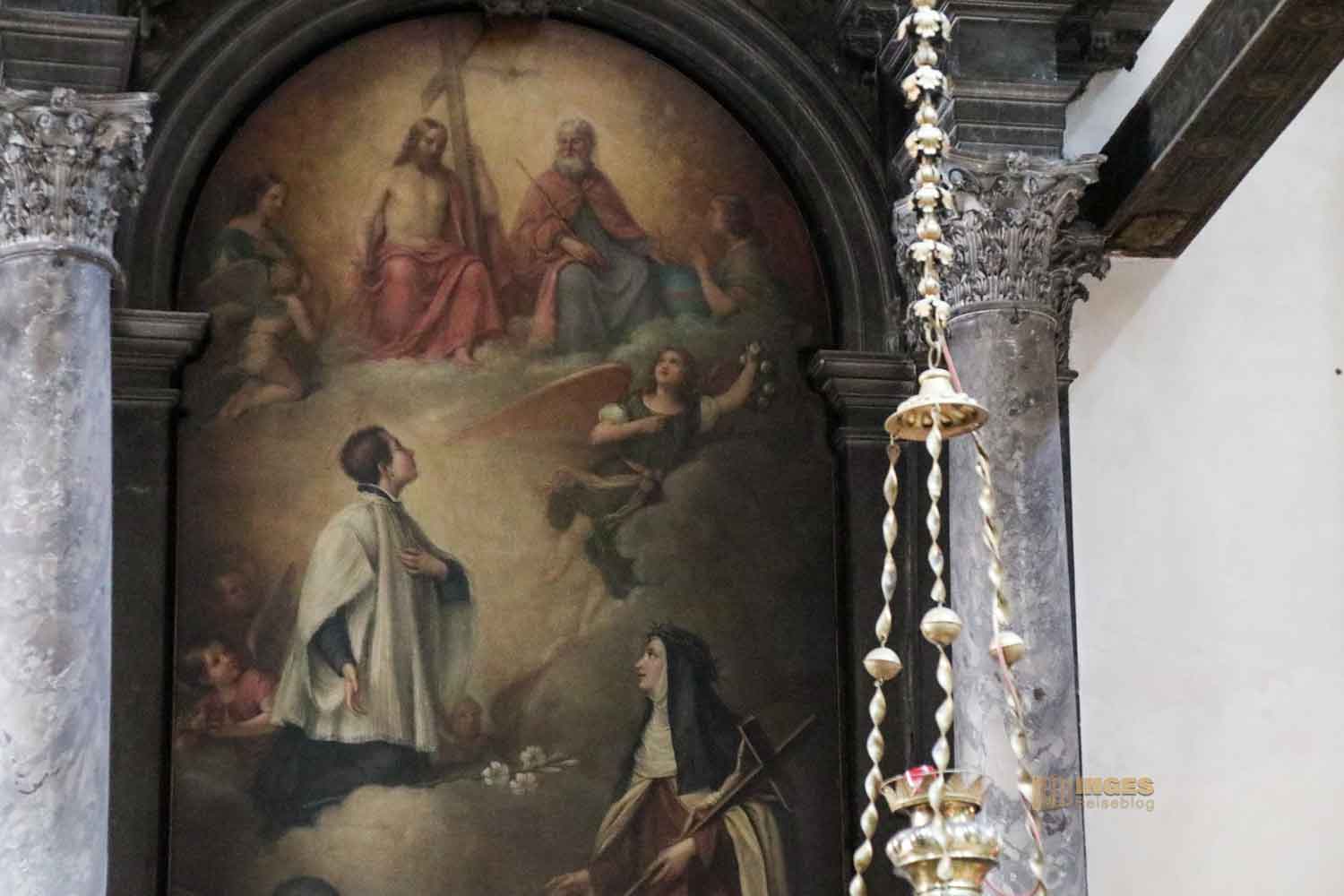 Ich persönlich finde ja die Innengestaltung der Kirche etwas ... hmm ... unübersichtlich. Nicht so wie meistens in anderen Kirchen, rechts und links Nischen mit Seitenaltären. Da wechselt sich ein Gemälde an der Wand mit einem kleinen oder auch größeren Altar, oder sonst einer Gestaltung. Das nächste
