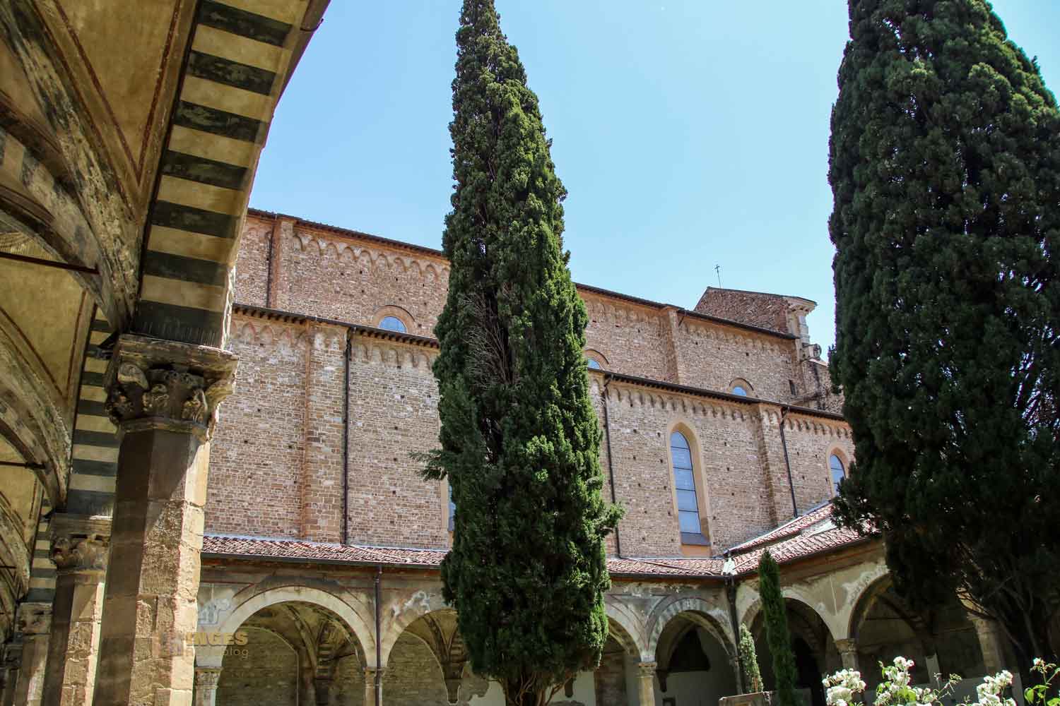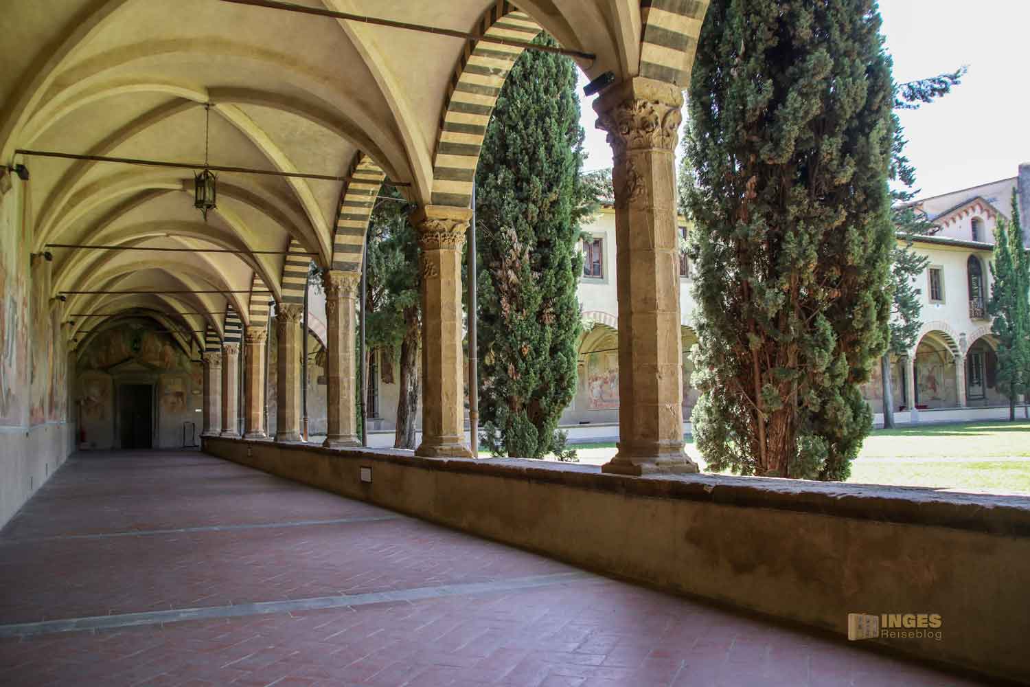 Kein Kloster ohne Kreuzgang, der die abgeschiedene Lebensform des Ordens symbolisiert. Der Kreuzgang gliedert sich meist in zwei Teile, zum einen der überdachte und gewölbte Bogengang der sich im Quadrat oder Rechteck um den Kirchen- und Klosterkomplex zieht. In der Mitte der Kreuzganggarten, der für den Orden auch so etwas wie ein Paradiesgarten darstellt. In sehr vielen Kirchen mit ehemaligen Klöstern sieht man in Florenz einen Kreuzgang dazu, die allesamt sehr sehenswert sind.